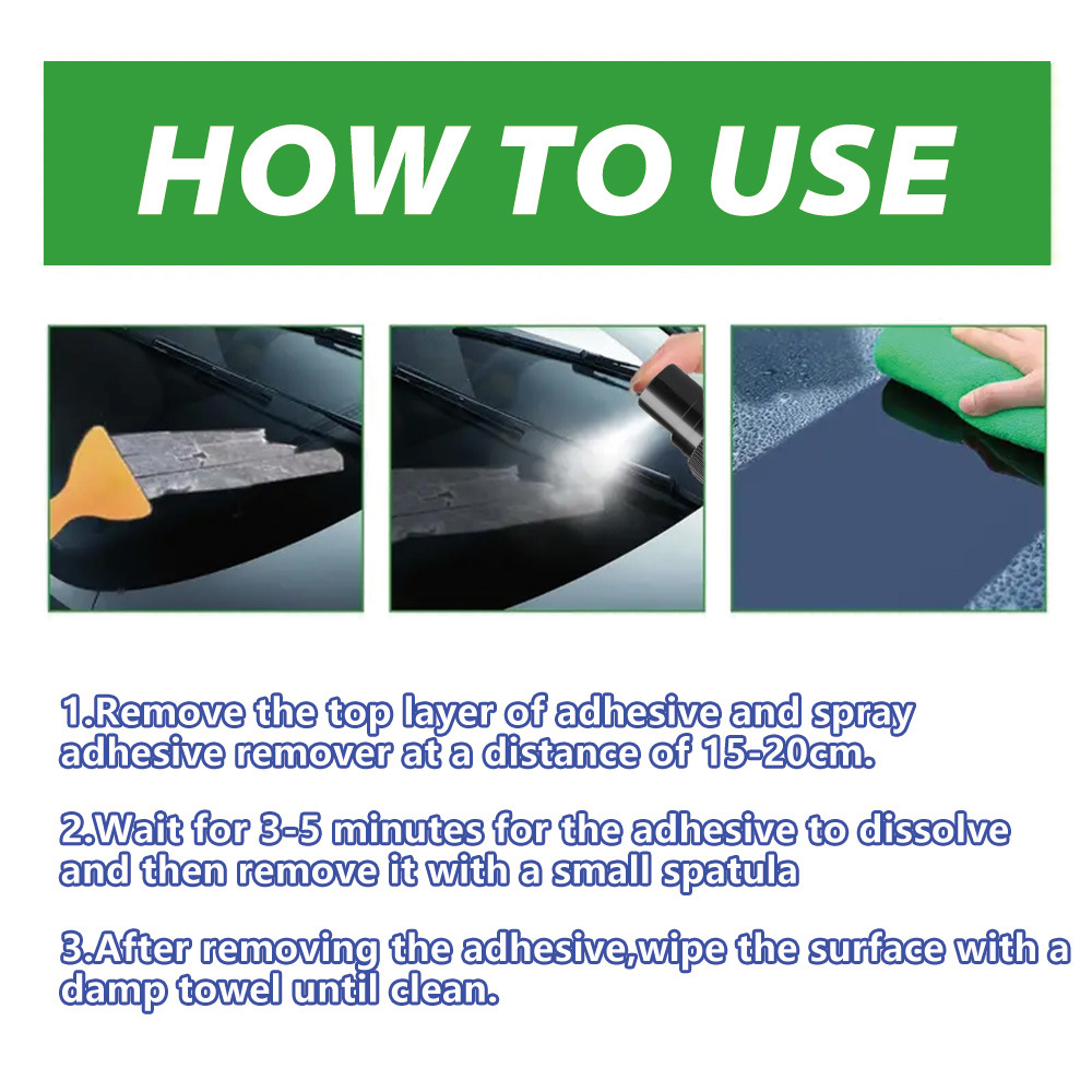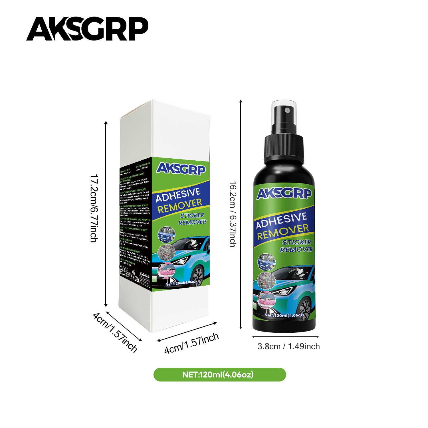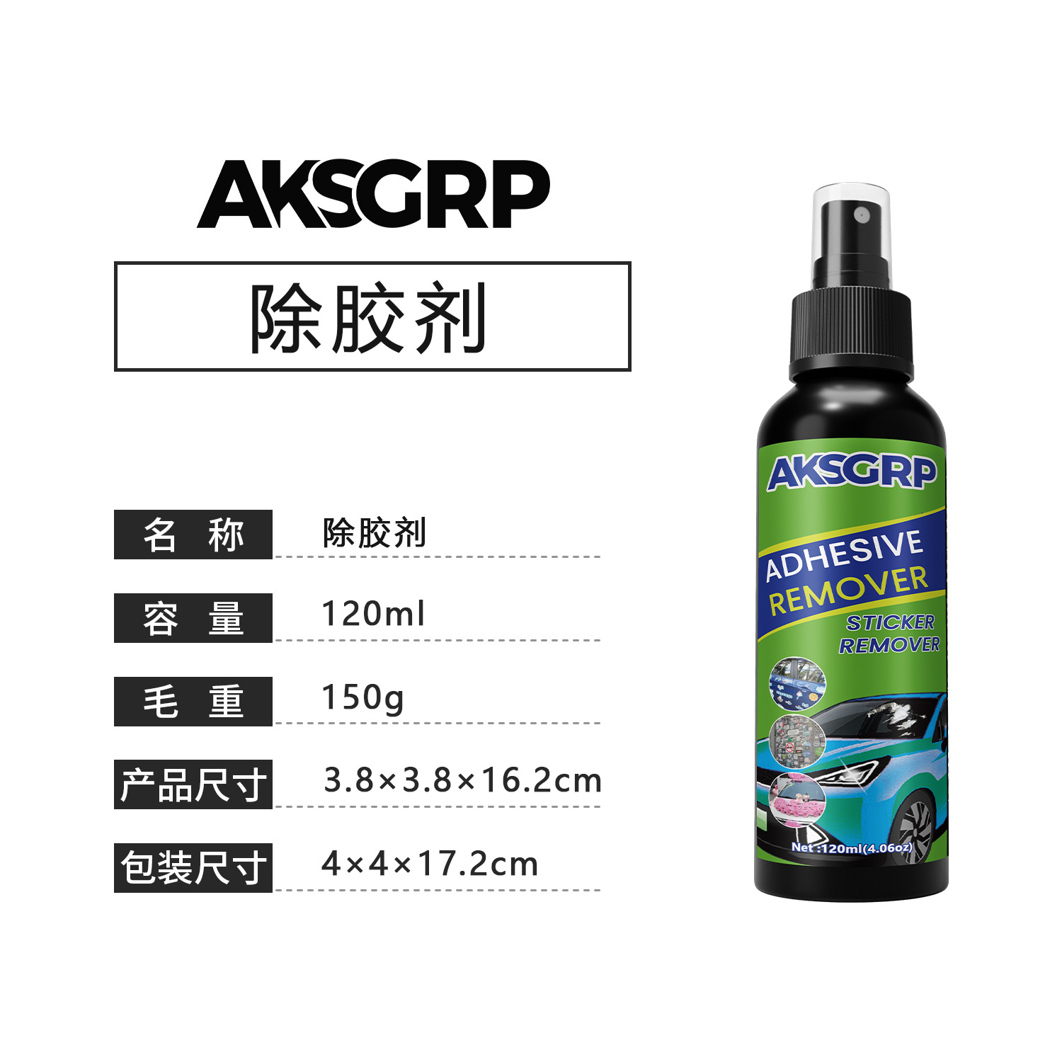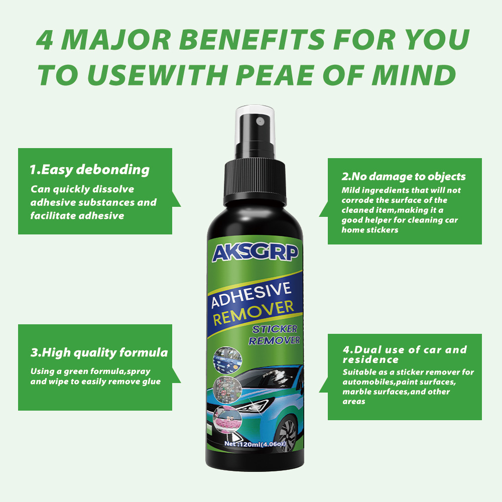 A product from the AKSGRP Multi-Purpose Cleaning Series, it has a capacity of 120ml (4.06oz) and a gross weight of 150g. The product dimensions are 3.8×3.8×16.2cm, and the packaging dimensions are 4×4×17.2cm. Its core advantages are easy debonding and no damage to objects. It uses an eco-friendly formula that quickly dissolves adhesives, and can remove car adhesive, household glue, and tar, suitable for car paint, marble surfaces, etc. The usage has three steps: peel off the top layer of the adhesive and spray the remover 15-20cm away; let it sit for 3-5 minutes until the adhesive dissolves, then scrape it off with a small spatula; finally wipe the surface clean with a damp towel.