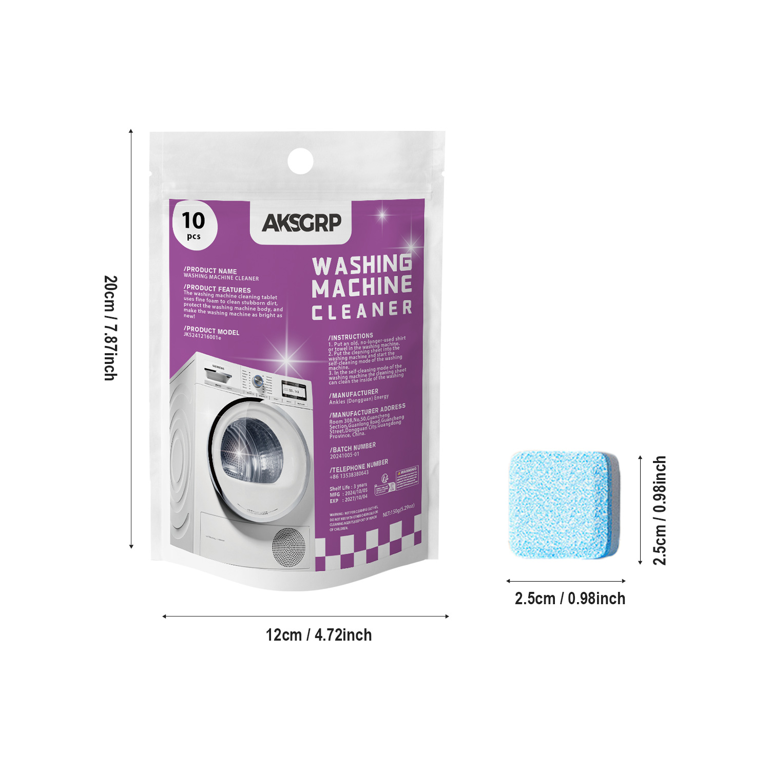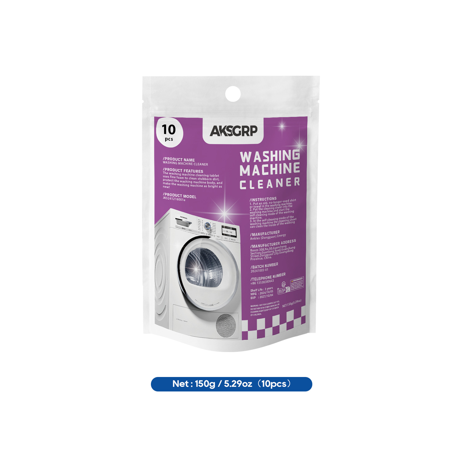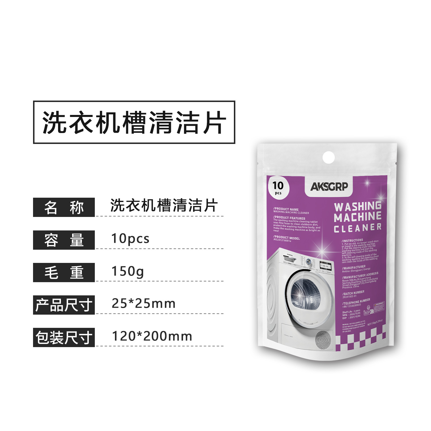 A product from the AKSGRP Home Appliance Cleaning Series, 10 pieces total. Single tablet size is 25×25mm, total net weight 150g (5.29oz), packaging size 120×200mm. Core functions: dirt removal and disinfection, cleaning the washer tank via effervescence to eliminate odors and solve unclean clothes issues. Suitable for drum automatic washers. 3-step use: put an old shirt/towel in the washer, add the tablet and start self-cleaning mode, which thoroughly cleans the interior.