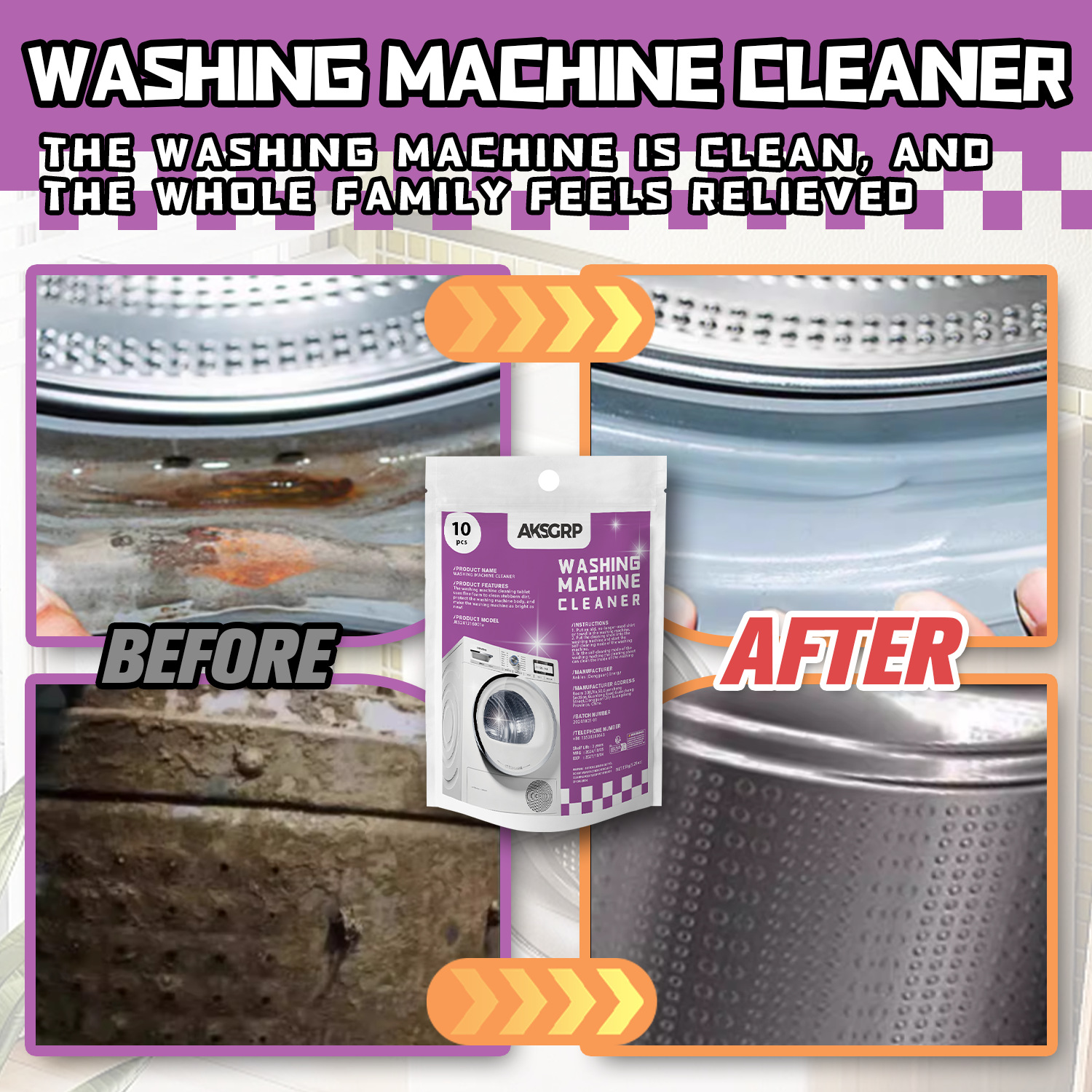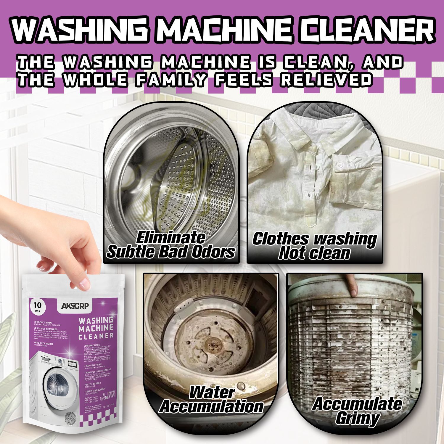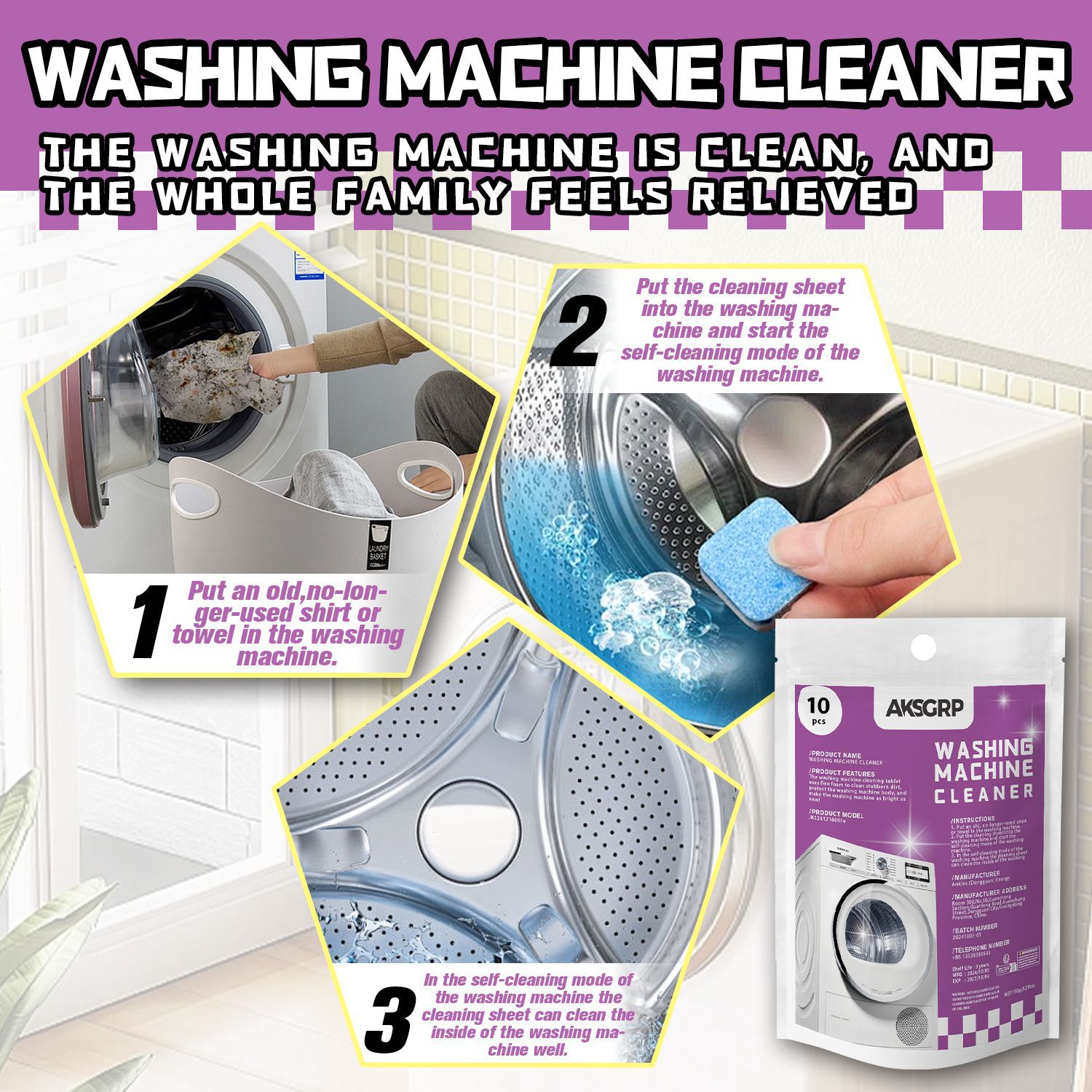 A product from the AKSGRP Home Appliance Cleaning Series, 10 pieces total. Single tablet size is 25×25mm, total net weight 150g (5.29oz), packaging size 120×200mm. Core functions: dirt removal and disinfection, cleaning the washer tank via effervescence to eliminate odors and solve unclean clothes issues. Suitable for drum automatic washers. 3-step use: put an old shirt/towel in the washer, add the tablet and start self-cleaning mode, which thoroughly cleans the interior.