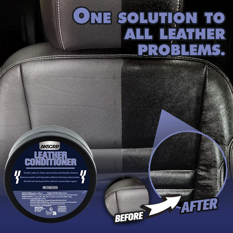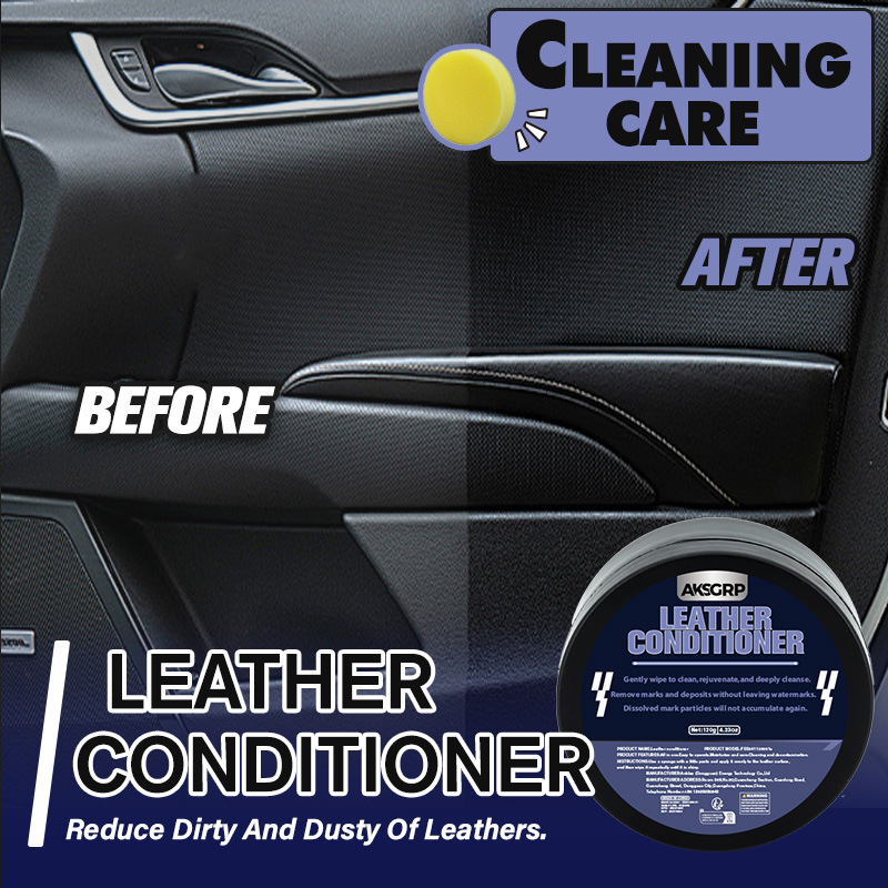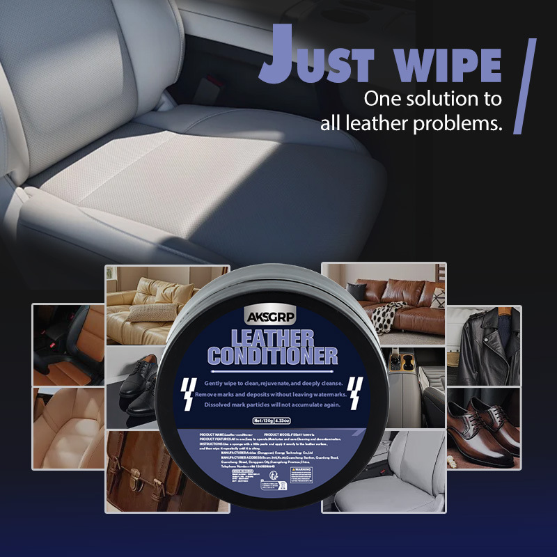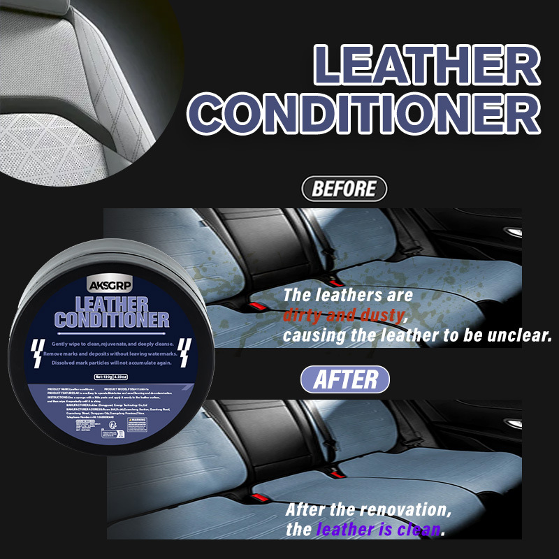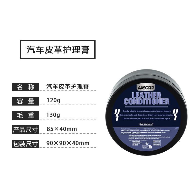 A product from both AKSGRP Home Appliance Cleaning and Leather Care Series, with a net weight of 120g (4.23oz). Key advantages: water-free and multi-purpose, gently wiping to clean and rejuvenate leather, deeply removing marks and deposits without leaving watermarks, and dissolved stain particles will not accumulate again. Suitable for car leather, as well as leather sofas and leather goods. 4-step use: prepare the leather item to be cleaned, dip a sponge in the cream and wipe in a circular motion, let it sit for a few minutes to fully absorb, finally wipe off residual dirt with a cotton cloth; the leather can be restored to cleanliness after cleaning.