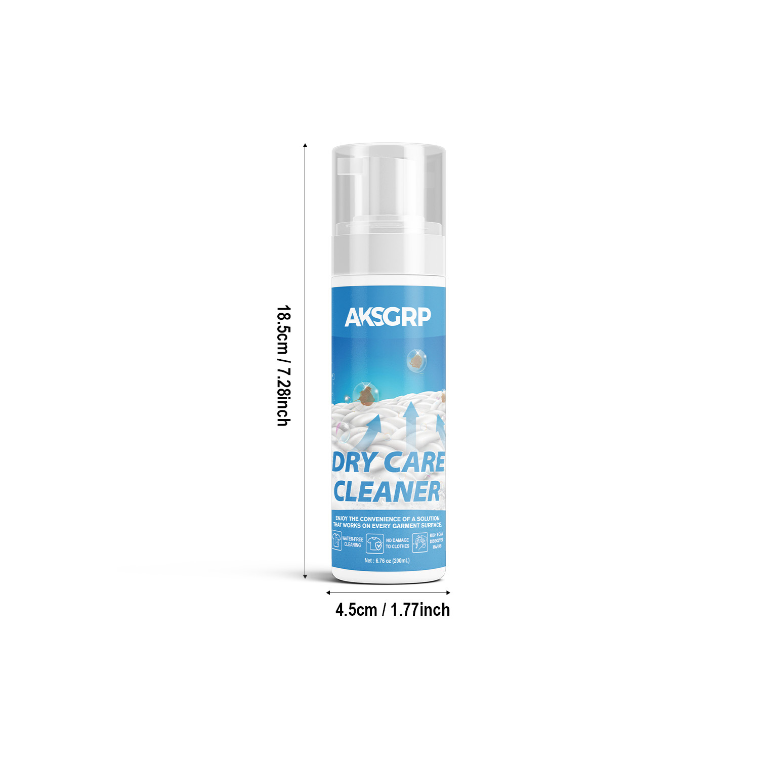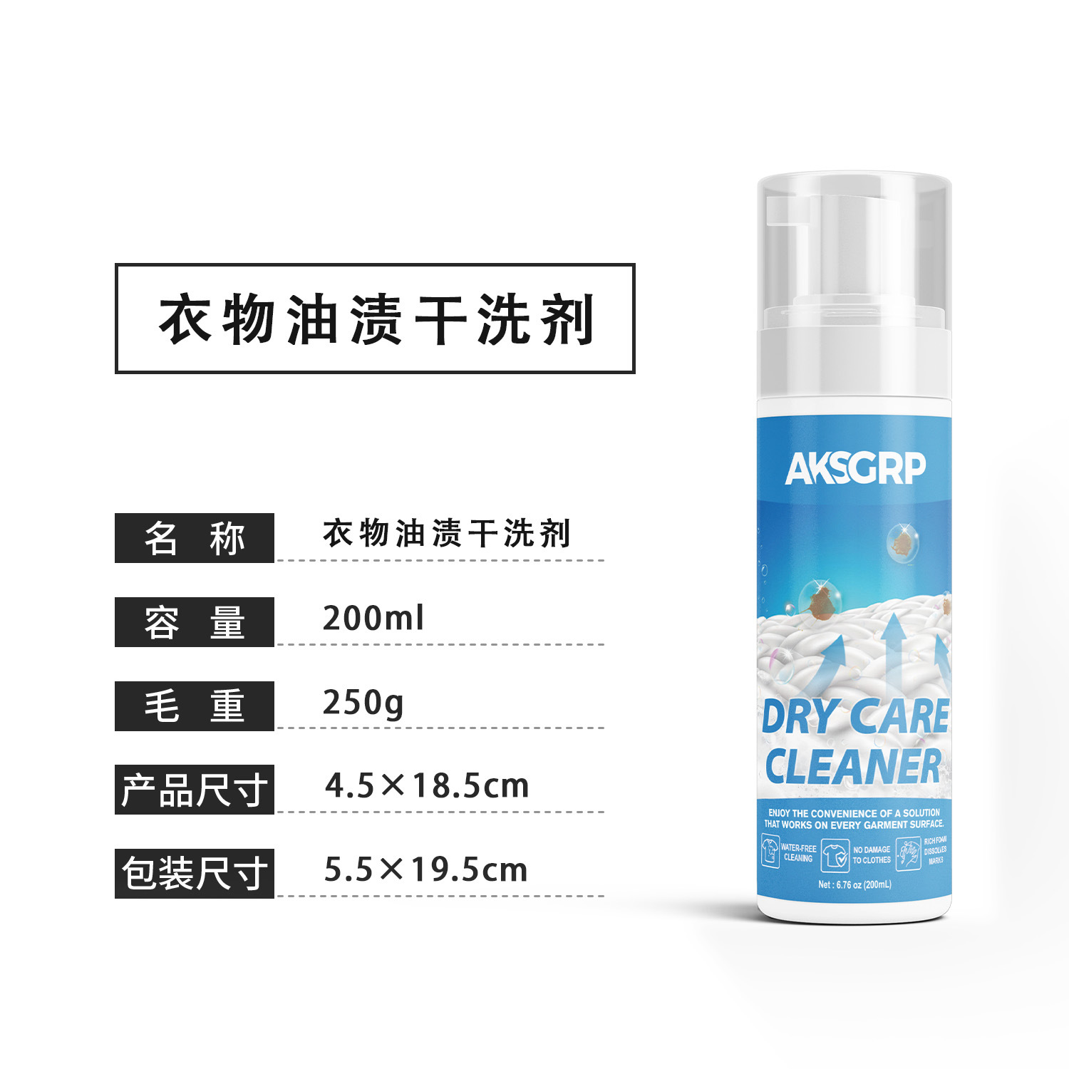 A product from the AKSGRP Laundry Cleaning Series, available in 200ml (6.76oz) and 250g. Product size is 4.5×18.5cm, packaging size is 5.5×19.5cm. Key advantages: water-free and wide application range. It can powerfully remove various stains such as oil stains, seasoning stains, tomato stains, wine stains, lipstick marks and pen marks. Its residue is easy to degrade, and it is rich in bubbles, suitable for all kinds of garment surfaces.