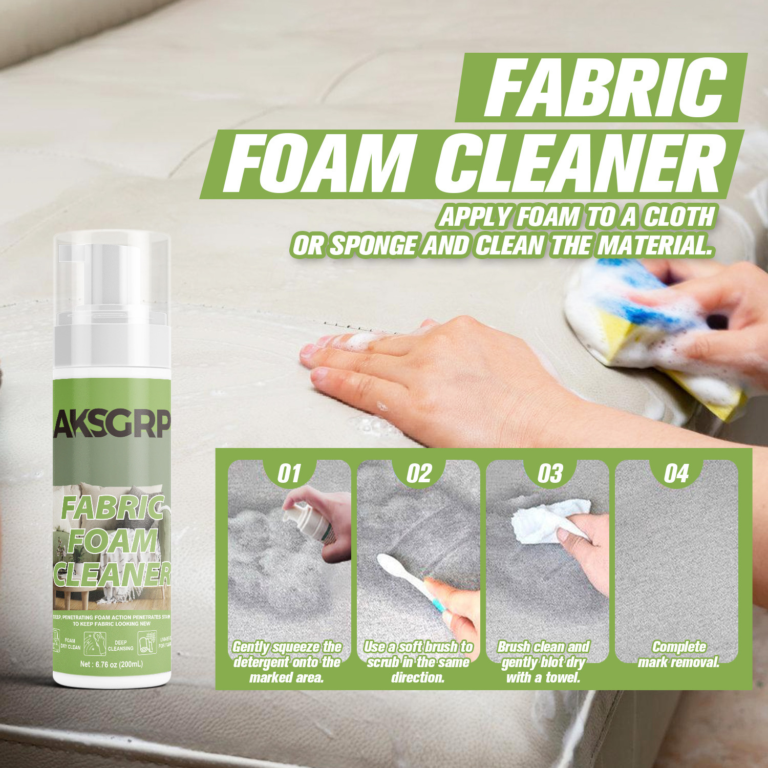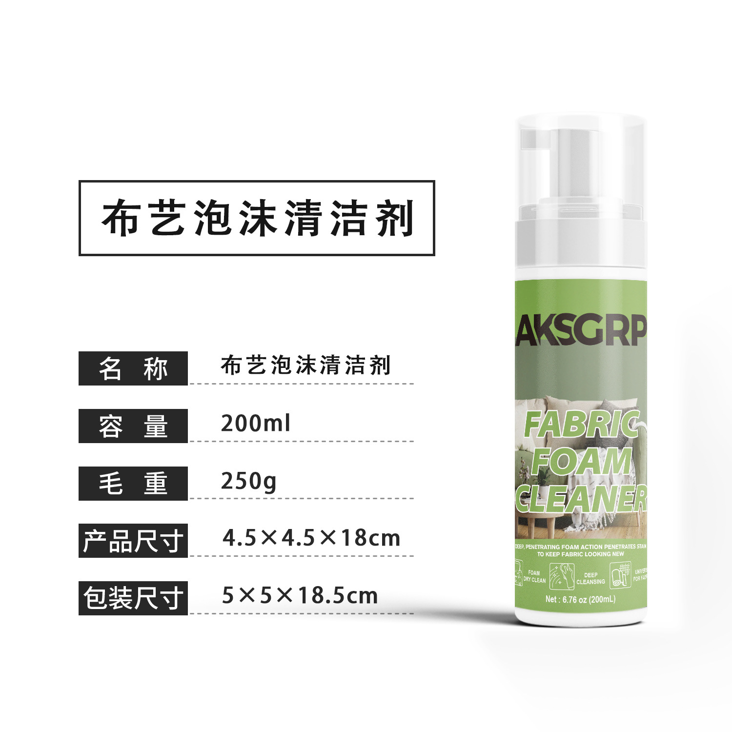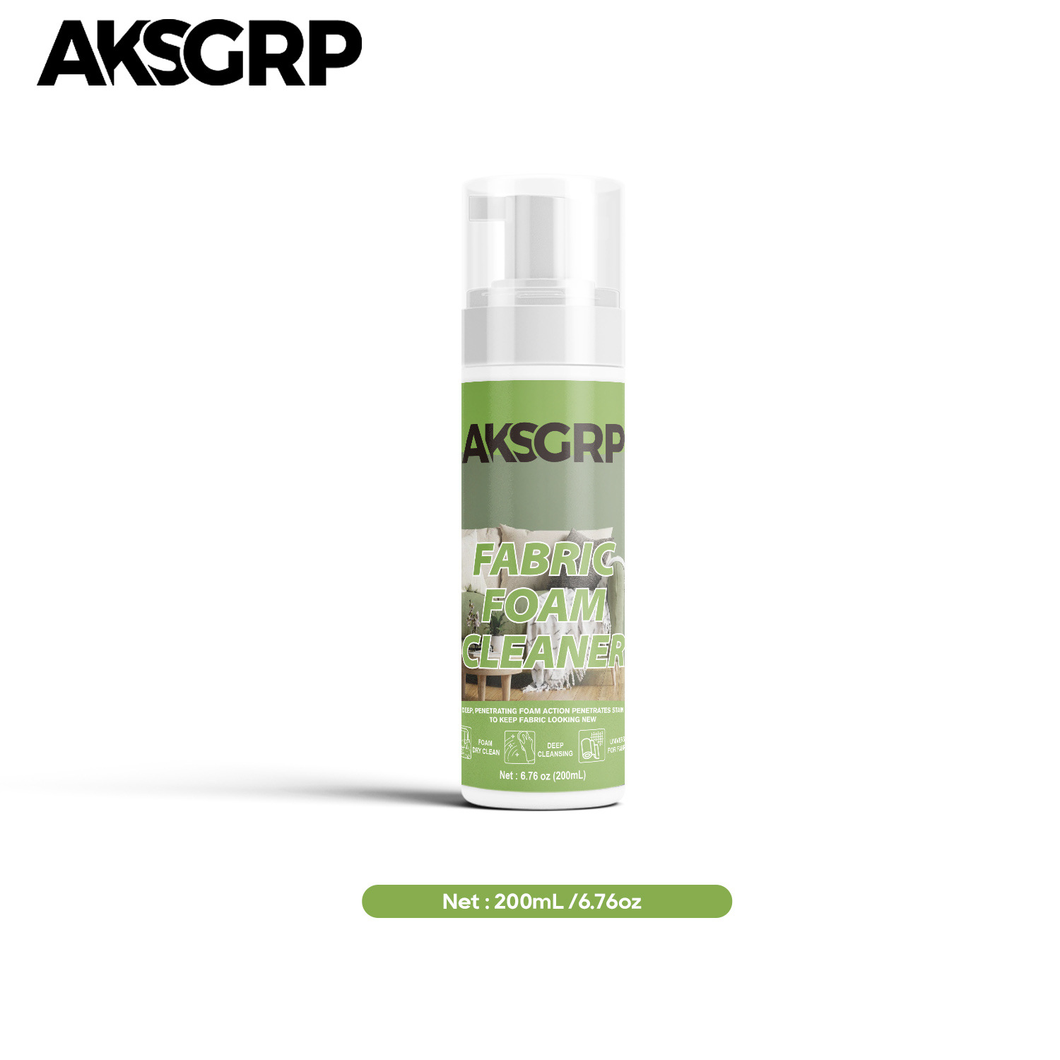 A product from the AKSGRP Furniture Cleaning Series, it has a capacity of 200ml (6.76oz) and a gross weight of 250g. The product dimensions are 4.5×4.5×18cm, and the packaging dimensions are 5×5×18.5cm. Its core feature is no-wash dry cleaning—deep penetrating foam action penetrates stains, which can clean fabric materials such as carpets and sofas, remove stubborn stains, and keep the fabric looking like new. The usage is simple: apply the foam to a cloth or sponge, then wipe the fabric surface, suitable for daily fabric furniture cleaning scenarios.