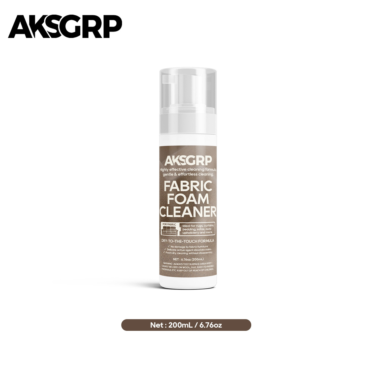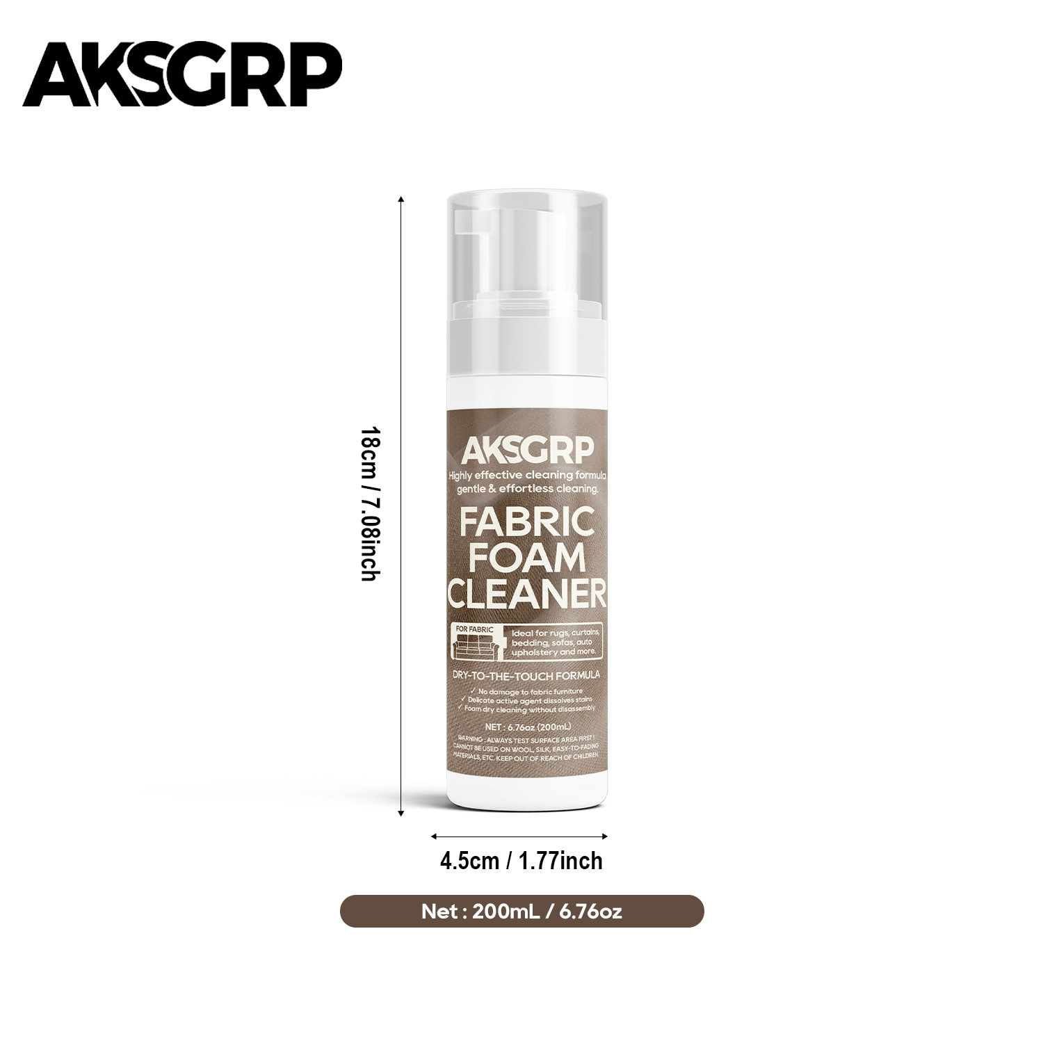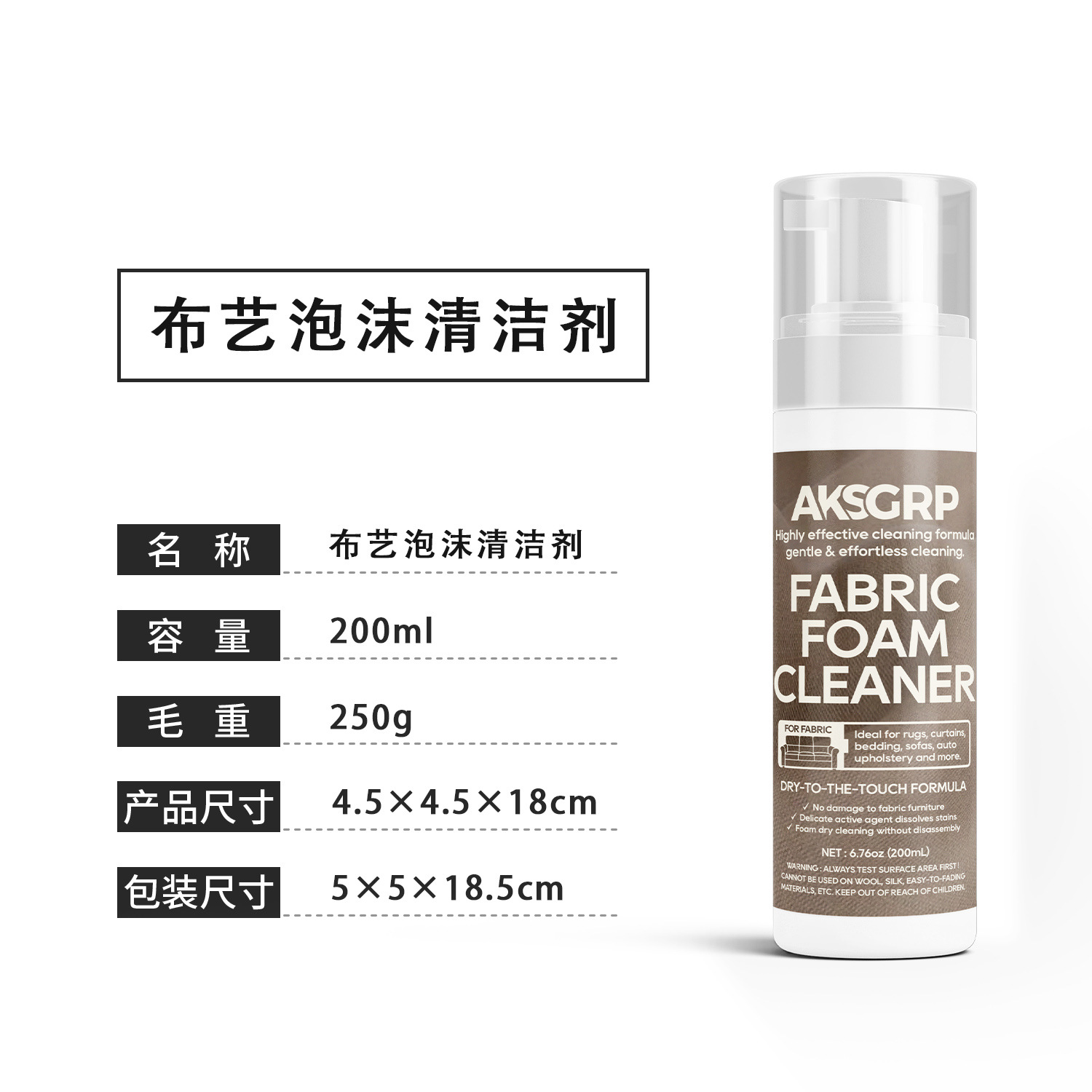 A product from the AKSGRP Furniture Cleaning Series, it has a capacity of 200ml (6.76oz) and a gross weight of 250g. The product dimensions are 4.5×4.5×18cm, and the packaging dimensions are 5×5×18.5cm. Its core advantages are foam dry cleaning and no disassembly—containing mild active agents to dissolve stains without damaging fabric furniture, making cleaning gentle and effortless. It has a wide application range, suitable for cleaning sofas, curtains, carpets, stuffed toys, car seat mattresses, etc. Test a small area on the fabric surface first before use.