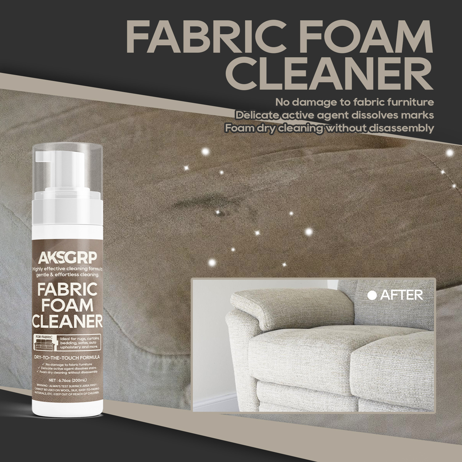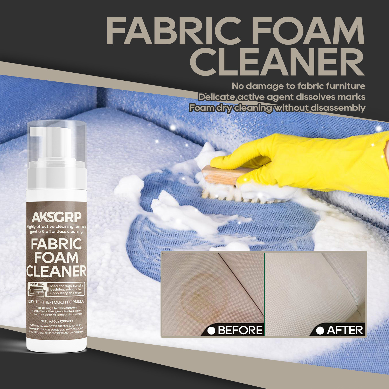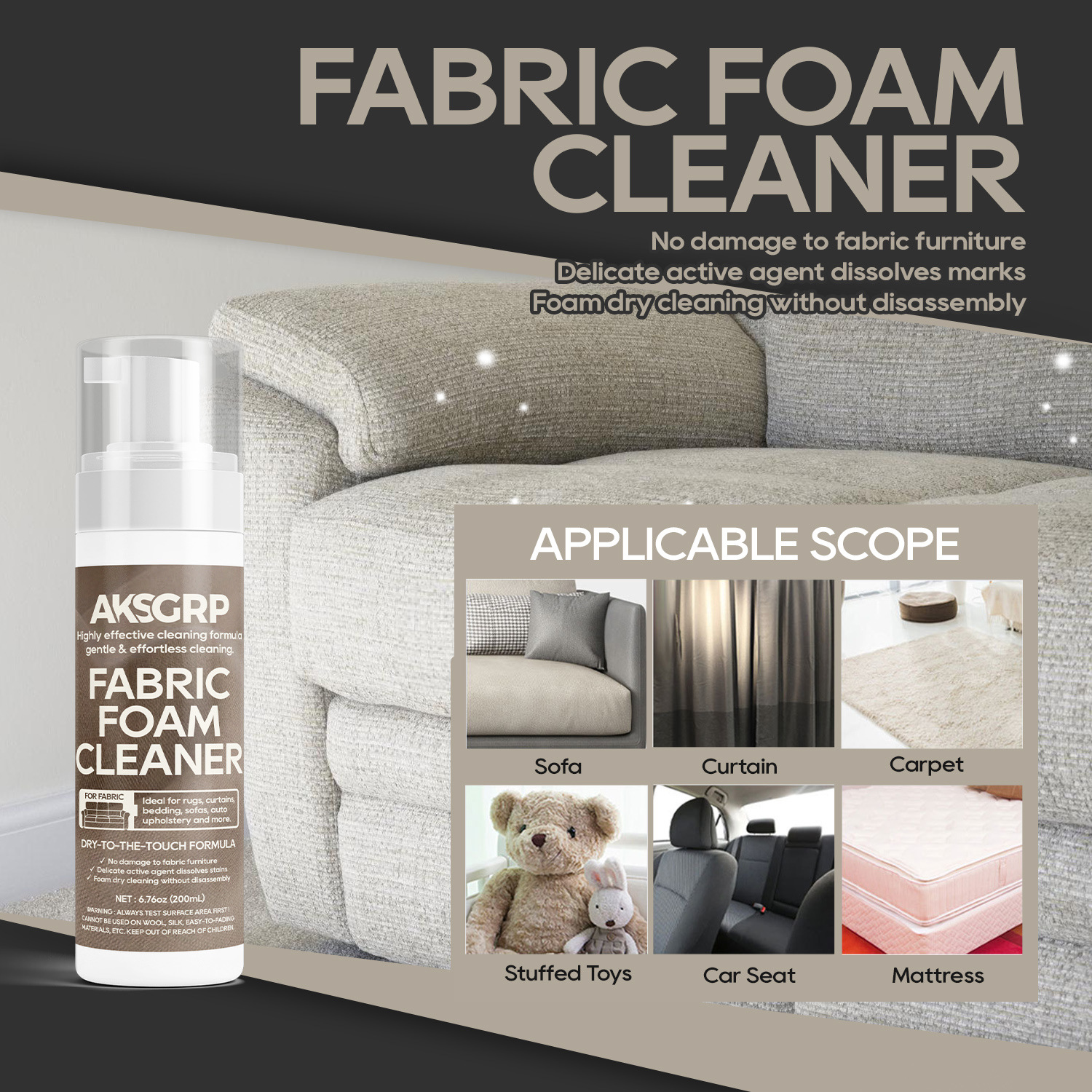 A product from the AKSGRP Furniture Cleaning Series, it has a capacity of 200ml (6.76oz) and a gross weight of 250g. The product dimensions are 4.5×4.5×18cm, and the packaging dimensions are 5×5×18.5cm. Its core advantages are foam dry cleaning and no disassembly—containing mild active agents to dissolve stains without damaging fabric furniture, making cleaning gentle and effortless. It has a wide application range, suitable for cleaning sofas, curtains, carpets, stuffed toys, car seat mattresses, etc. Test a small area on the fabric surface first before use.