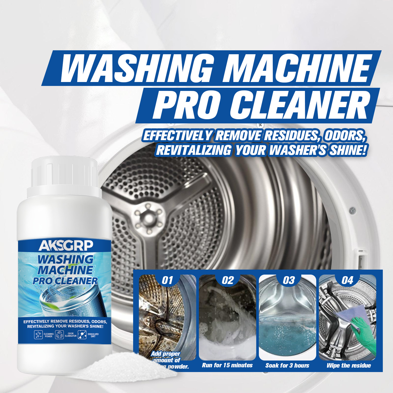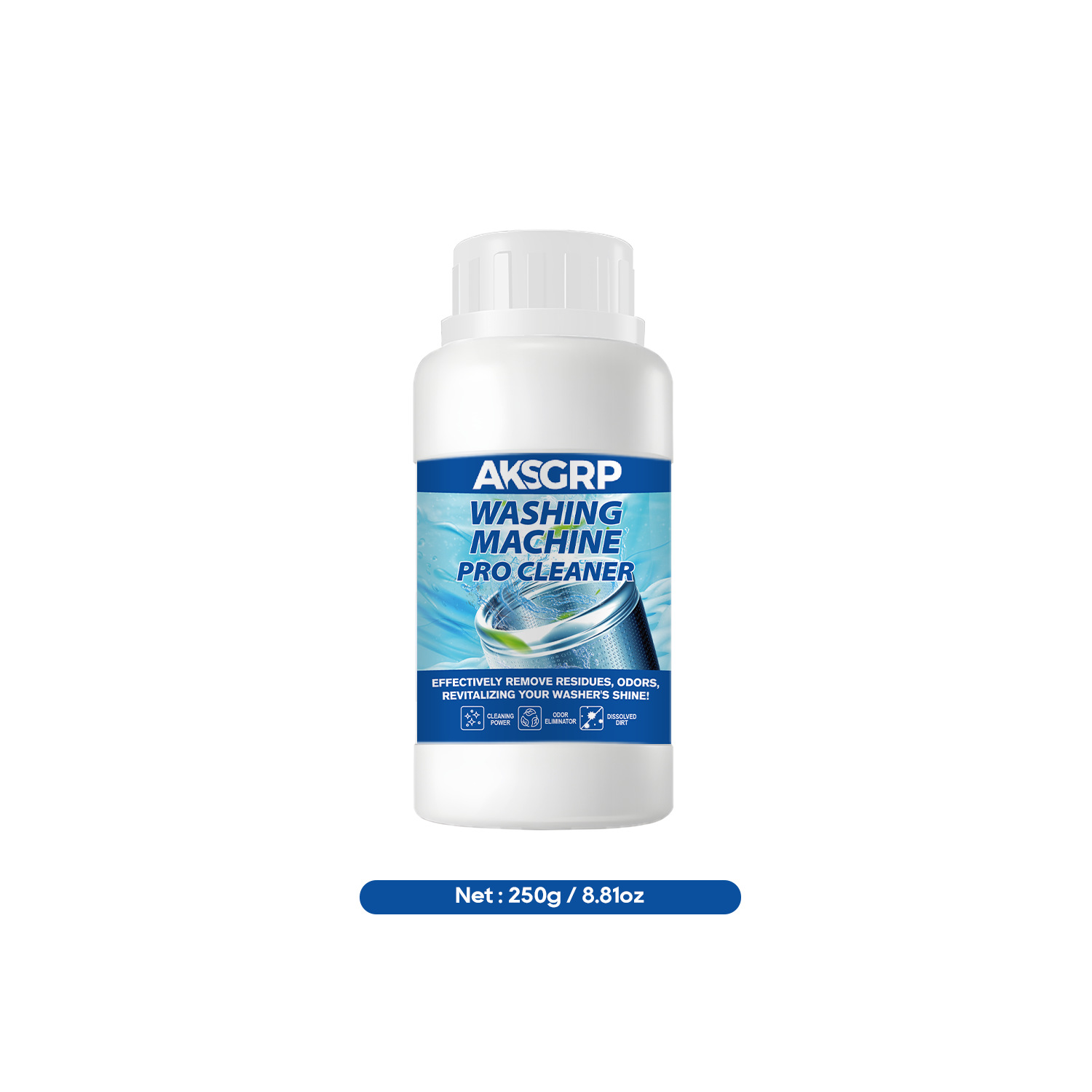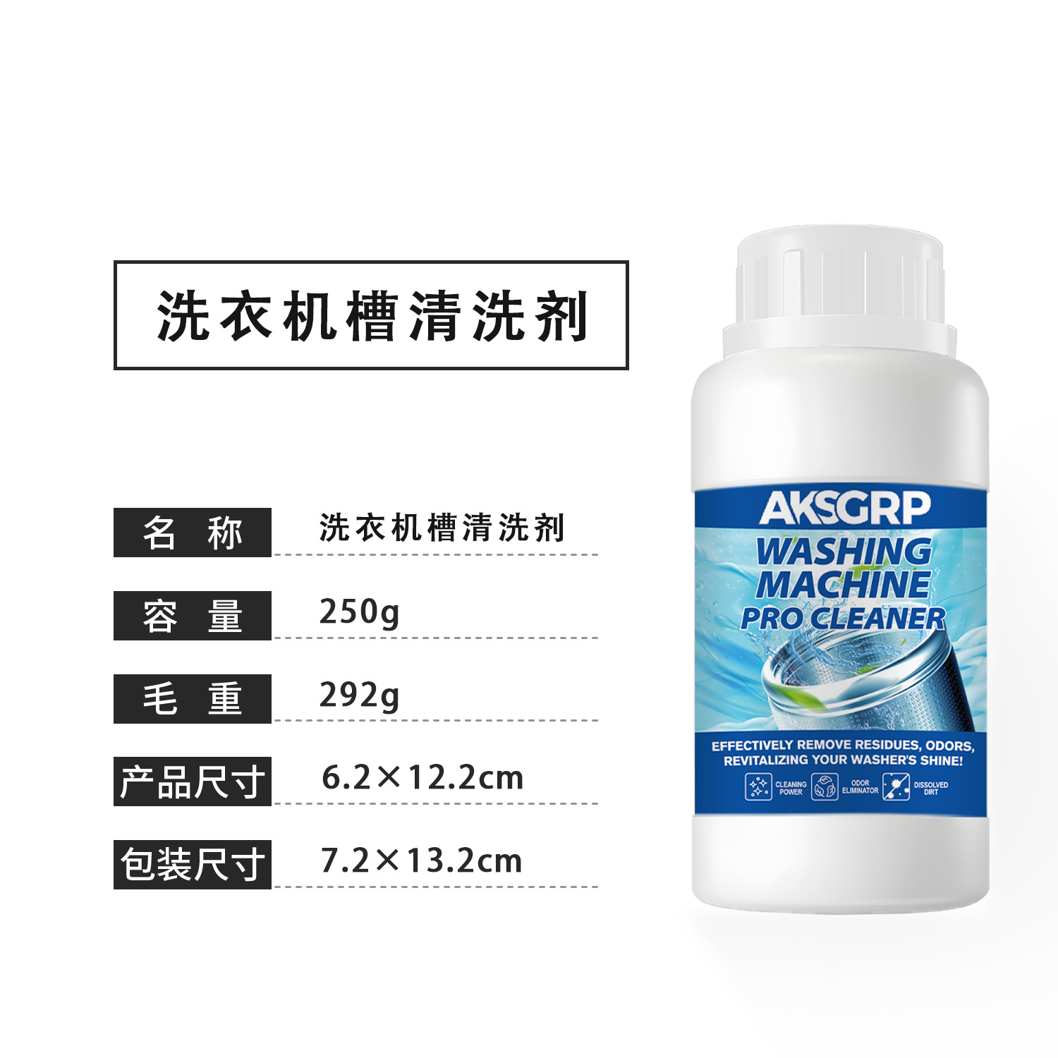 A product from the AKSGRP Home Appliance Cleaning Series, with 250g capacity, 292g gross weight, product size 6.2×12.2cm, packaging size 7.2×13.2cm. Core functions: removing residues and odors, cleaning the inner drum. It dissolves dirt, solves the problem of unclean clothes caused by dirt accumulation in the washer, and restores the washer’s cleanliness. 4-step use: add proper amount of cleaner, run for 15 minutes, soak for 3 hours, then wipe residues.