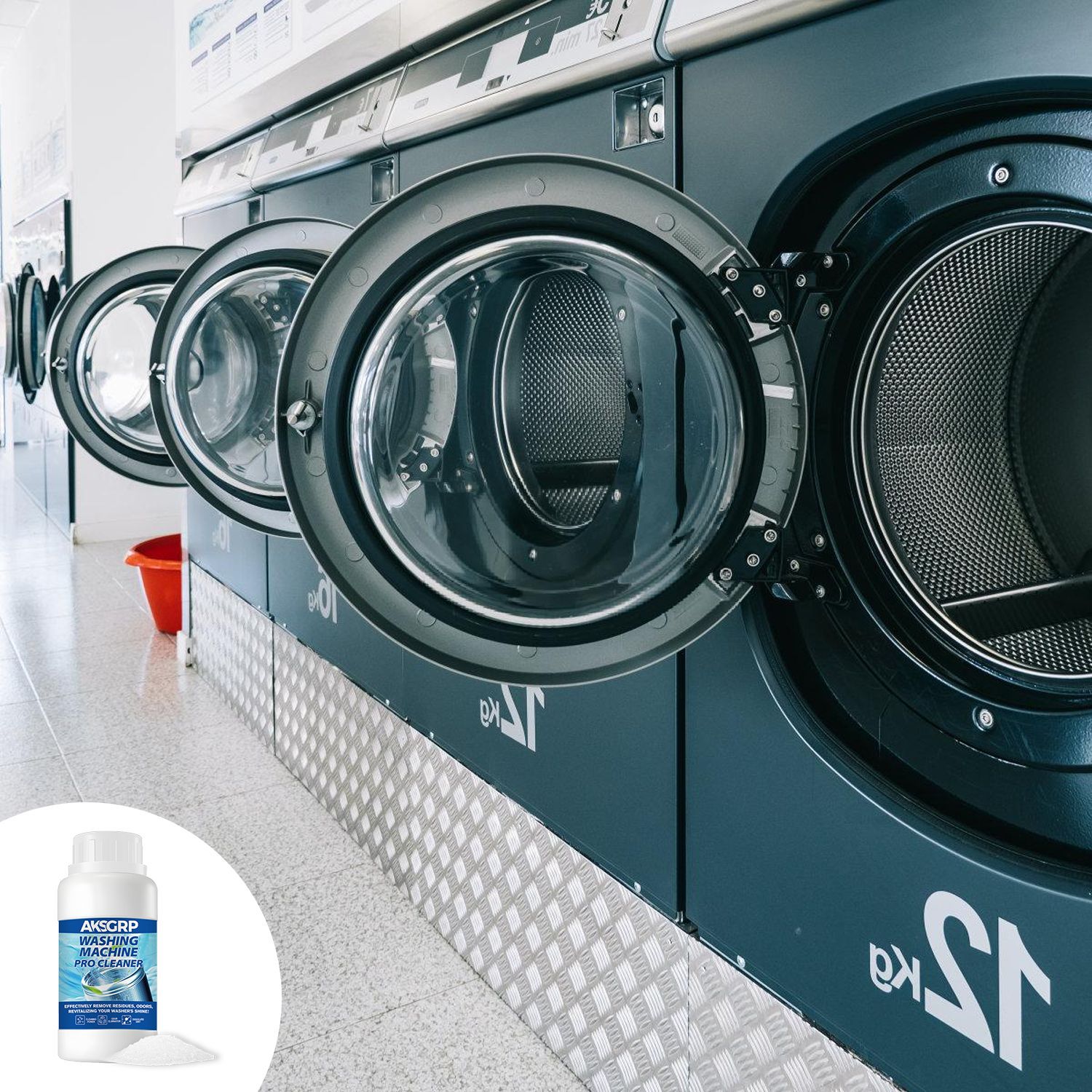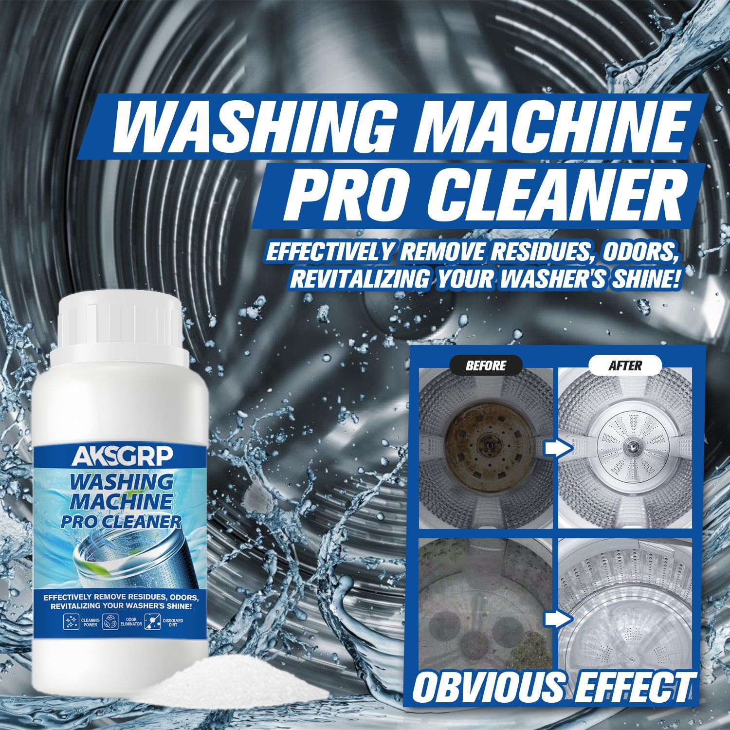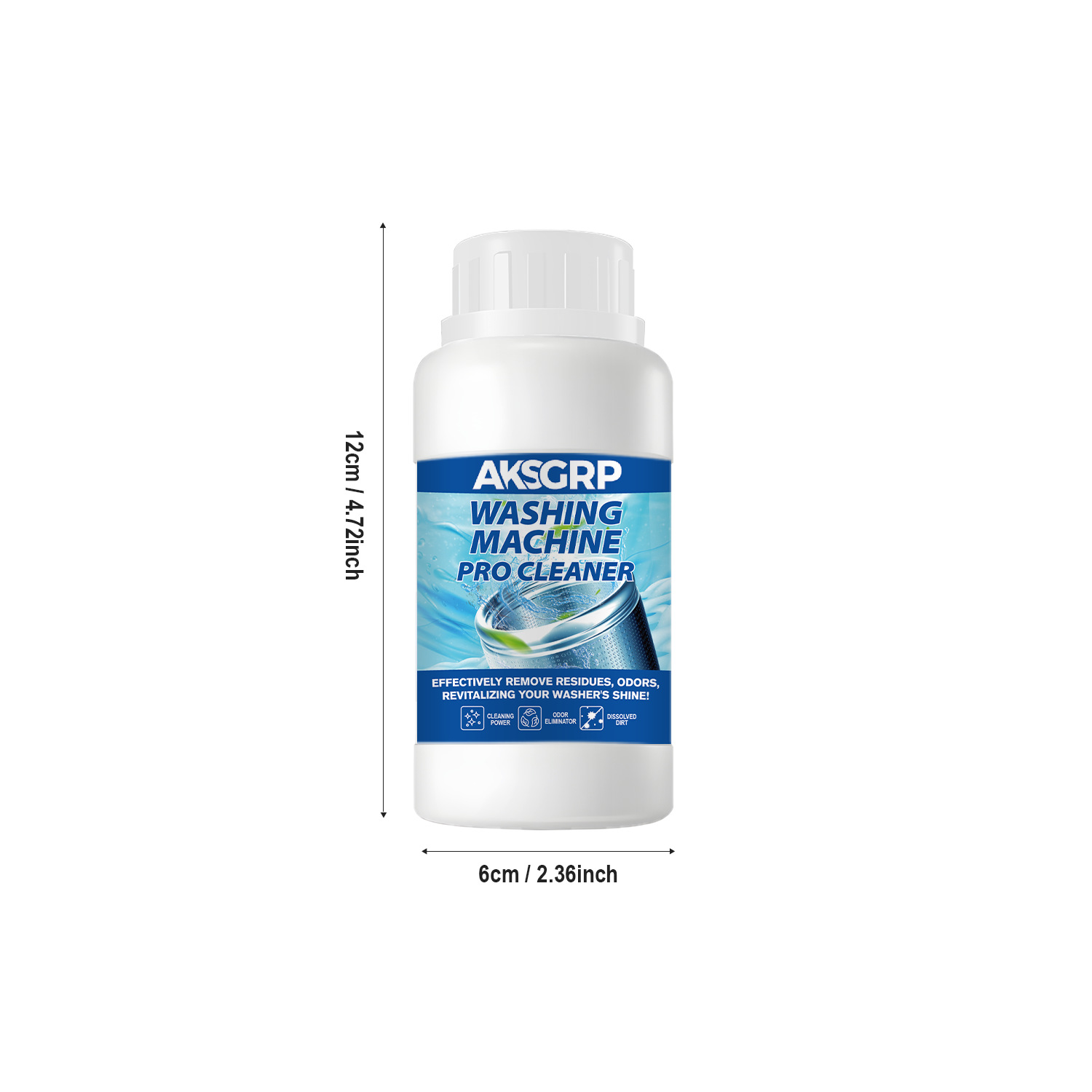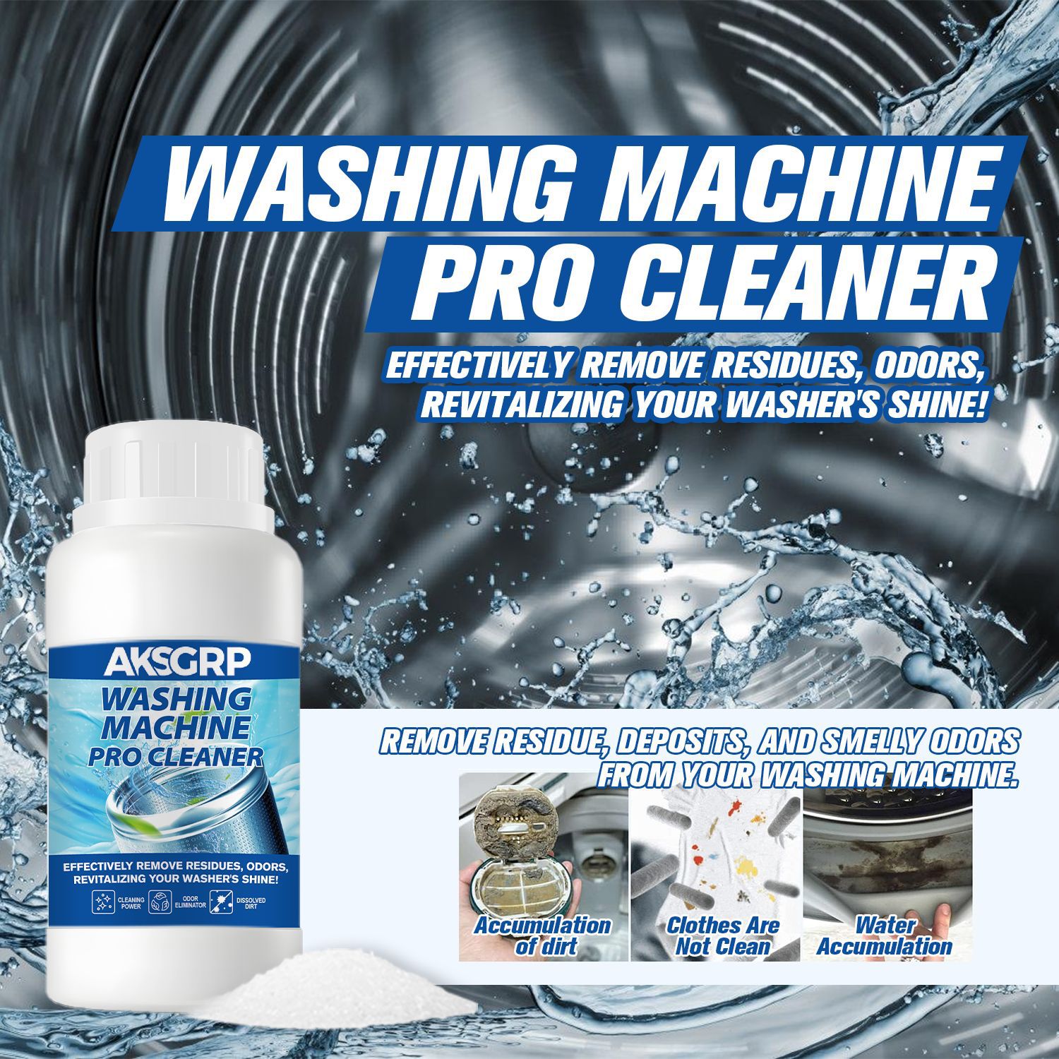 A product from the AKSGRP Home Appliance Cleaning Series, with 250g capacity, 292g gross weight, product size 6.2×12.2cm, packaging size 7.2×13.2cm. Core functions: removing residues and odors, cleaning the inner drum. It dissolves dirt, solves the problem of unclean clothes caused by dirt accumulation in the washer, and restores the washer’s cleanliness. 4-step use: add proper amount of cleaner, run for 15 minutes, soak for 3 hours, then wipe residues.