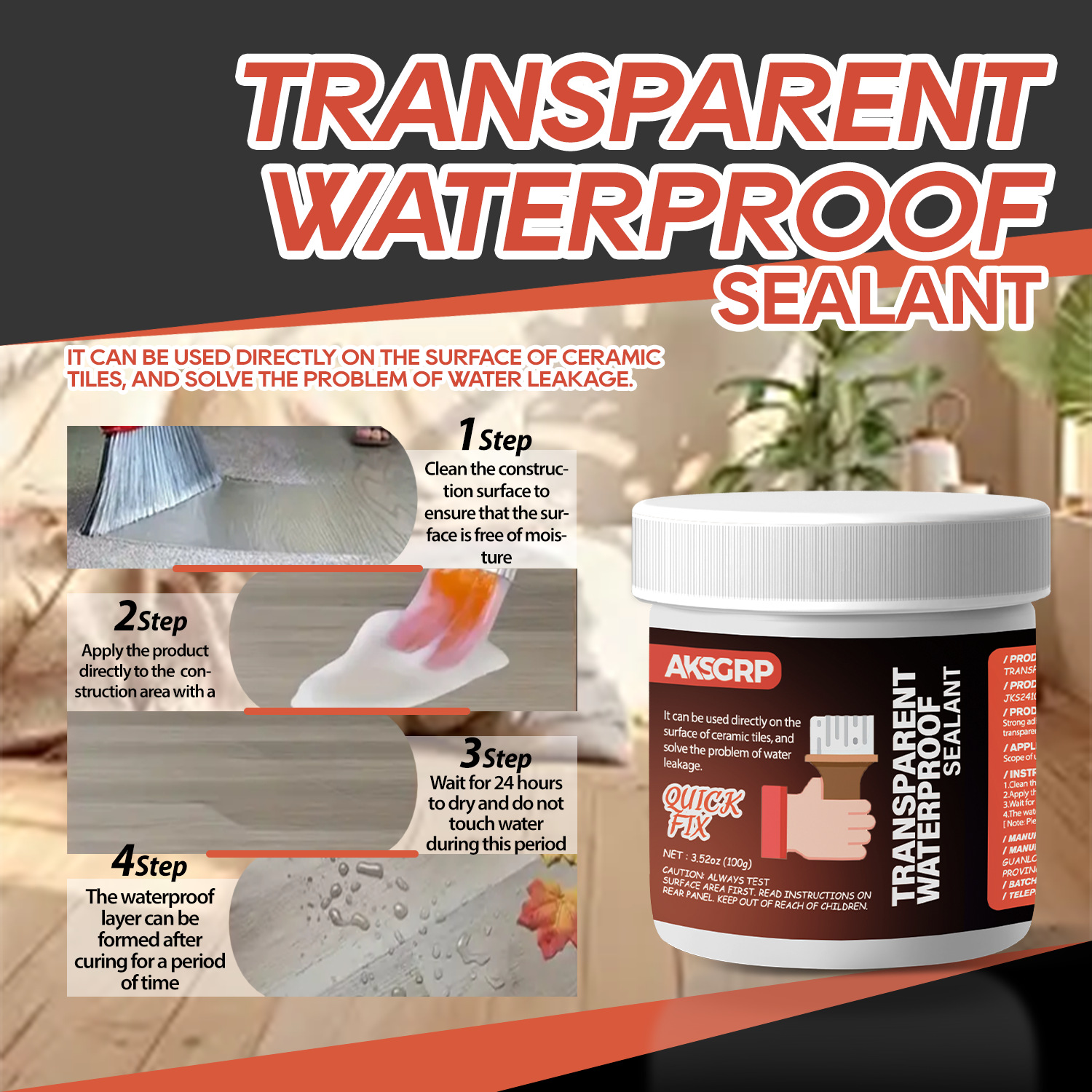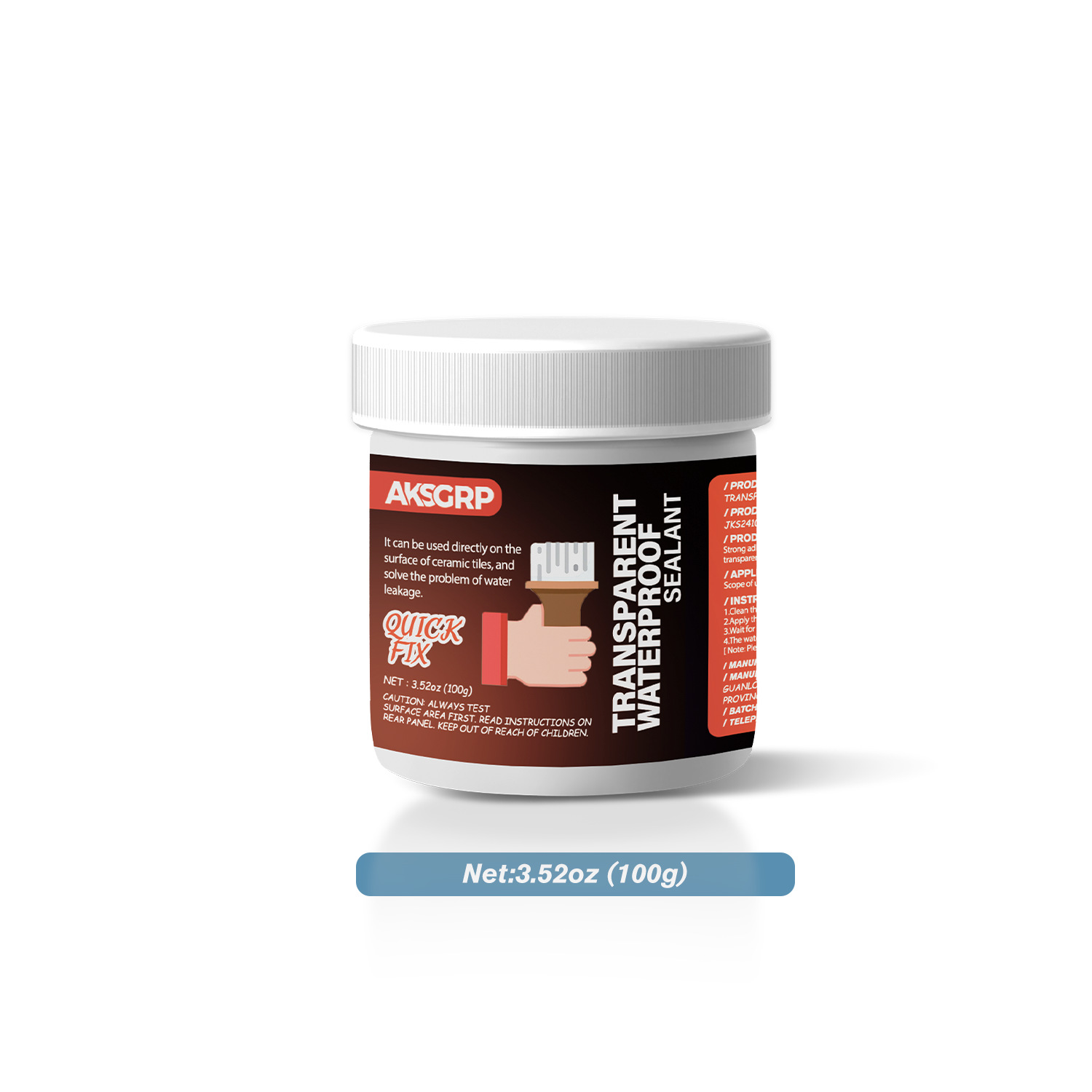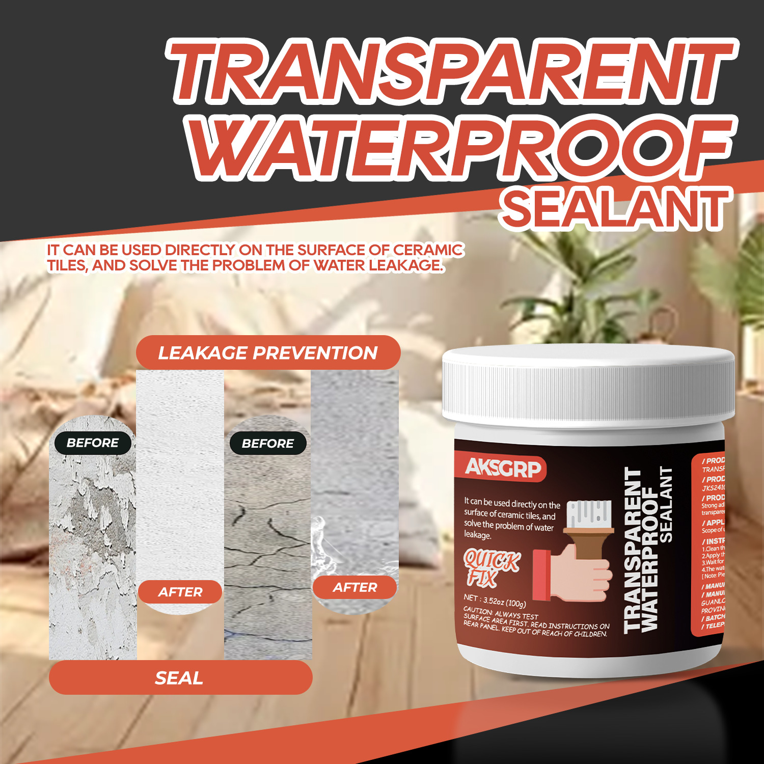 A product from the AKSGRP Multi-Purpose Repair Series (also belonging to Tile Repair Series and Wall Repair Series), with a specification of 100g (3.52oz). Its core function is waterproofing and leak repair—it can be directly used on ceramic tile surfaces to solve water leakage problems, suitable for kitchens, bathrooms, exterior walls, and can also be used as a roof leak-stop coating. The usage has two steps: first clean the construction surface to ensure no moisture; then use a tool to directly apply the product to the construction area.