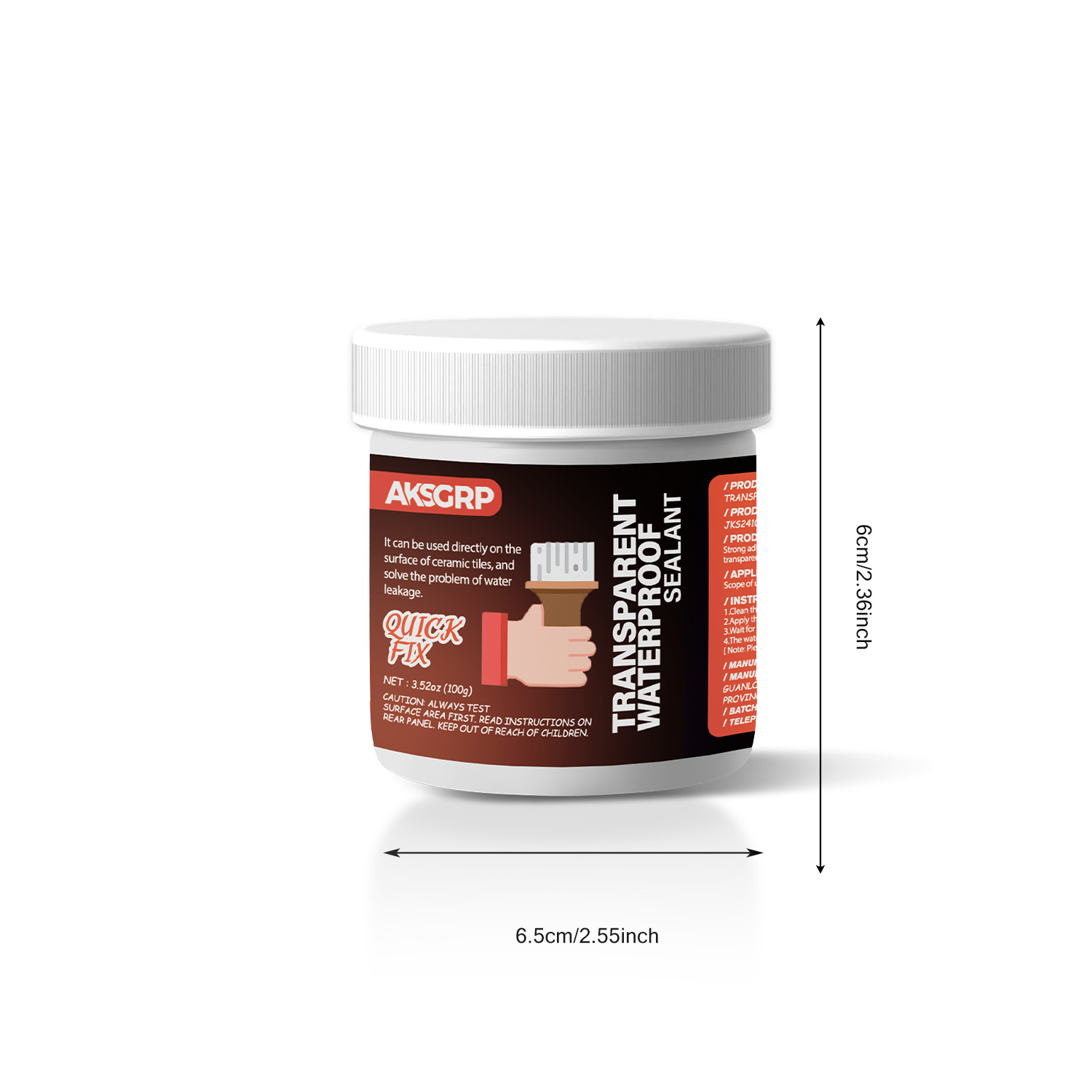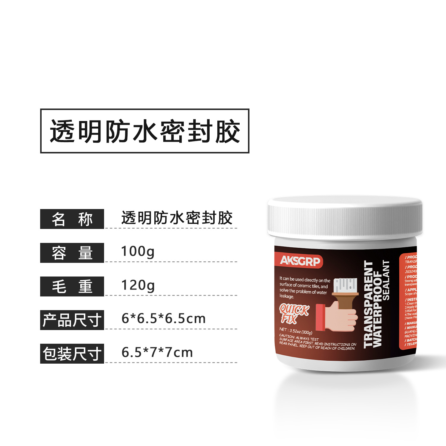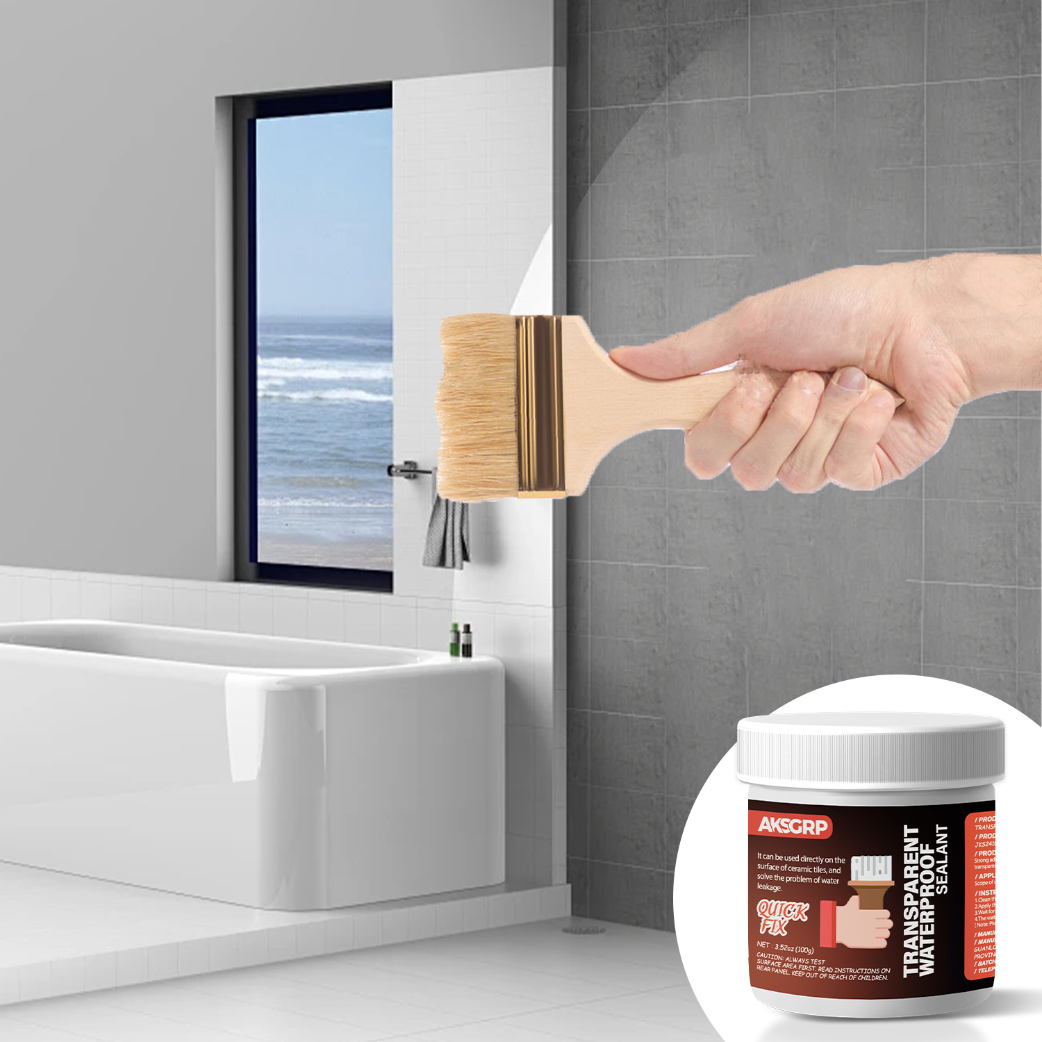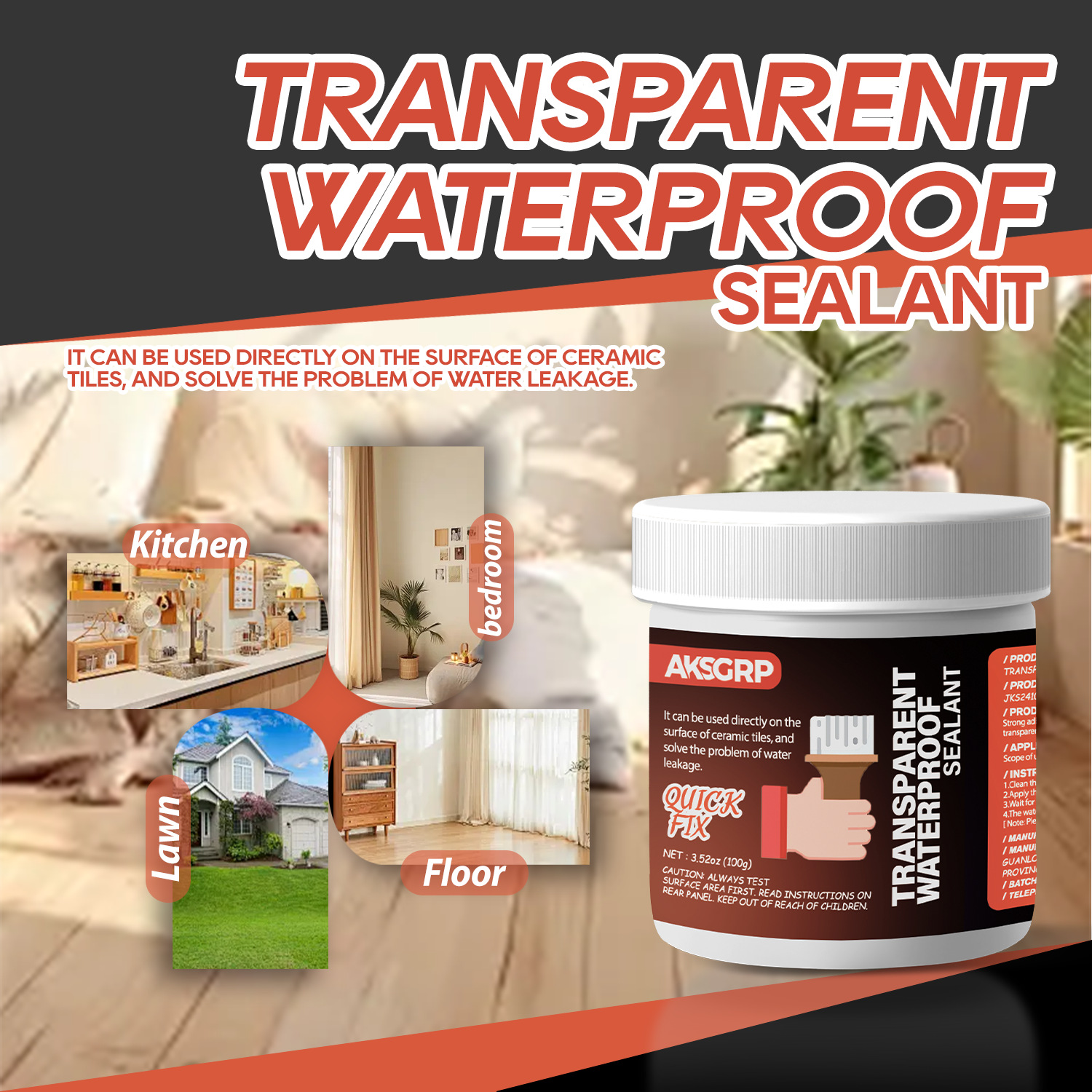 A product from the AKSGRP Multi-Purpose Repair Series (also belonging to Tile Repair Series and Wall Repair Series), with a specification of 100g (3.52oz). Its core function is waterproofing and leak repair—it can be directly used on ceramic tile surfaces to solve water leakage problems, suitable for kitchens, bathrooms, exterior walls, and can also be used as a roof leak-stop coating. The usage has two steps: first clean the construction surface to ensure no moisture; then use a tool to directly apply the product to the construction area.