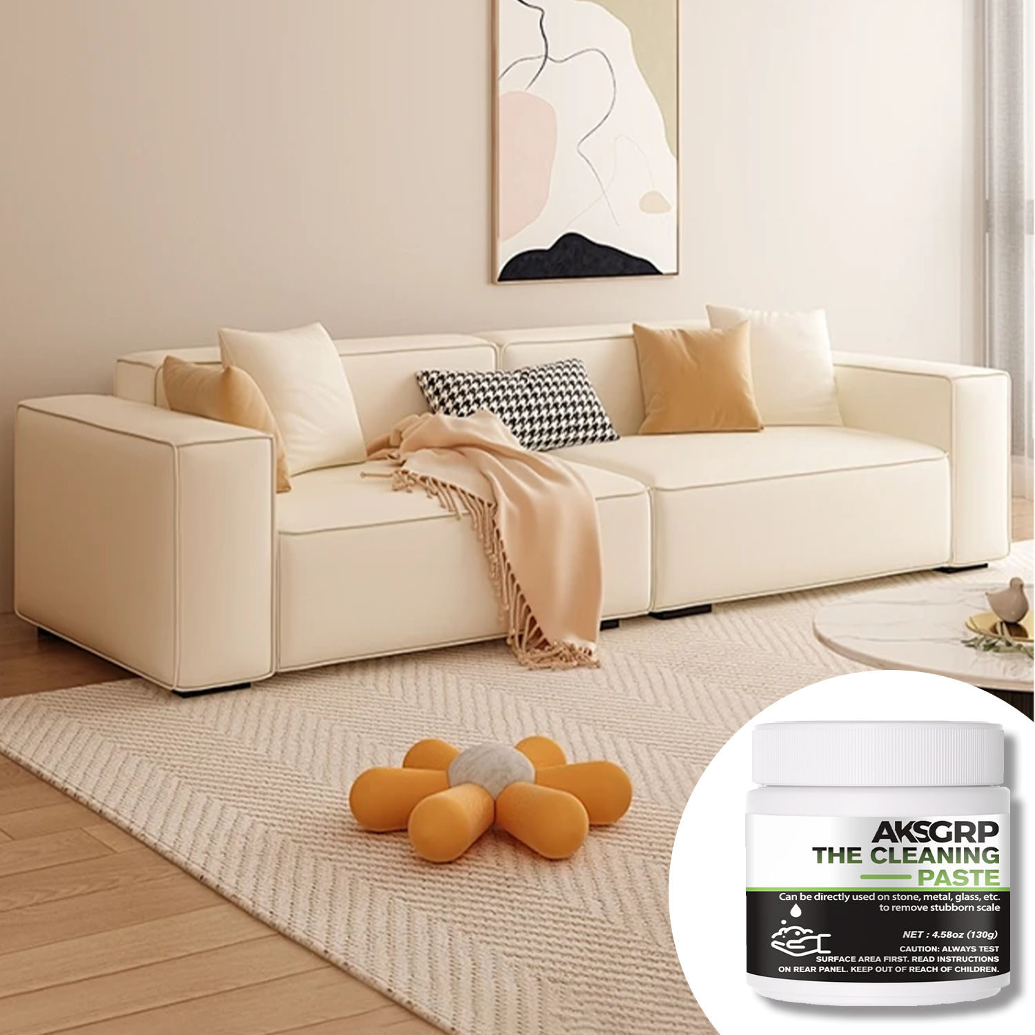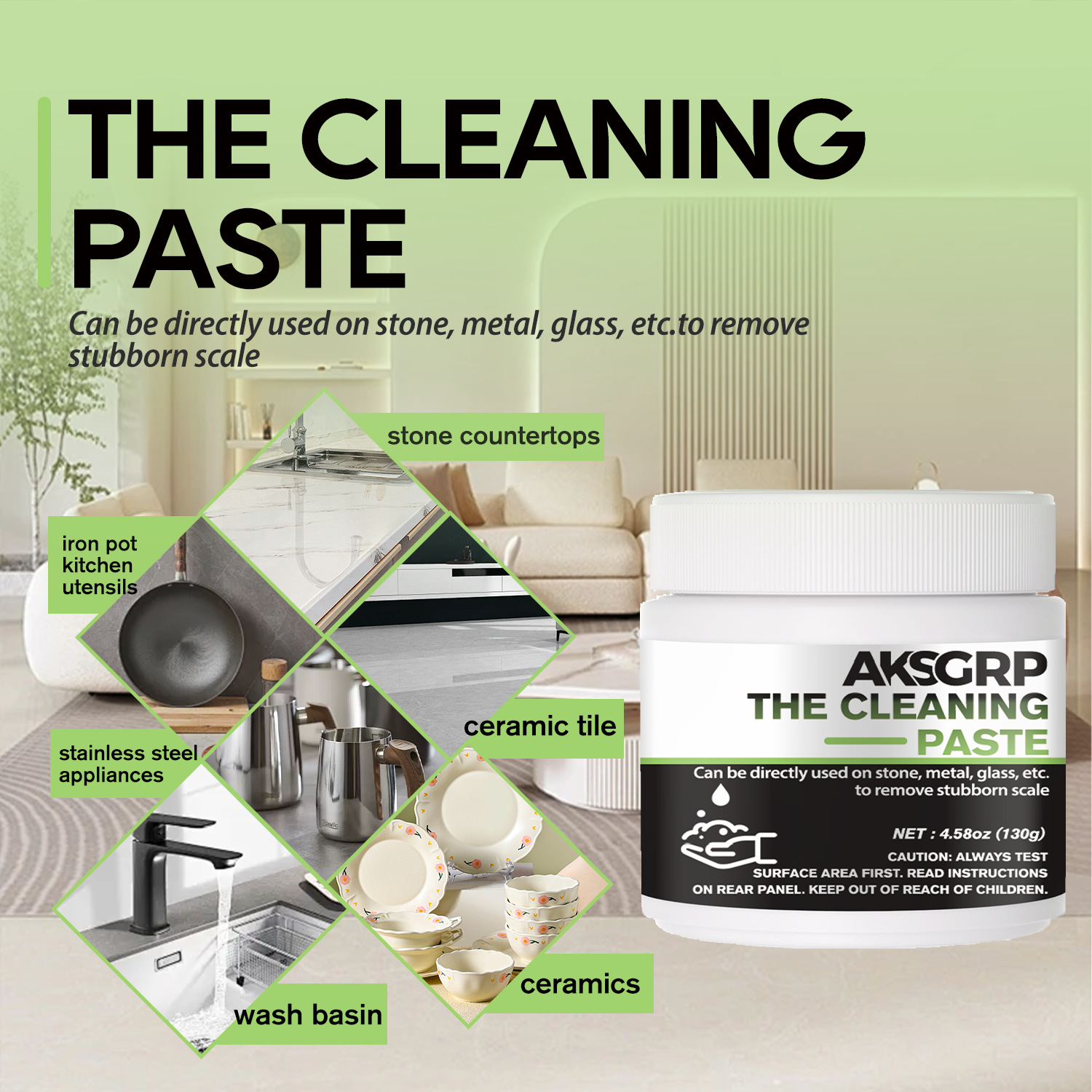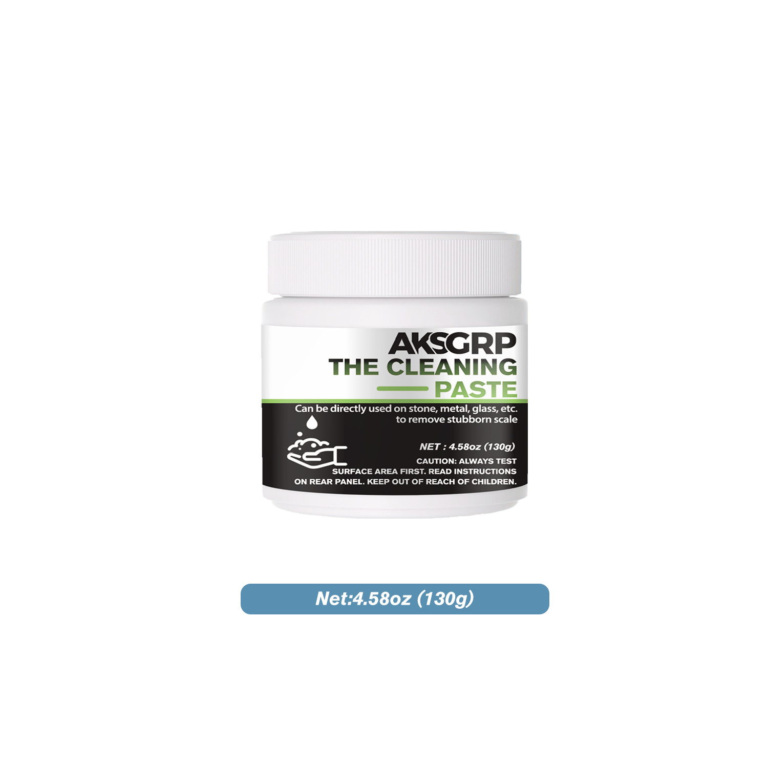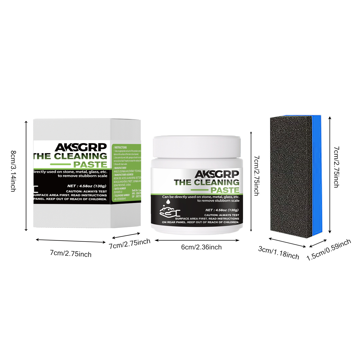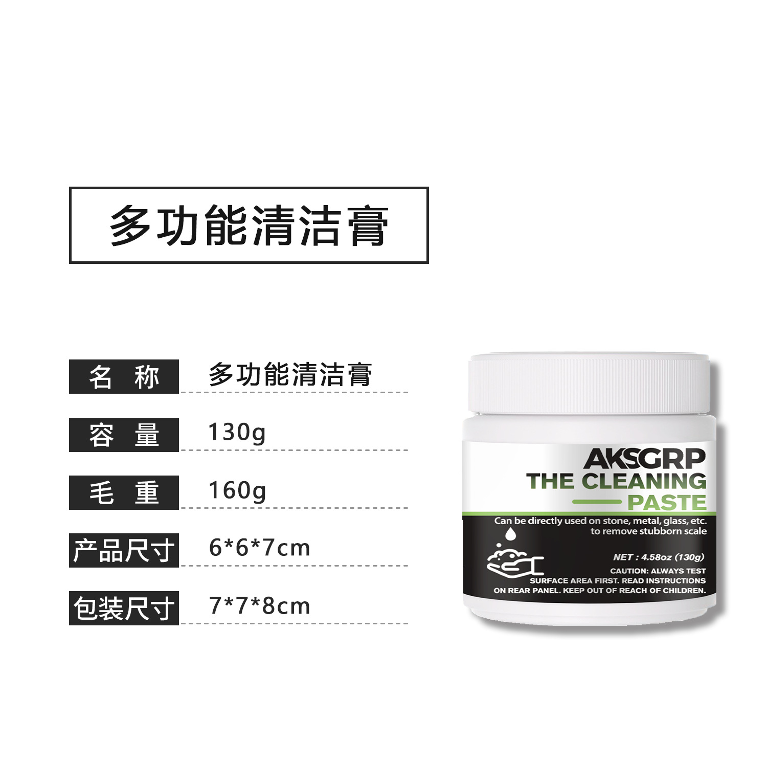 A product from the AKSGRP Multi-Purpose Cleaning Series, available in two specifications: 130g (4.58oz) and 160g. The product size is 6×6×7cm, and the packaging size is 7×7×8cm. Its core feature is water-free stain removal—it can clean stubborn stains on white shoes, care for leather products (like leather shoes, sofas), and remove stubborn scale from home materials such as stone, metal, and glass.