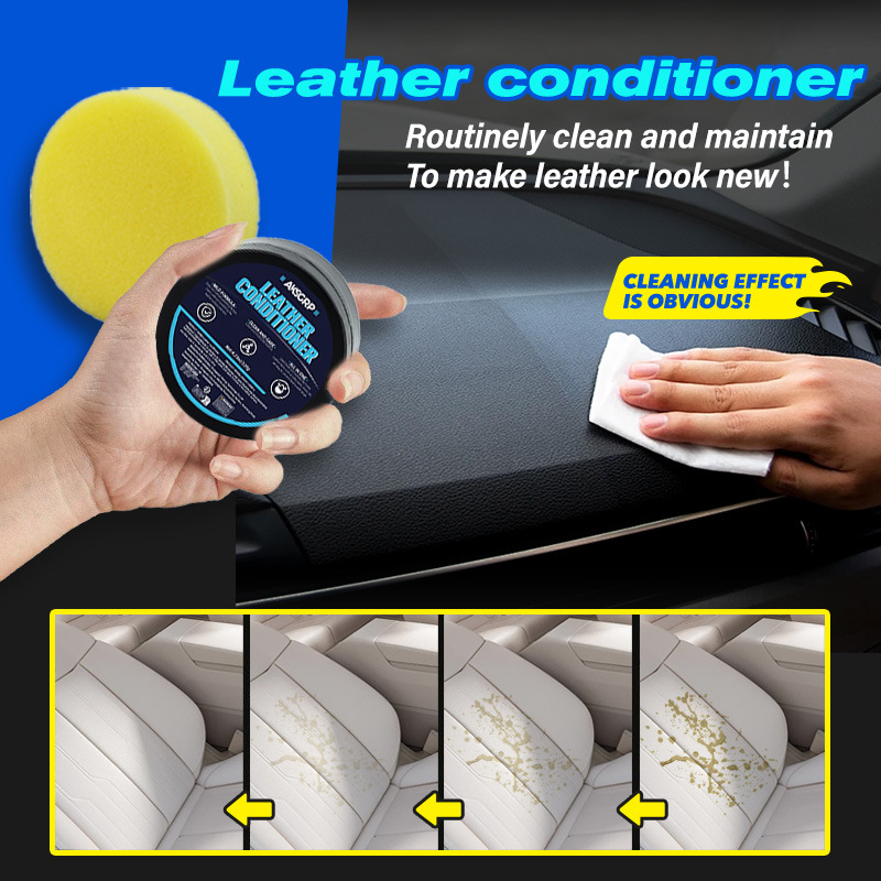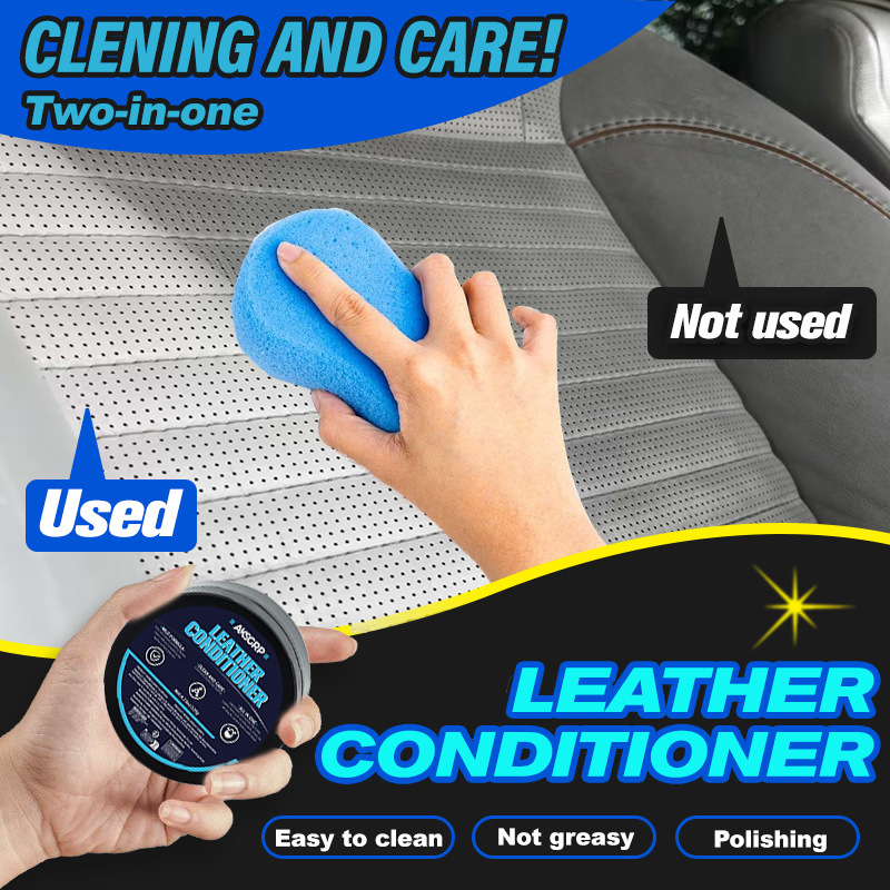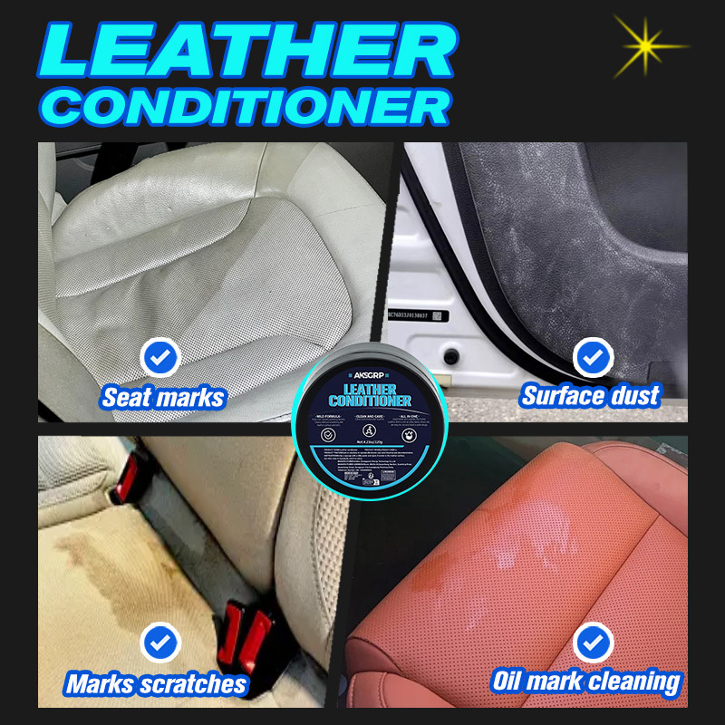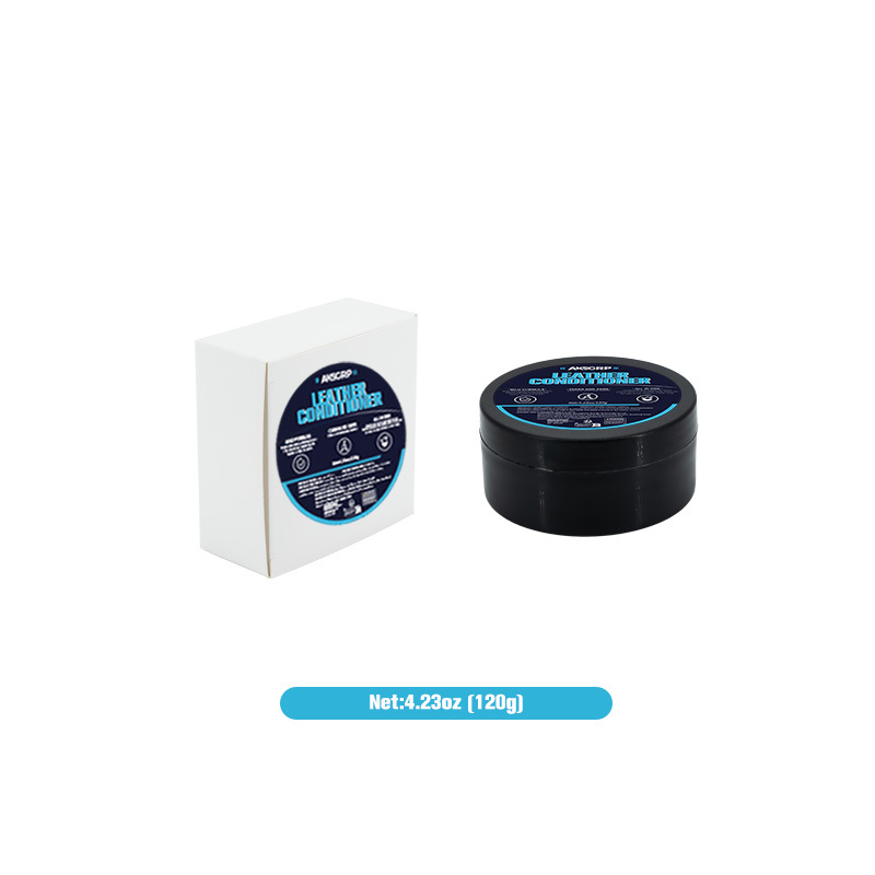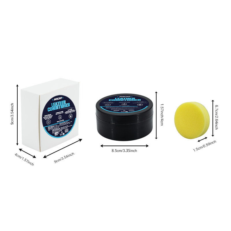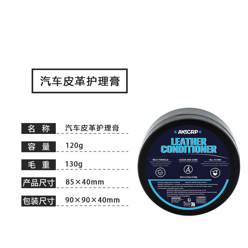 A product from the AKSGRP Leather Care Series, available in 120g (4.23oz) and 130g. Product size 85×40mm, packaging size 90×90×40mm. Key advantages: mild formula, 2-in-1 cleaning and maintenance, solving all leather problems in one step. It removes surface dust, oil stains, scratch marks, leaves no greasiness after cleaning, and polishes to restore leather’s shine. Suitable for home genuine leather sofas, leather goods, bags, and car leather. To use: dip a sponge in the cream and wipe in a circular motion, let it sit to absorb, then wipe off residues with a cotton cloth.