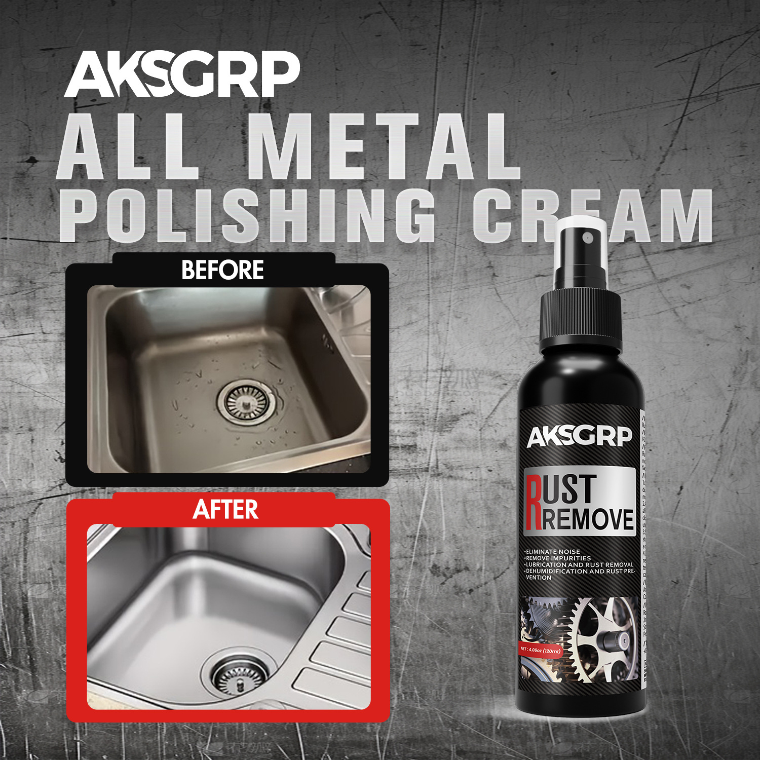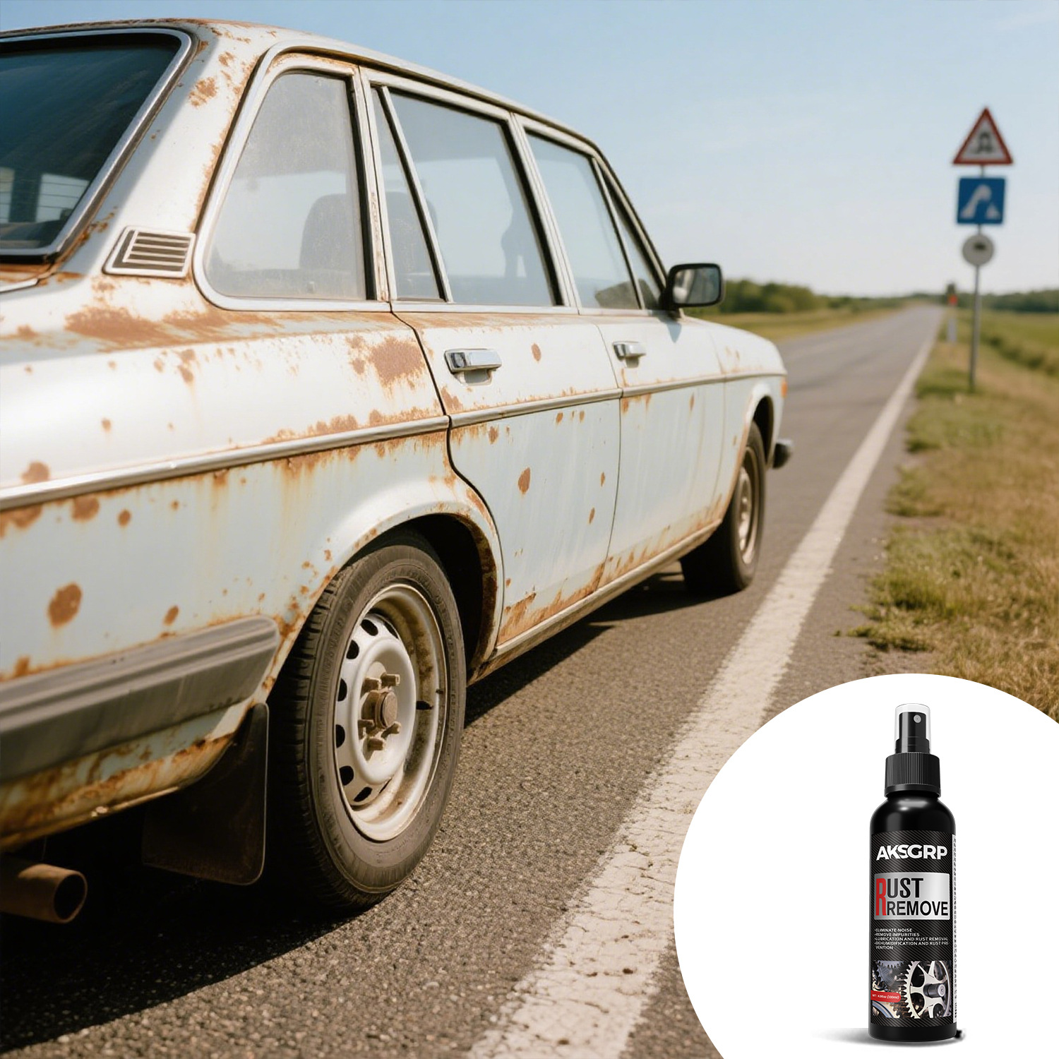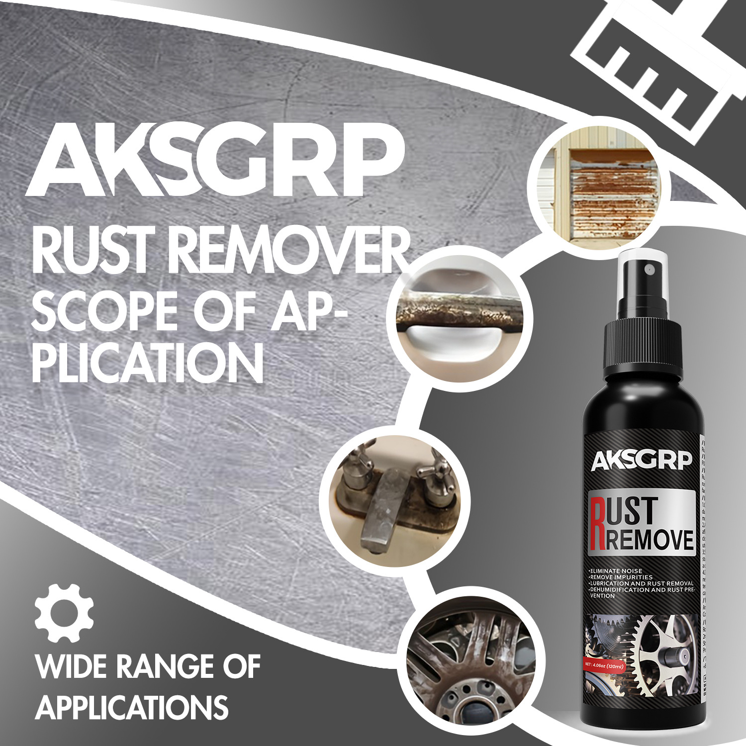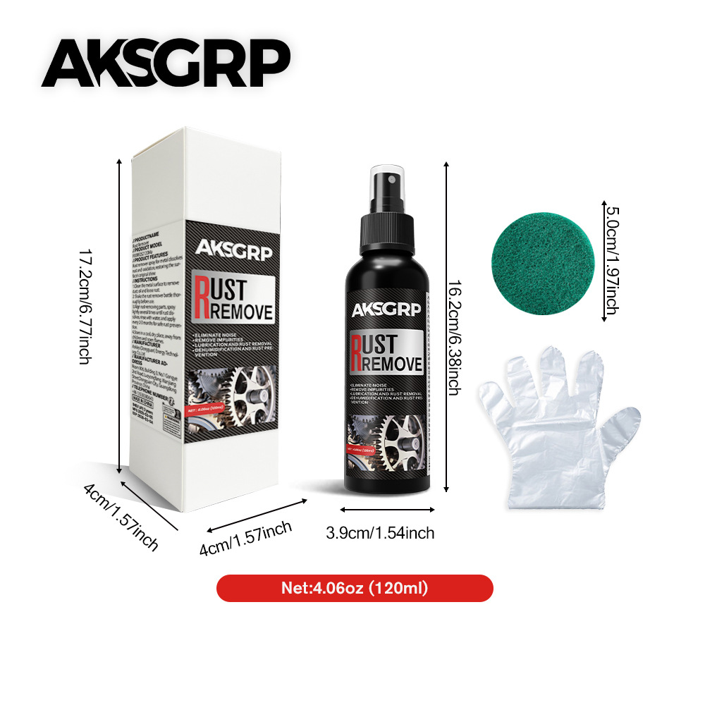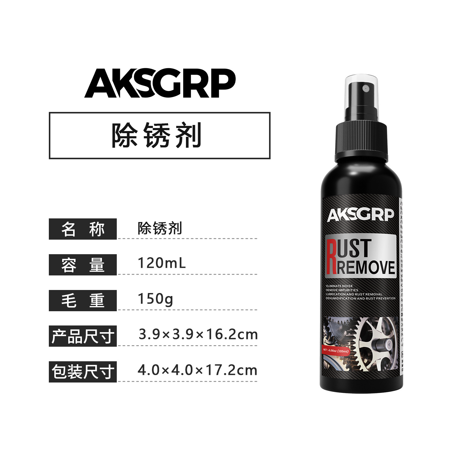 A product from the AKSGRP Multi-Purpose Cleaning Series, it has a capacity of 120mL (4.06oz) and a gross weight of 150g. The product dimensions are 3.9×3.9×16.2cm, and the packaging dimensions are 4.0×4.0×17.2cm. Its core function is strong metal rust removal—it can clean rust from parts like hubs and screws, and also remove dust and eliminate noise, combining rust removal with metal maintenance. Before use, shake well (wear gloves if necessary), spray a small amount multiple times on rusted areas until rust dissolves, then treat with water. It is recommended to use it every 2-3 months to prevent rust.