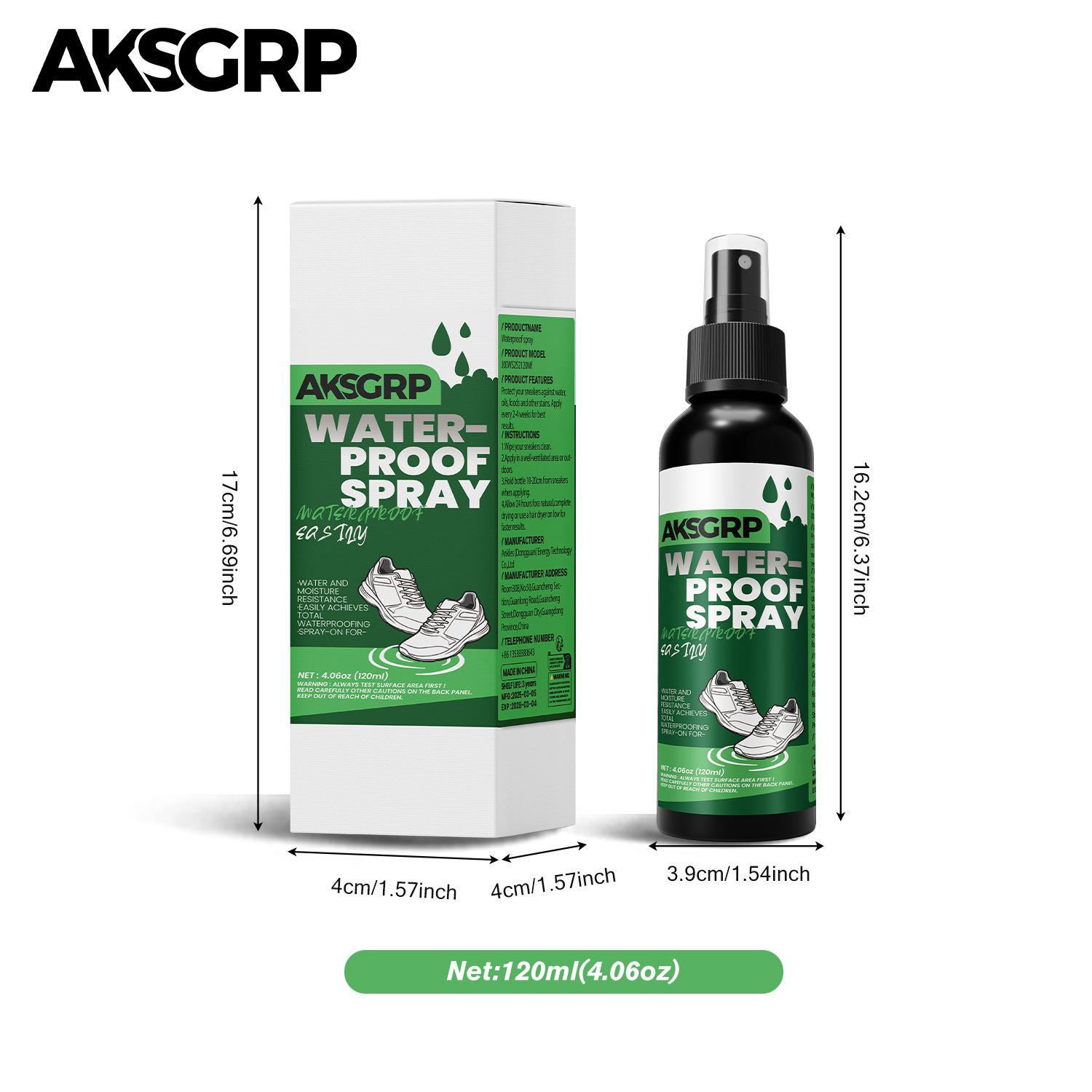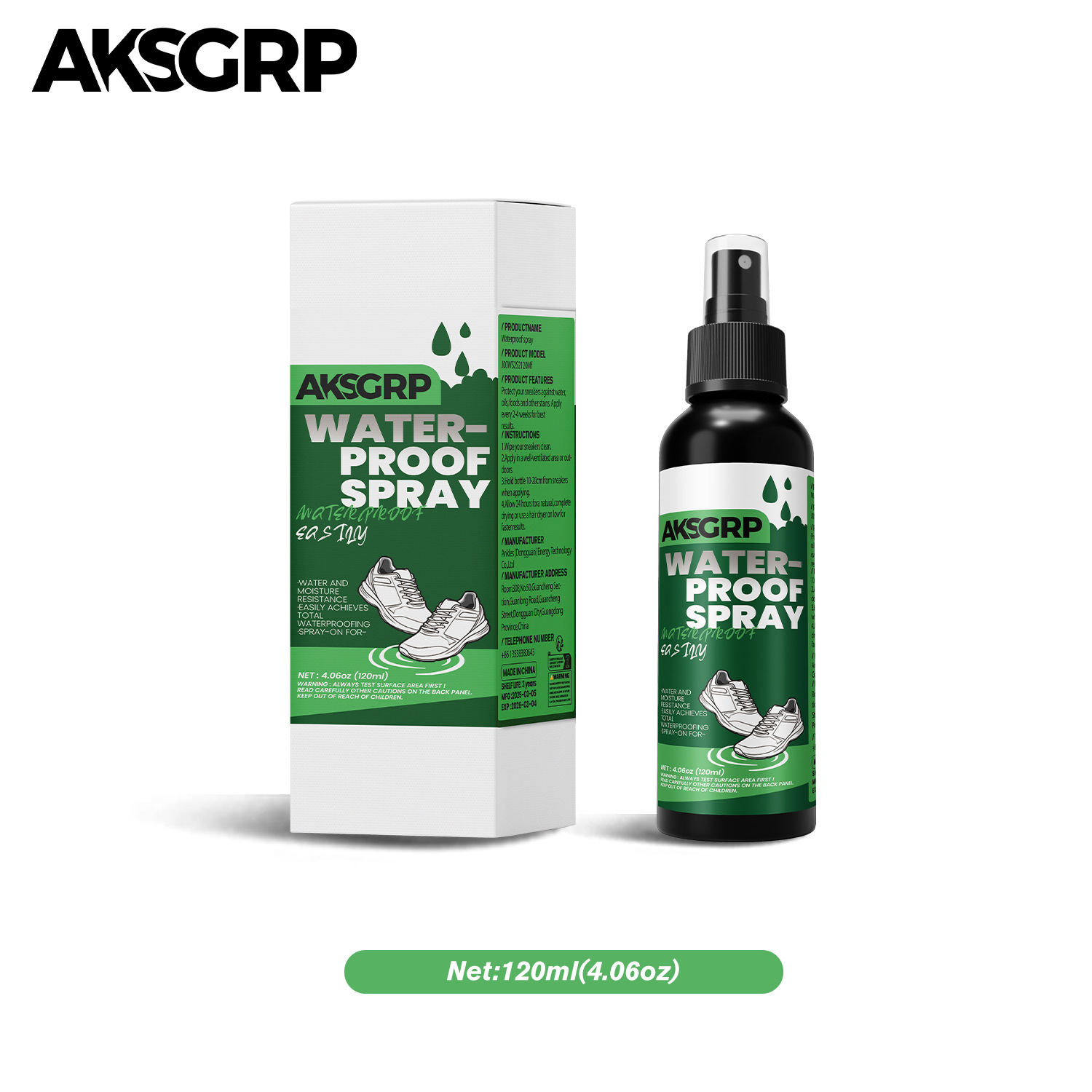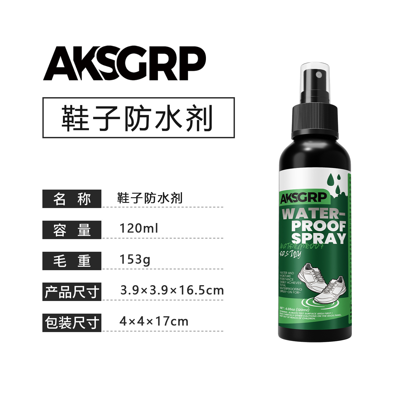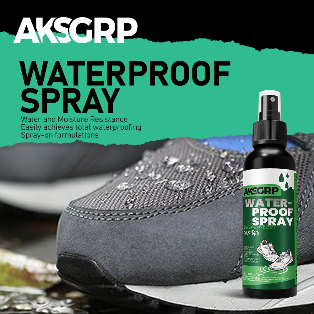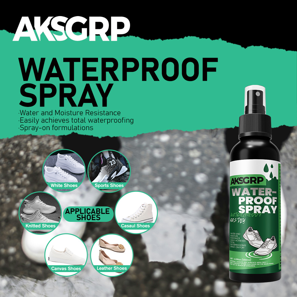 A product from the AKSGRP Shoe Care Series, it has a capacity of 120ml (4.06oz) and a gross weight of 153g. The product dimensions are 3.9×3.9×16.5cm, and the packaging dimensions are 4×4×17cm, made in China. It adopts a spray-on formula, providing waterproof, anti-dirt and anti-oil protection for shoe uppers, suitable for various shoes such as white shoes, knitted shoes, canvas shoes, sports shoes, casual shoes and leather shoes. Before use, clean the shoe upper, spray evenly with the nozzle 10-20cm away from the upper in a ventilated area, and let it air dry naturally for 24 hours before wearing.