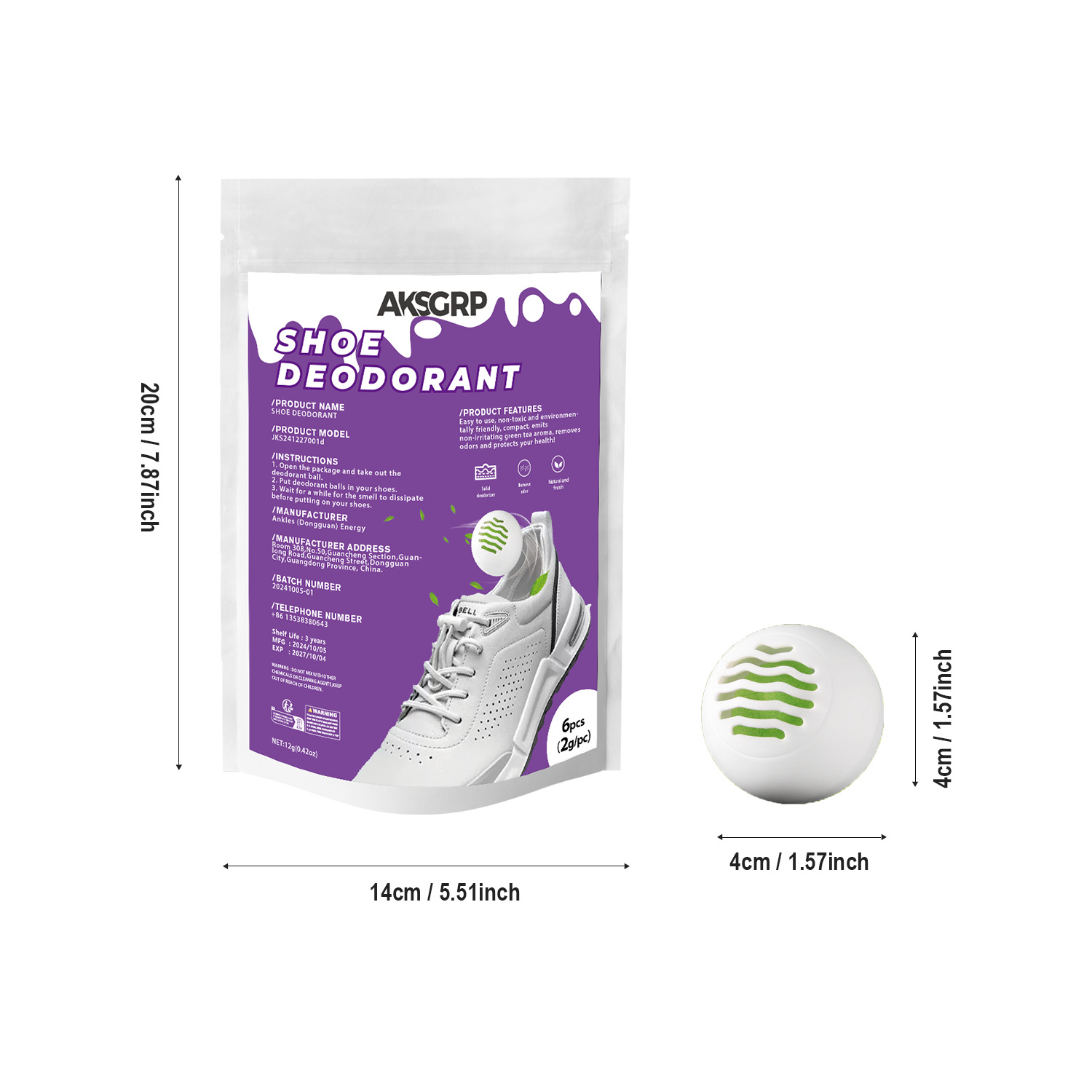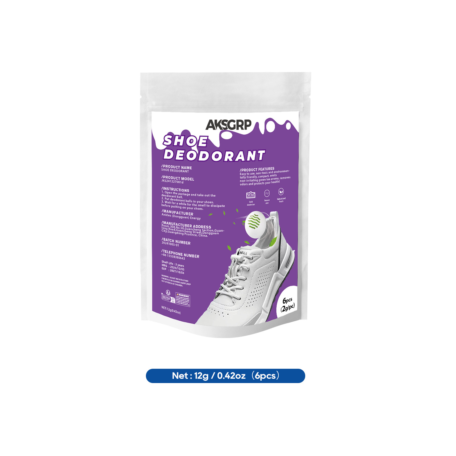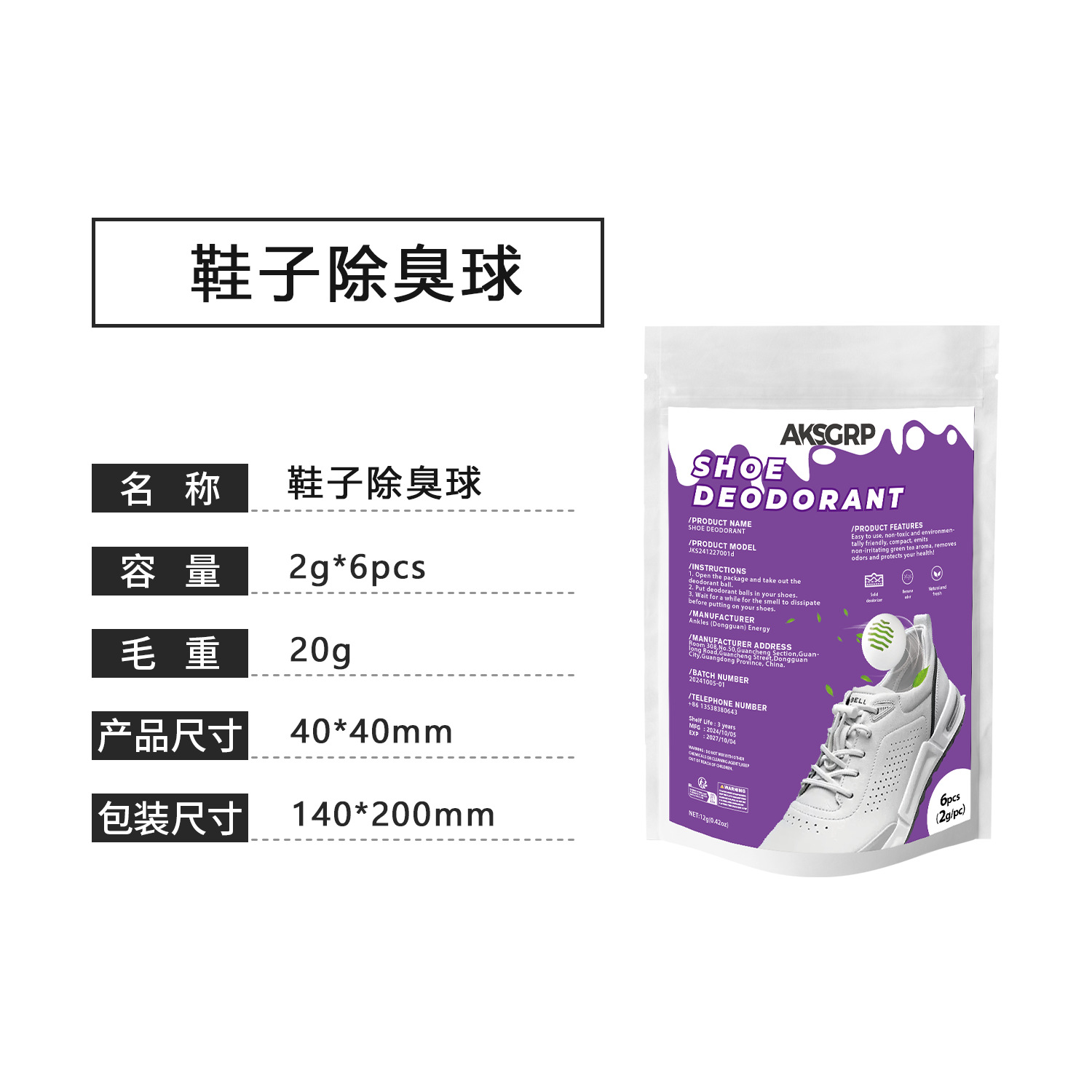 A product from the AKSGRP Shoe Care Series, each box contains 6 balls (2g per ball, total weight 12g/0.42oz). Its core functions are odor absorption and bacteria killing, and it can be placed in spaces such as sneakers, closets, shoe cabinets, and kitchen cabinets. When using, open the package and put it in the target area, and wait for the odor to dissipate before wearing shoes or using the storage space. The first use may produce a slight pungent smell due to the deodorant ingredients contacting the air, which is a normal phenomenon. It is suitable for odor treatment in daily footwear and home storage scenarios.