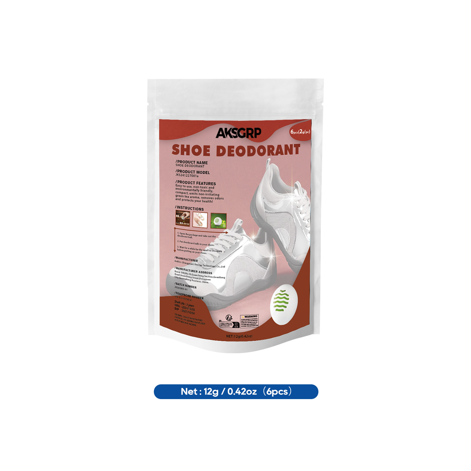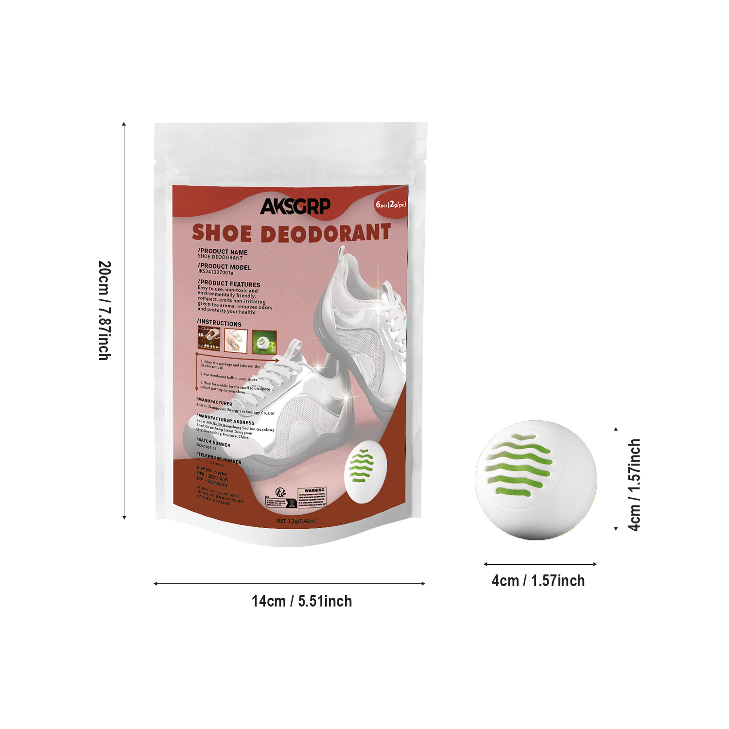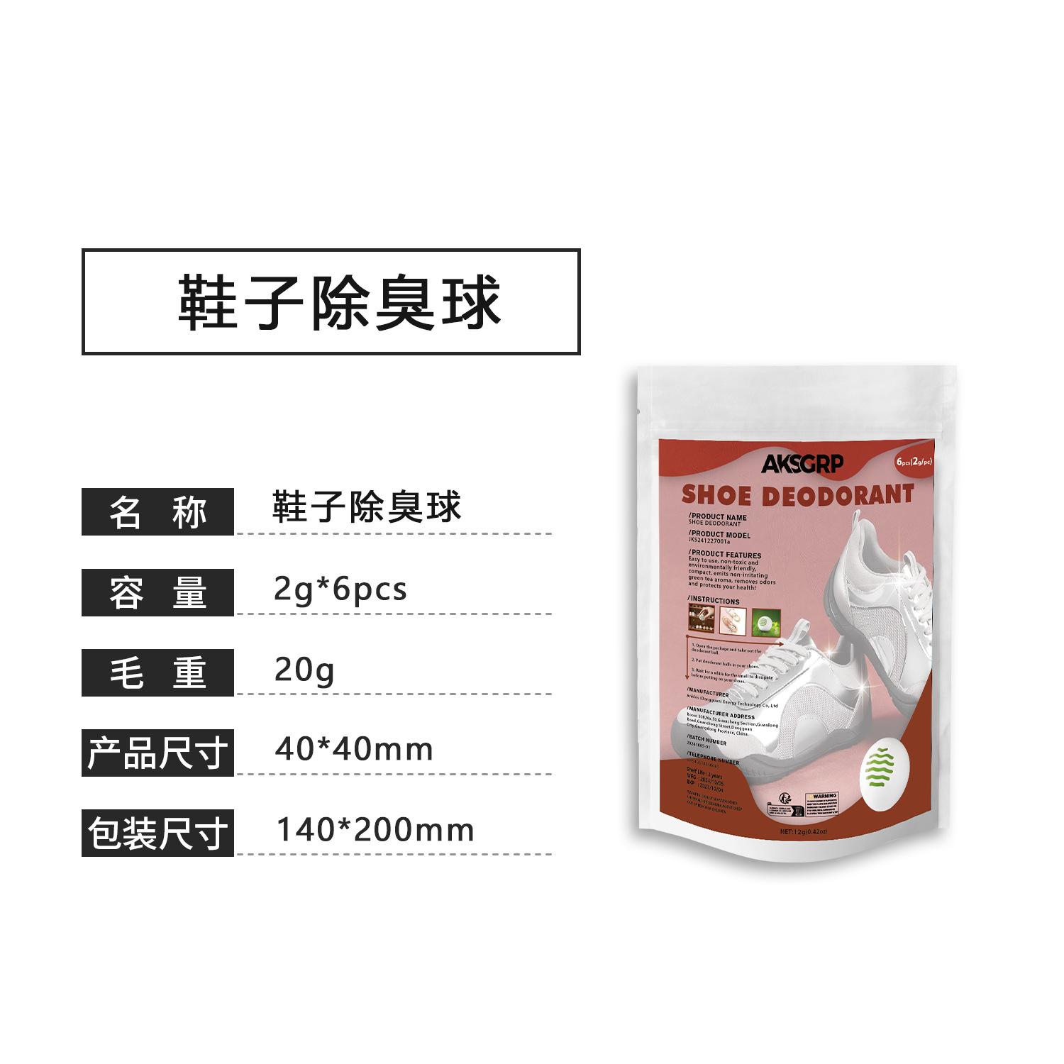 A product from the AKSGRP Shoe Care Series, each box contains 6 balls (2g per ball, total weight 12g/0.42oz, total gross weight of the box 20g). Each ball measures 40×40mm, and the packaging size is 140×200mm. Its core function is to absorb and eliminate odors, maintaining long-lasting freshness, suitable for scenarios such as shoes, shoe cabinets and athletic sneakers. When using, open the package and place the deodorizing balls in the target area. The first use may produce a slight pungent smell due to the ingredients contacting air, so you need to wait for the odor to dissipate before wearing shoes. It is easy to operate and can effectively solve the odor problem of footwear and storage spaces.