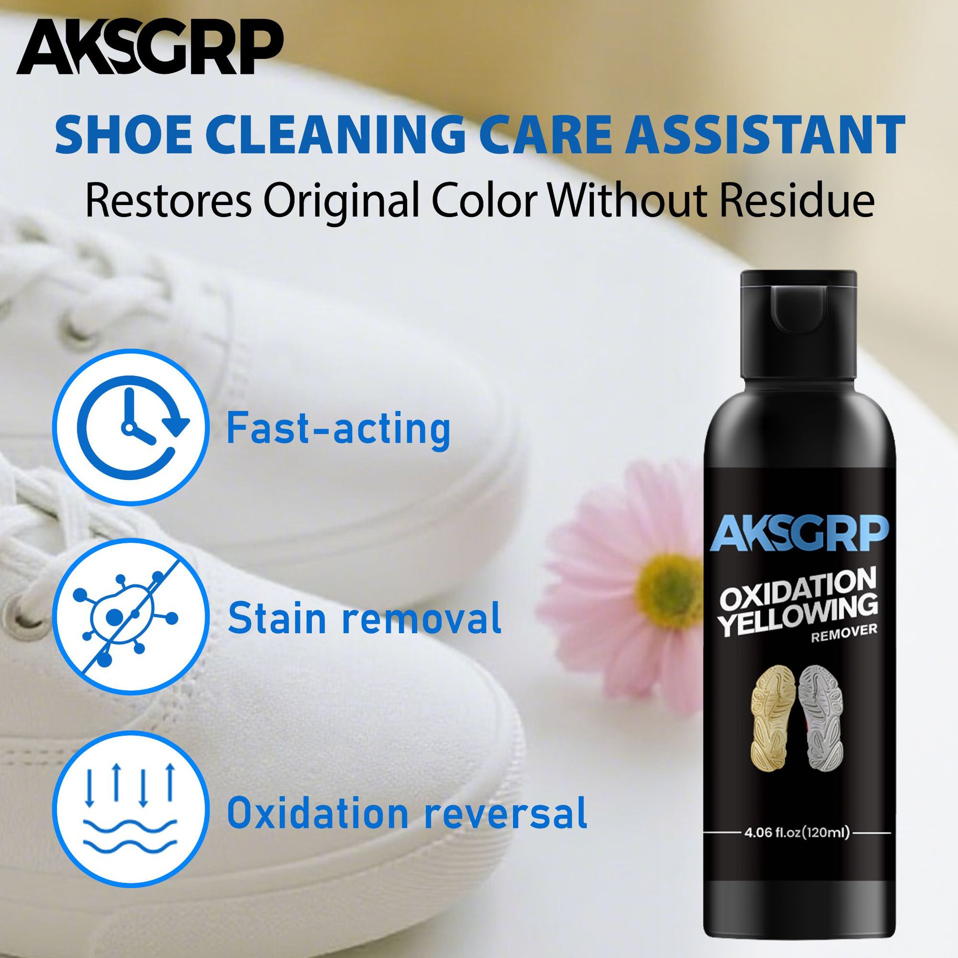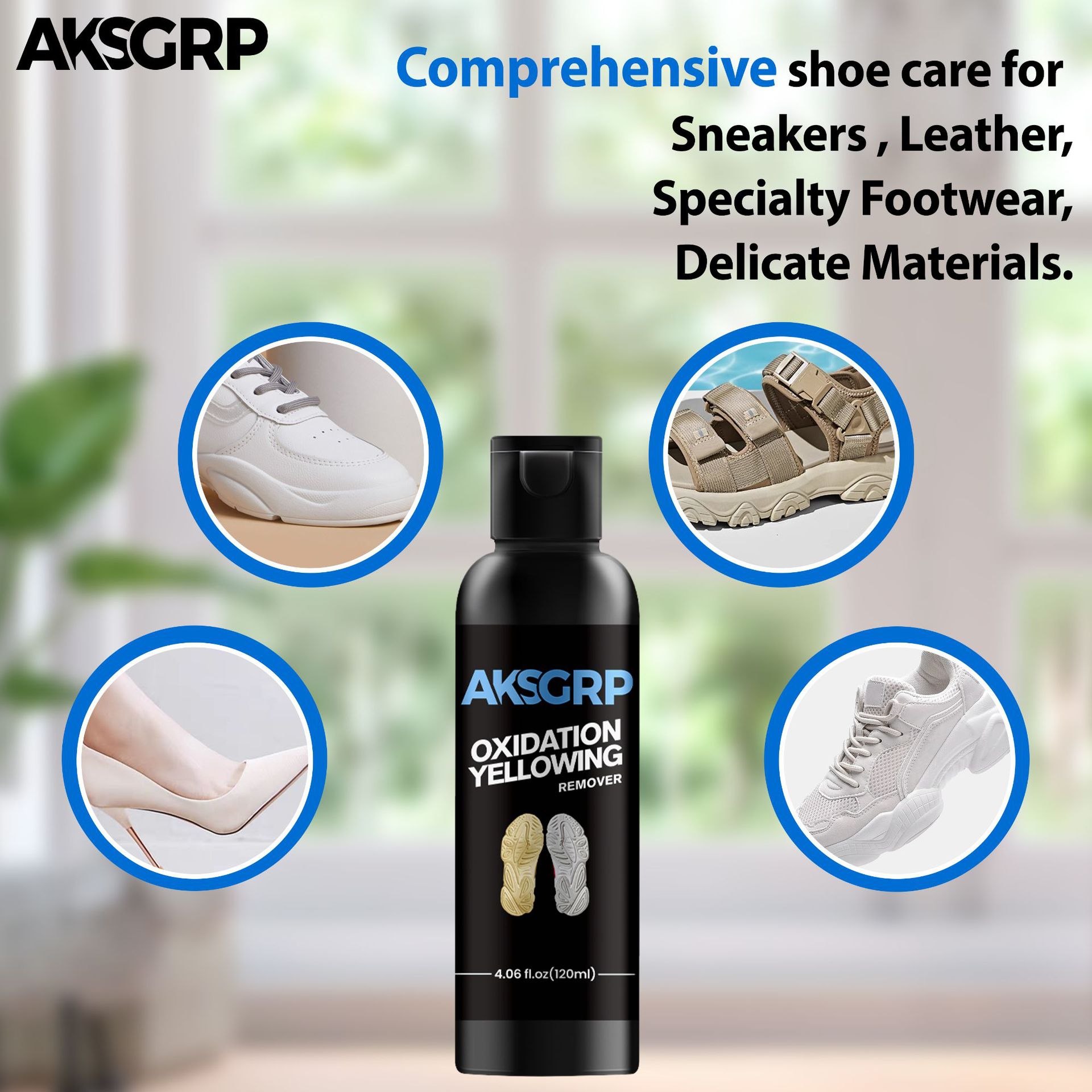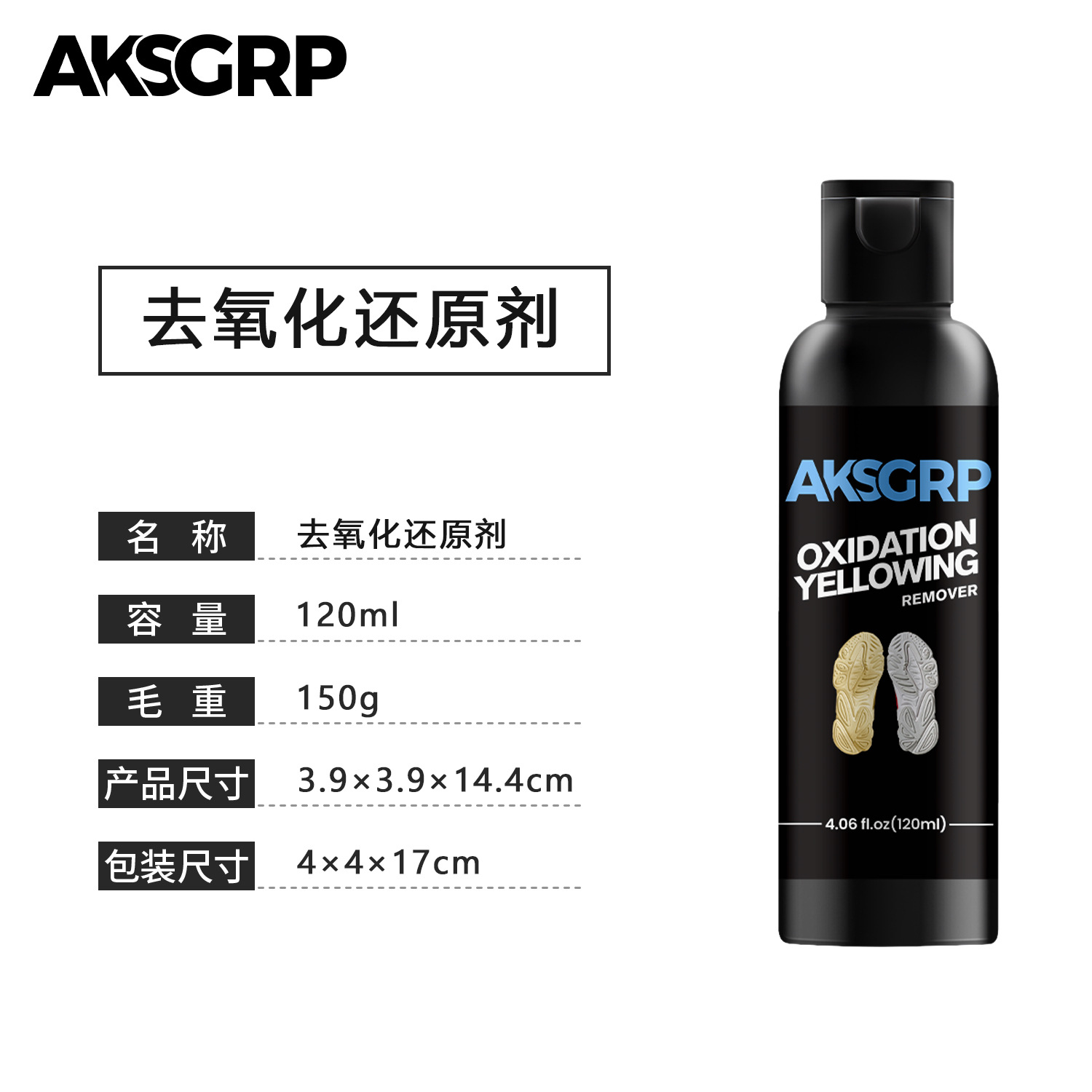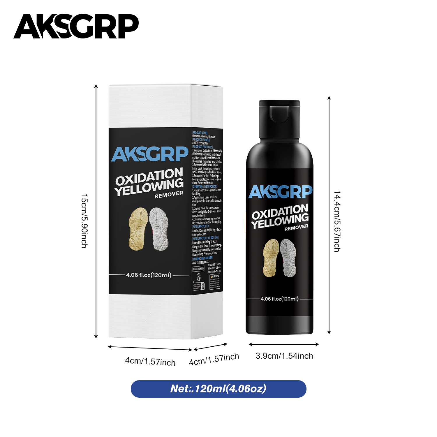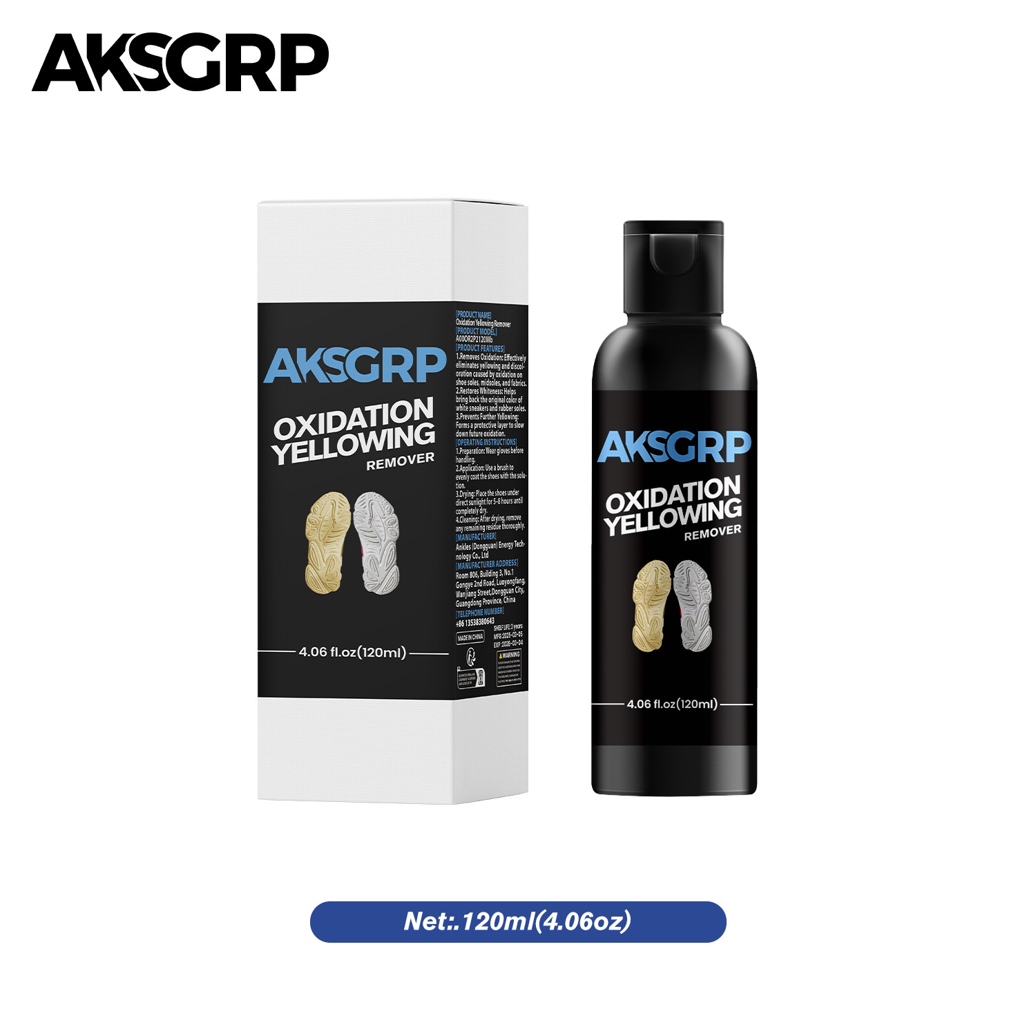 A product from the AKSGRP Shoe Care Series, available in two capacities: 120ml (4.06oz) (gross weight 150g) and 50ml (1.69oz). The 120ml version has product dimensions of 3.9×3.9×14.4cm and packaging dimensions of 4×4×17cm. Featuring fast-acting and residue-free properties, it can remove oxidation-induced yellowing from shoe soles and edges, while also having stain-removing effects to restore the original color of shoes. Suitable for various footwear such as sneakers, leather shoes and specialty footwear, it not only cleans shoes but also provides a comfortable foot feel when wearing, making it a practical tool for shoe maintenance.