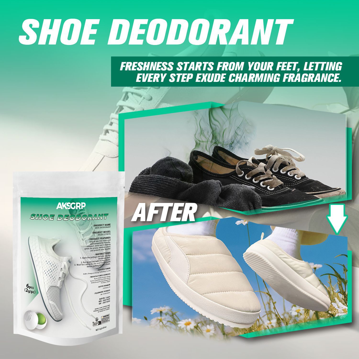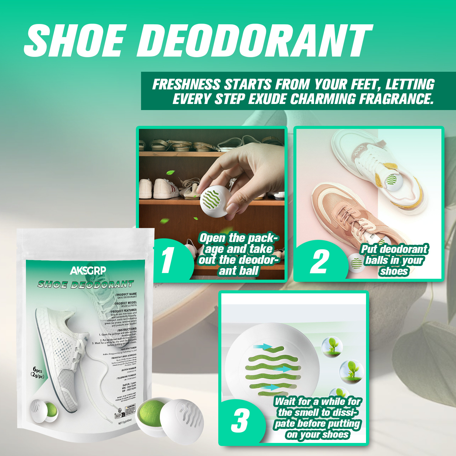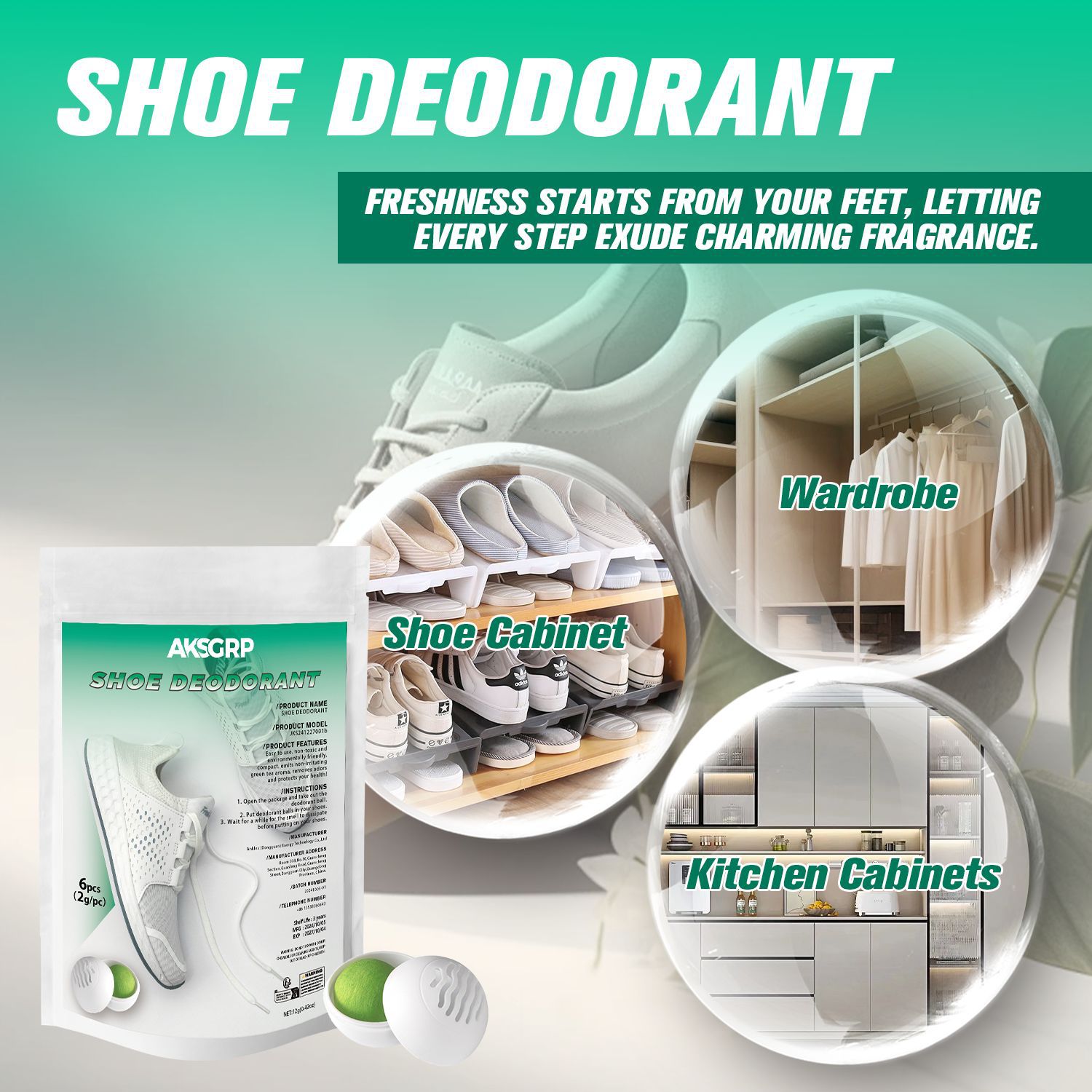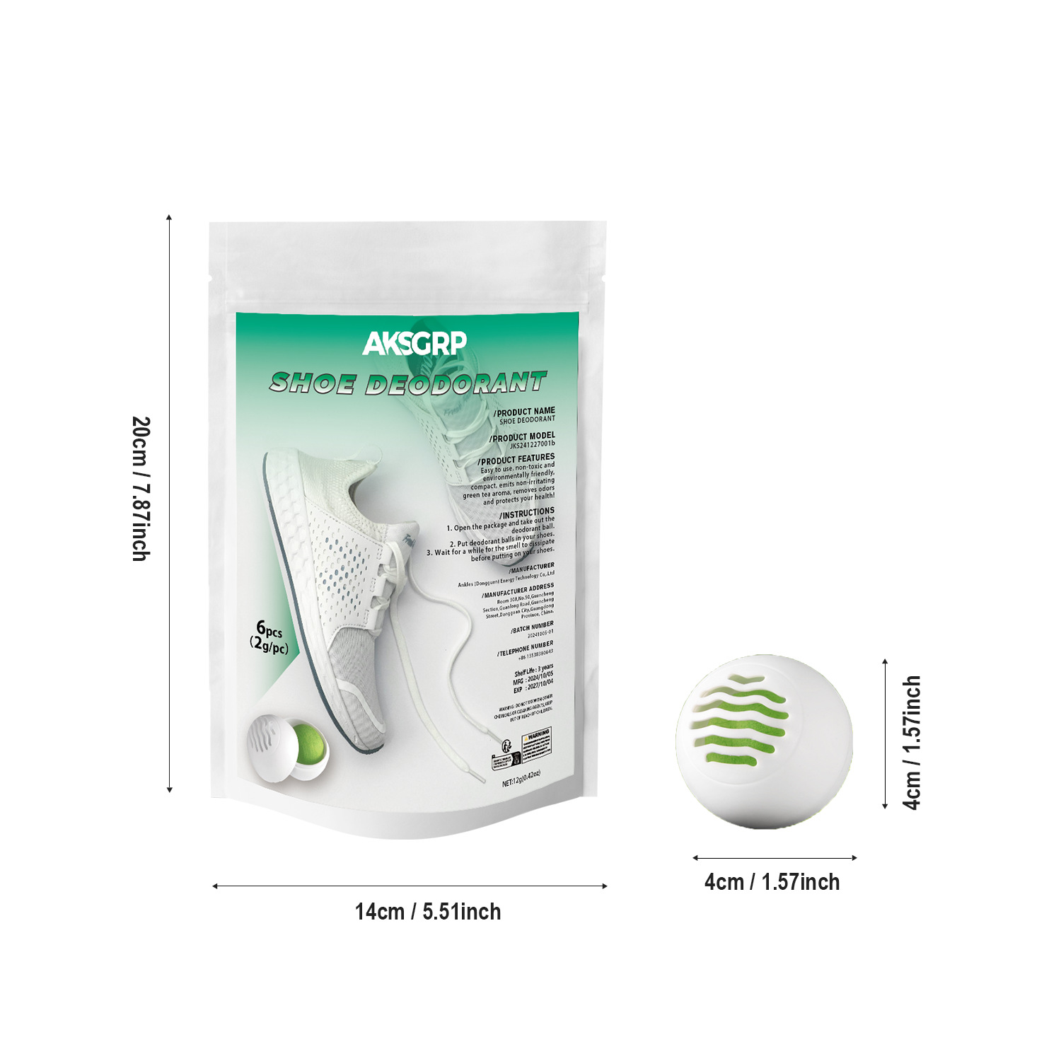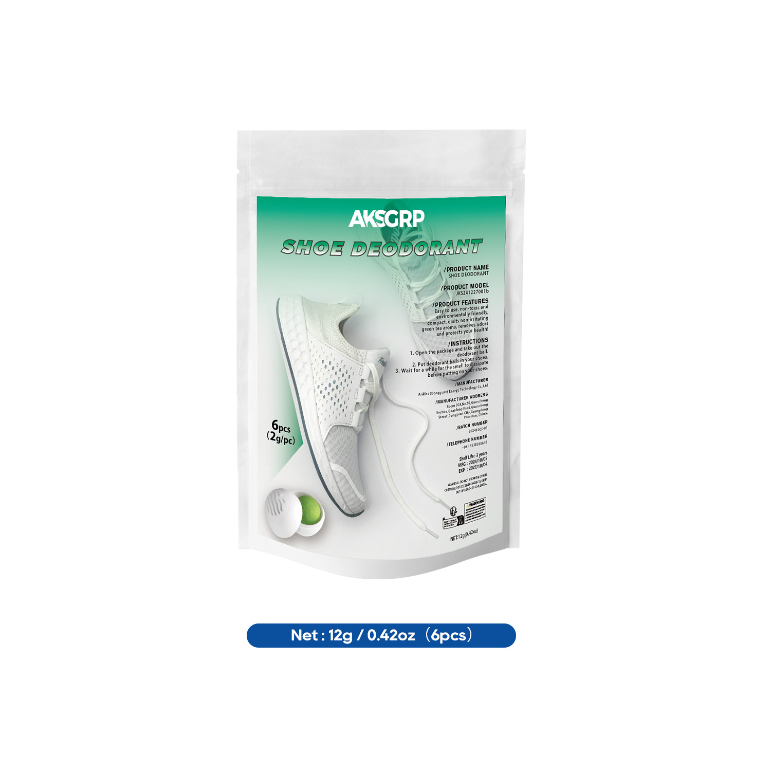 A product from the AKSGRP Shoe Care Series, each box contains 6 solid anti-odor balls (2g per ball, total weight 12g/0.42oz, total gross weight of the box 20g). Each ball measures 40×40mm, and the packaging size is 140×200mm. Its core function is to absorb odors and release a fresh fragrance, maintaining long-lasting freshness in spaces. It is suitable for multiple scenarios such as shoes, socks, shoe cabinets, wardrobes, and kitchen cabinets. When using, simply open the package and place it in the target area. The first use may produce a slight pungent smell due to the ingredients contacting air; it is recommended to wait for the smell to dissipate before use, easily solving the odor problem in footwear and home storage spaces.