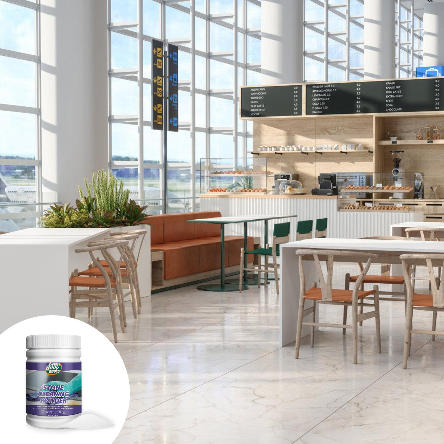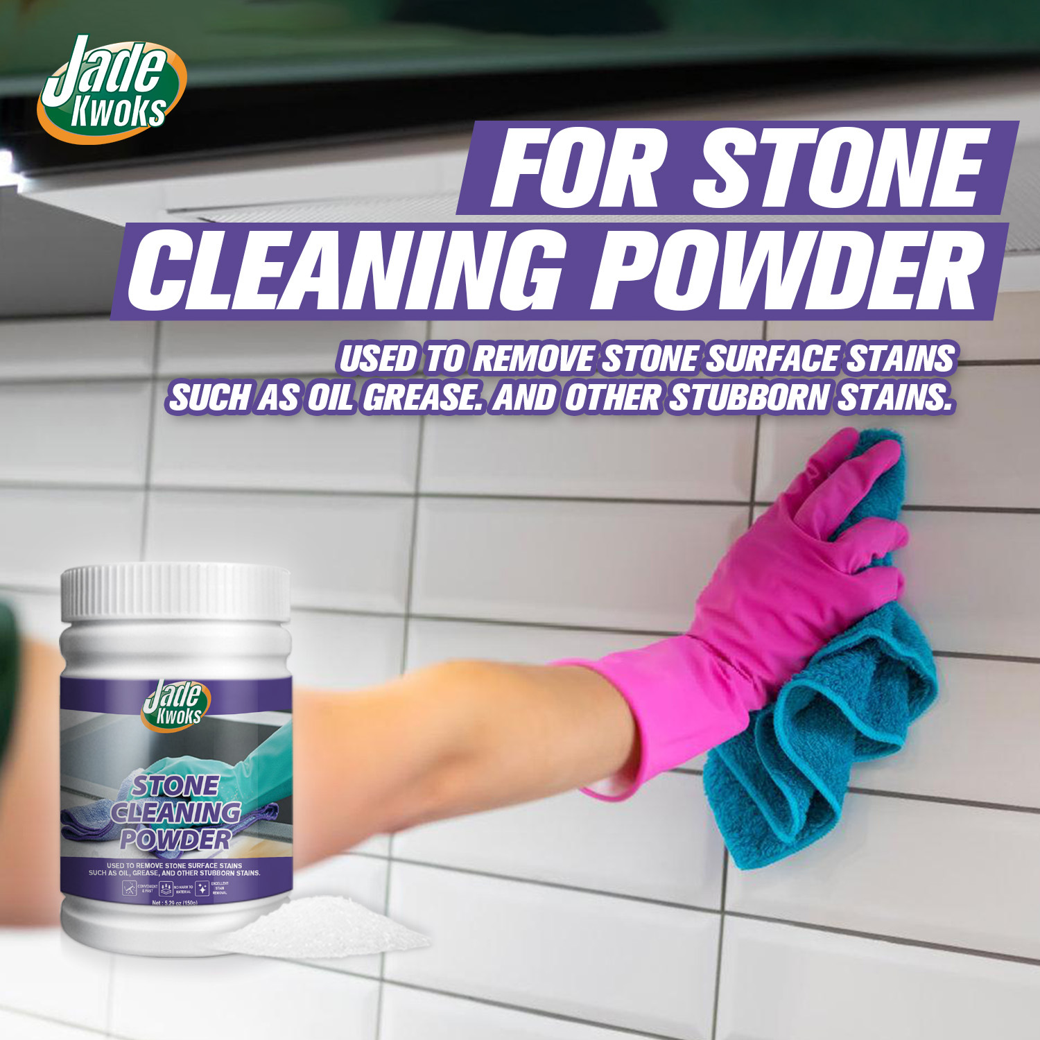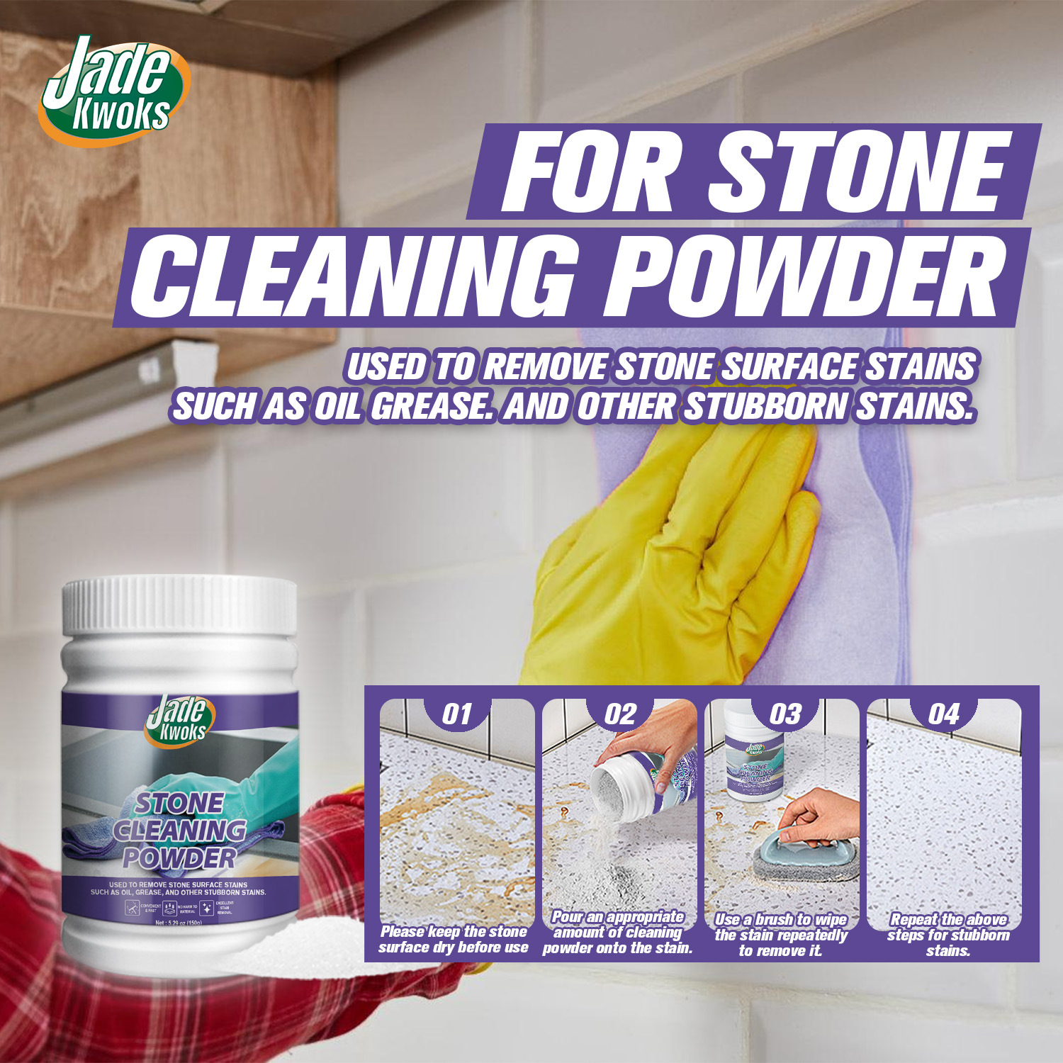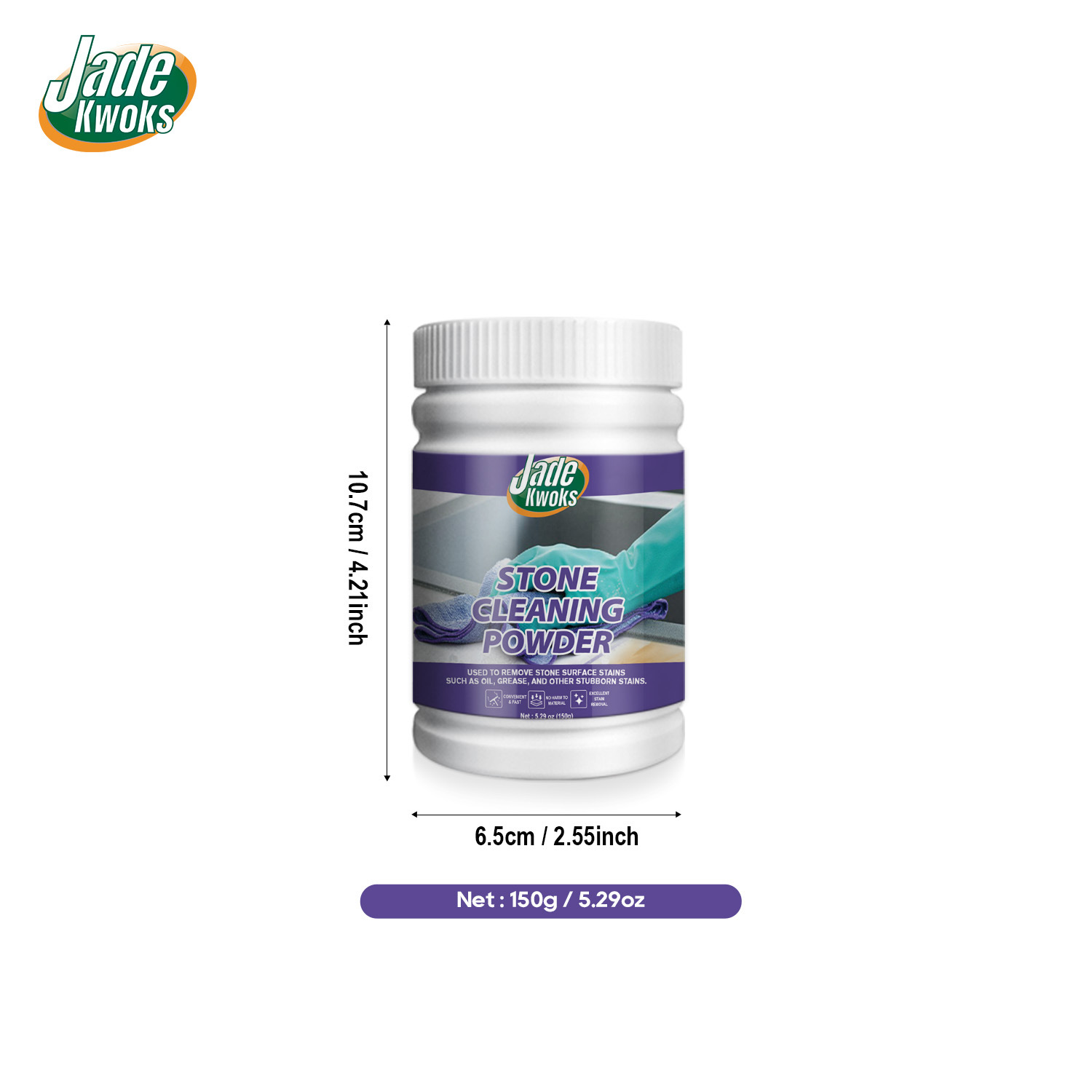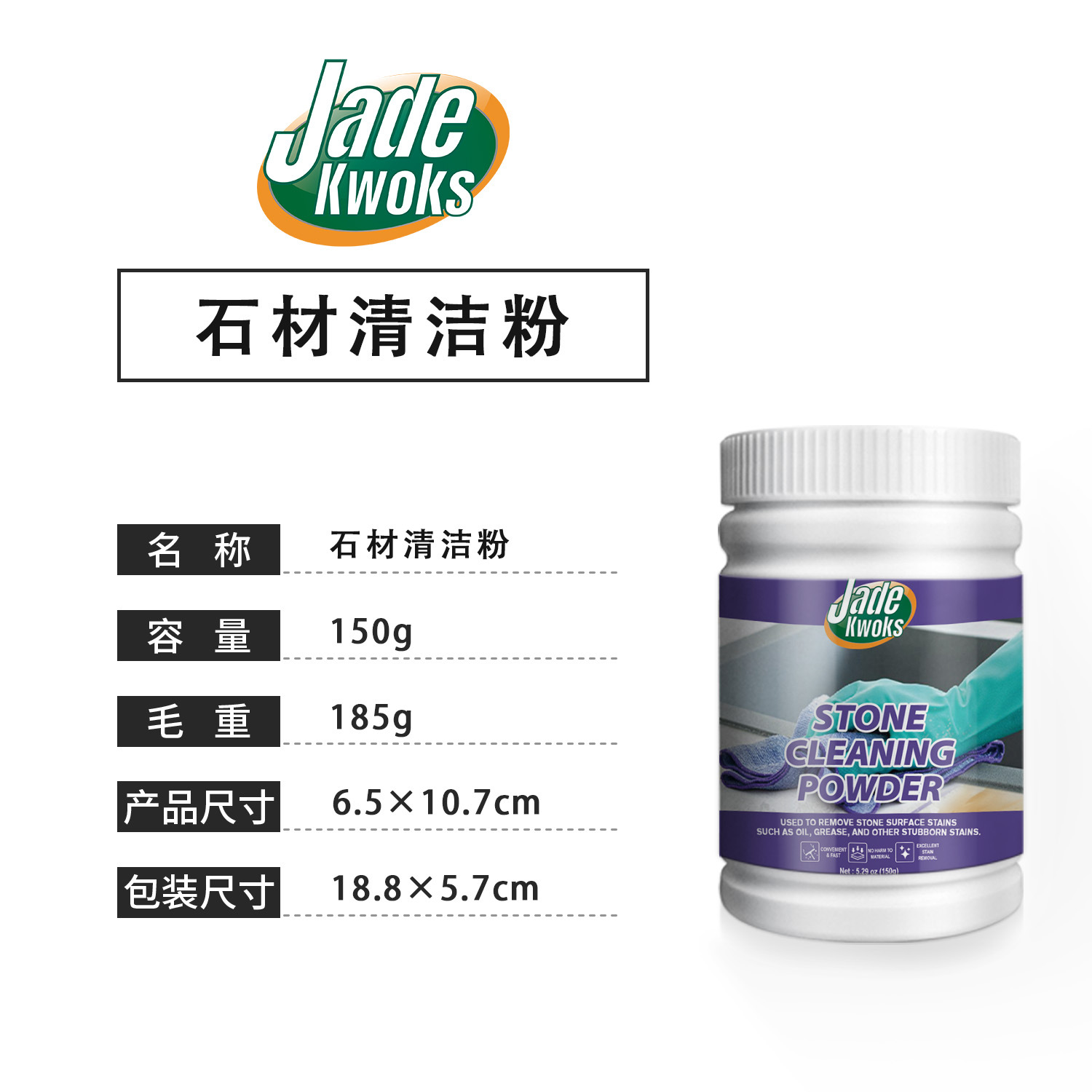 A product from the Jade KWOKS Furniture Cleaning Series, with a specification of 150g (5.29oz) and product dimensions of 6.5×10.7cm. Its core function is to remove stains from stone surfaces—it can clean oil stains, grease and other stubborn stains, and also remove scale. It is suitable for kitchen quartz countertops and also applicable to the cleaning of various stone surfaces. The usage has four steps: first keep the stone surface dry, pour an appropriate amount of cleaning powder on the stain, use a brush to wipe repeatedly to remove the stain, and repeat the above steps for stubborn stains. It is easy to operate with obvious cleaning effect.