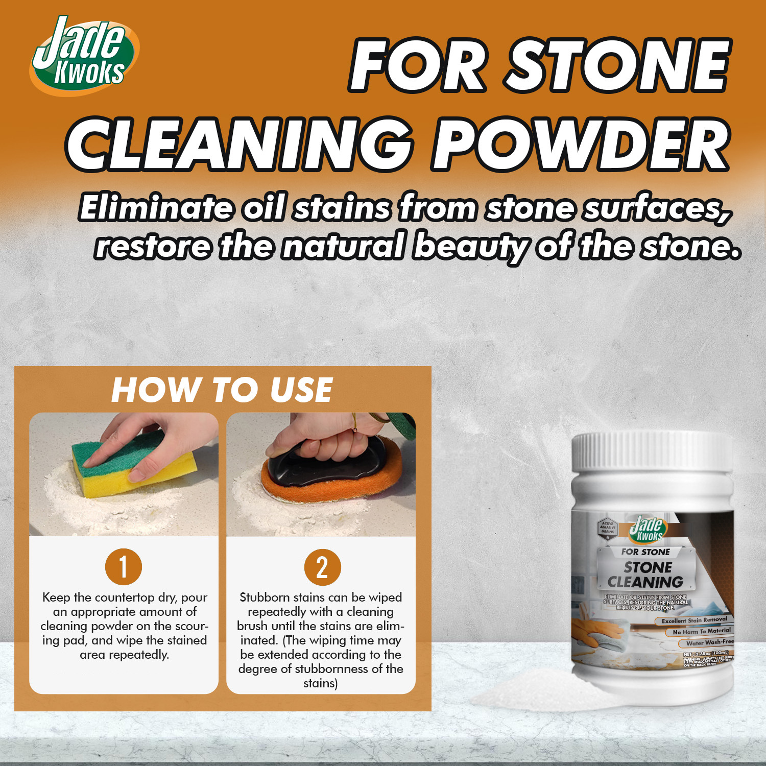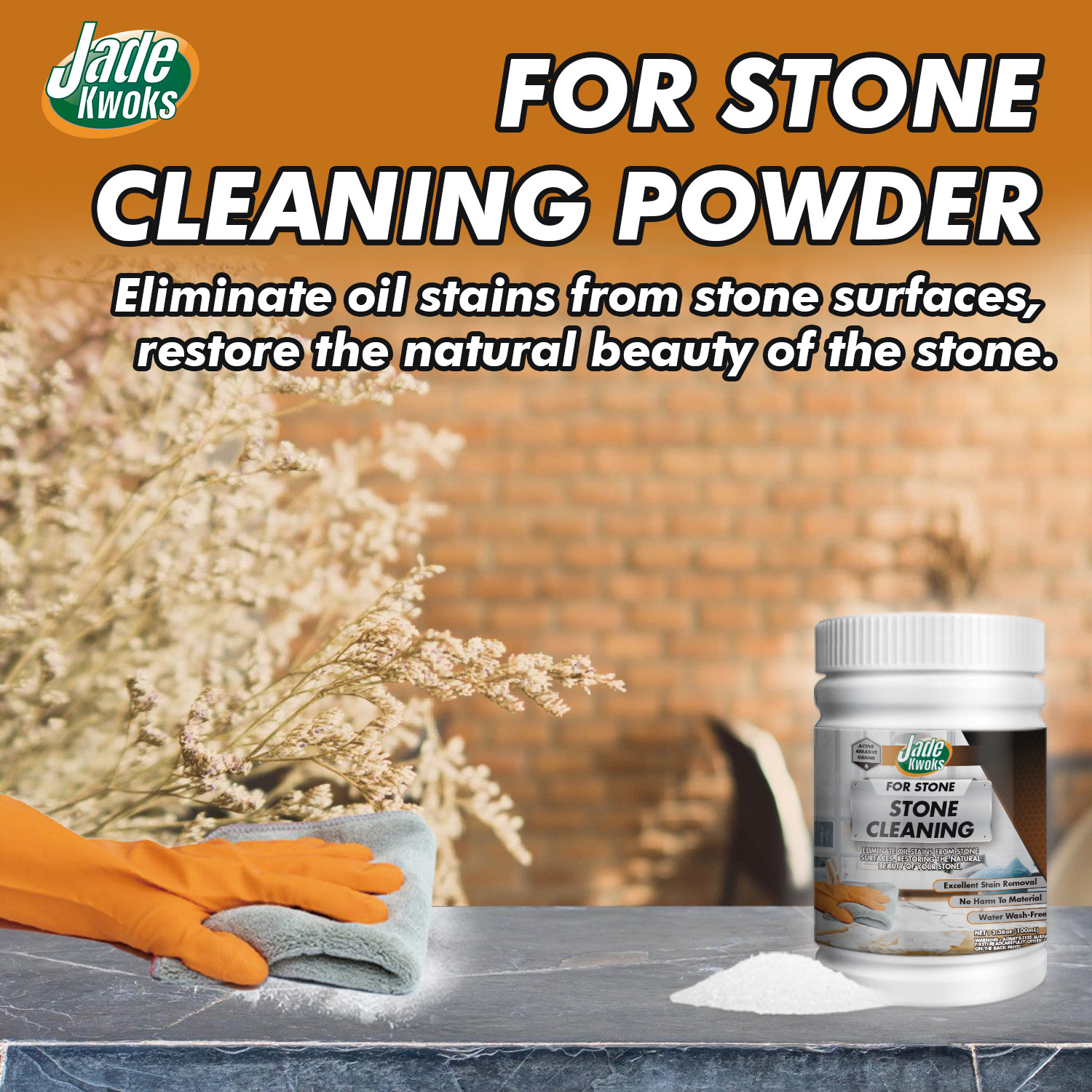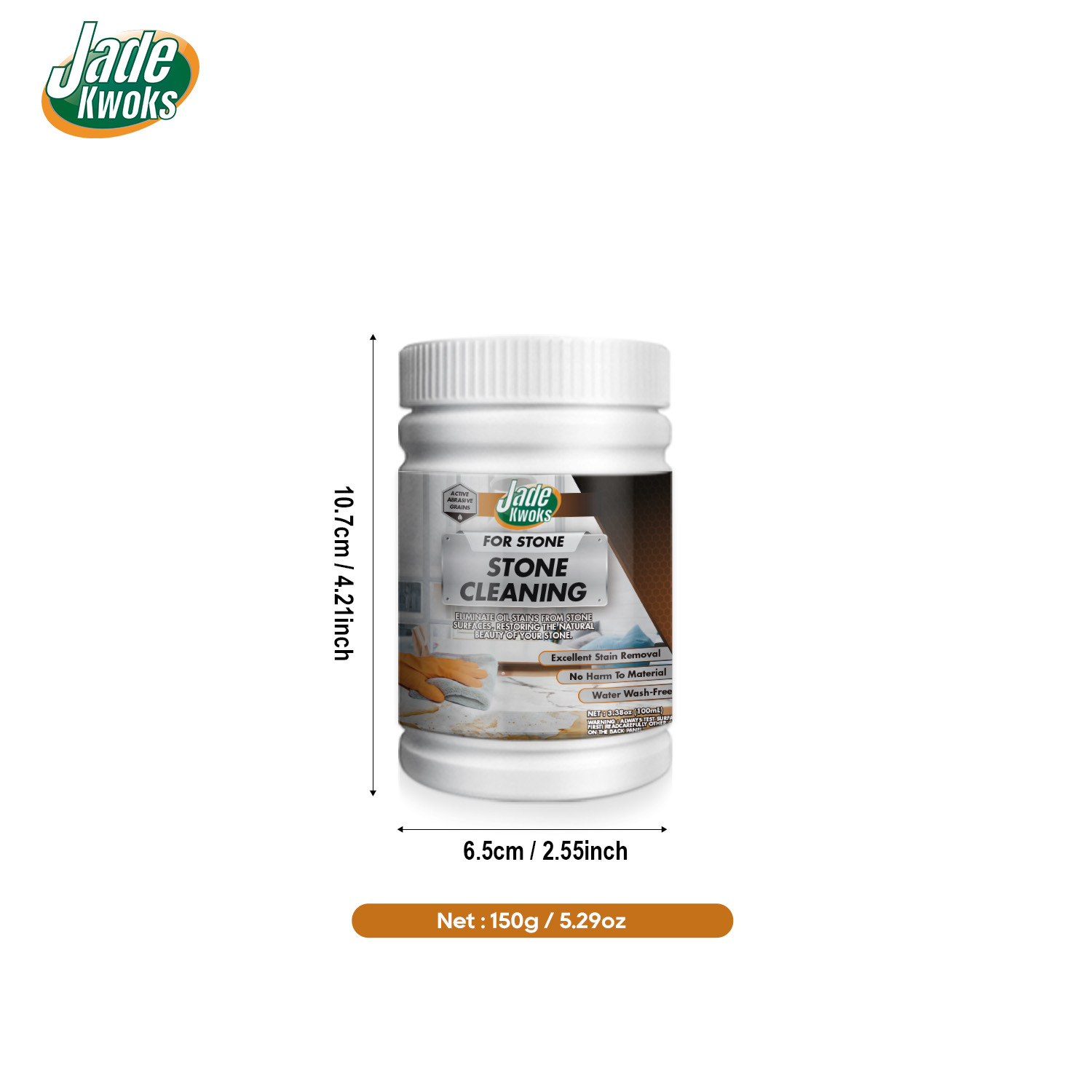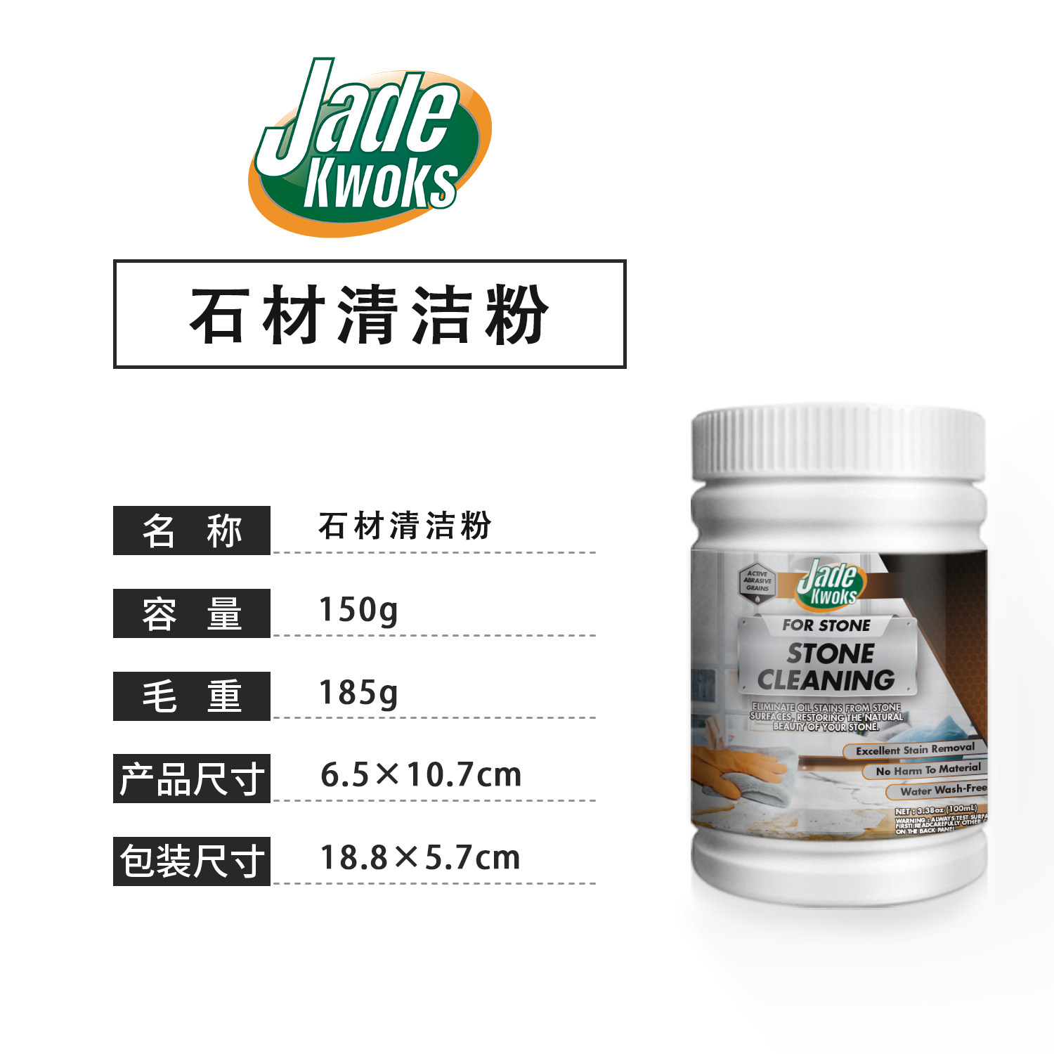 A product from the Jade KWOKS Furniture Cleaning Series, available in two specifications: 150g (5.29oz) and 185g. The product dimensions are 6.5×10.7cm, and the packaging dimensions are 18.8×5.7cm. Its core function is cleaning stone surfaces—it can remove oil stains, dirt and scale without damaging materials or requiring water washing, and restore the natural luster of stone. It is suitable for materials such as marble, granite, quartzite, ceramic tiles and floor tiles, and is especially suitable for cleaning kitchen quartz countertops. When using, keep the countertop dry, pour an appropriate amount of cleaning powder on a scouring pad and wipe the stained area repeatedly; for stubborn stains, use a cleaning brush to wipe multiple times (wiping time can be extended according to the stubbornness of the stains).