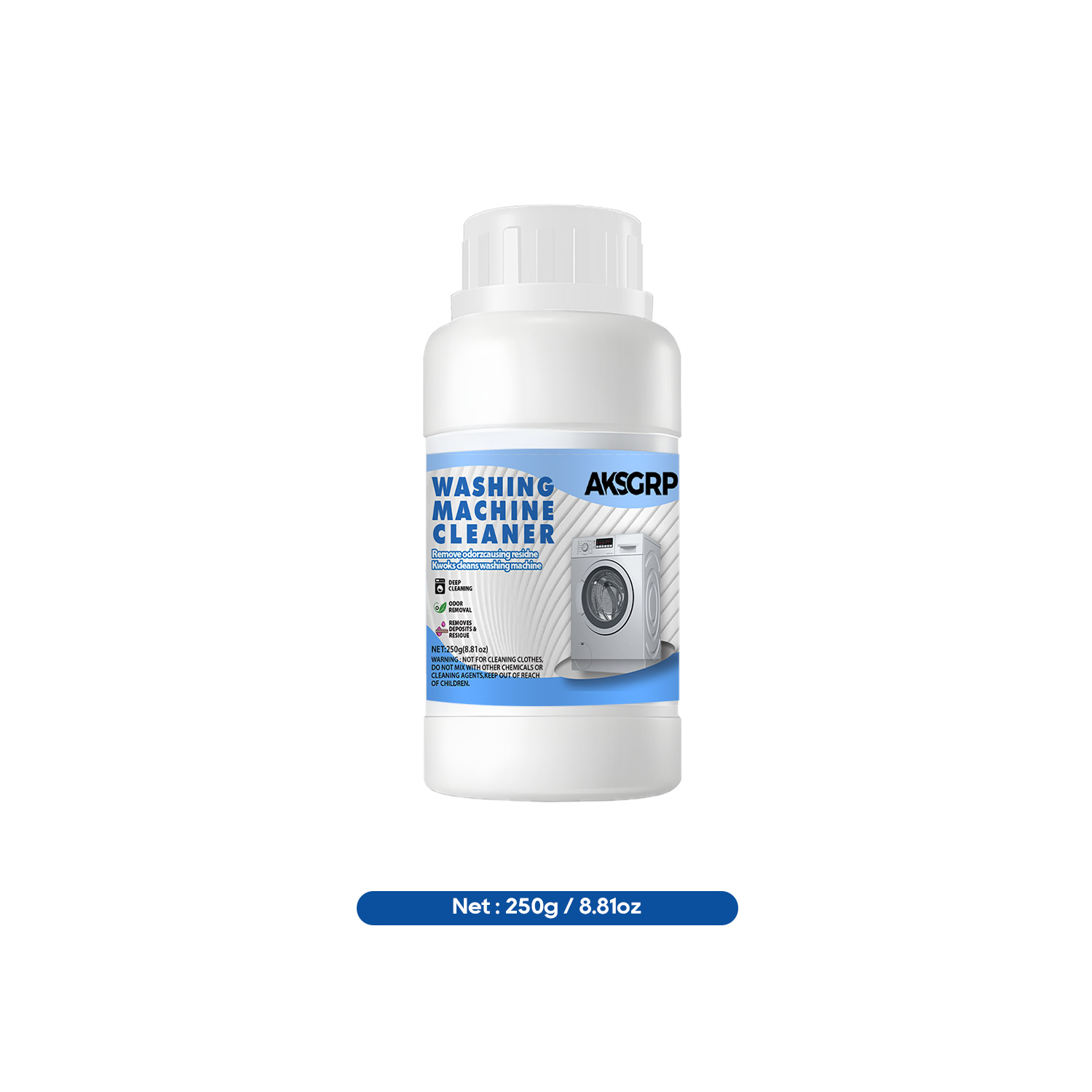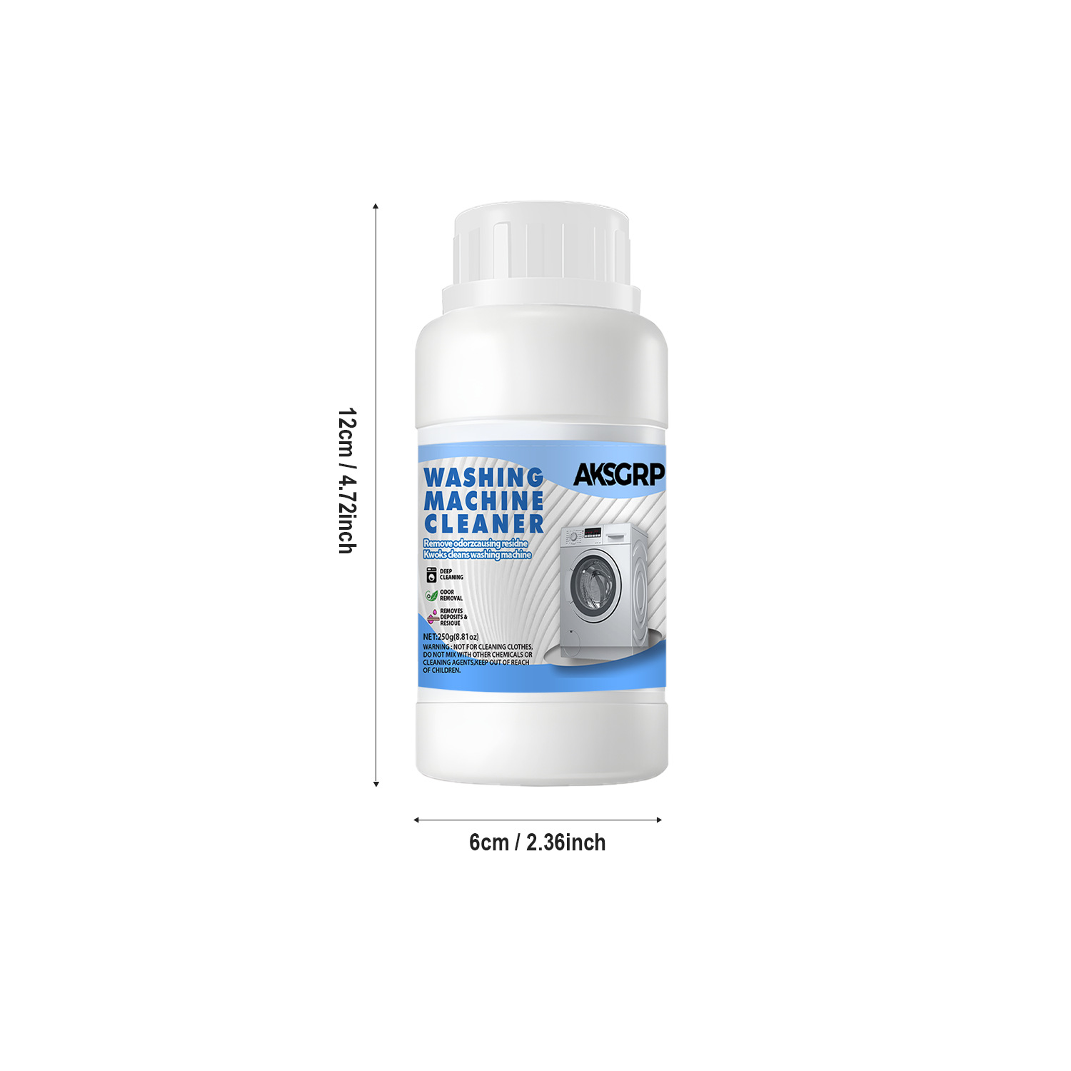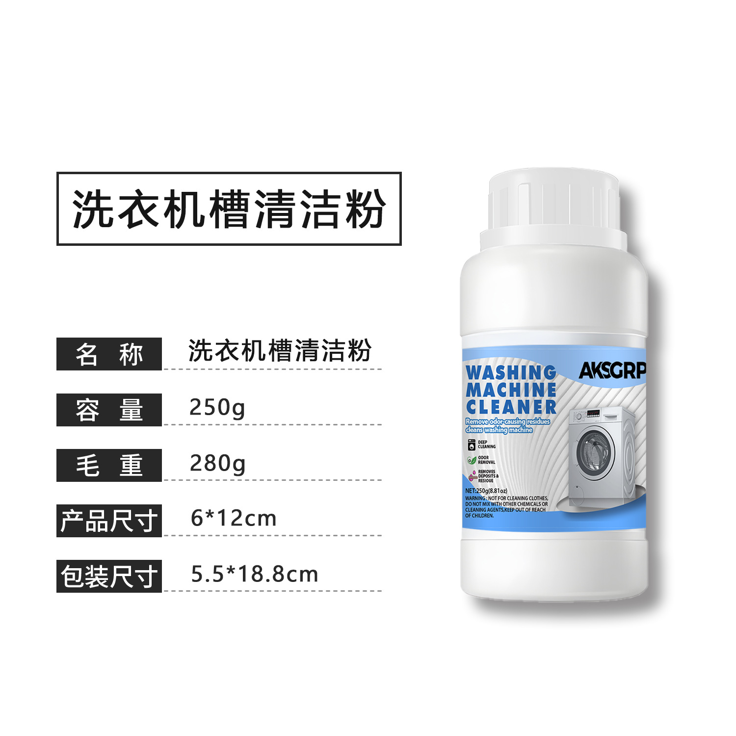 A product from both AKSGRP Home Appliance Cleaning and Laundry Cleaning Series, with a net weight of 250g (8.81oz) and product size including 6cm×12cm. Core functions: powerful tank scale removal, disinfection and sterilization, as well as eliminating residues and odors. It solves the problem of unclean clothes caused by dirt accumulation, suitable for both drum and impeller washers, with obvious effect before and after cleaning.