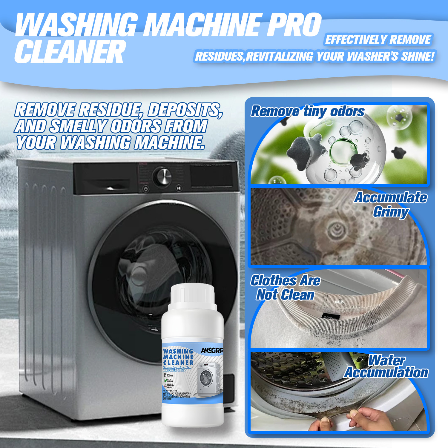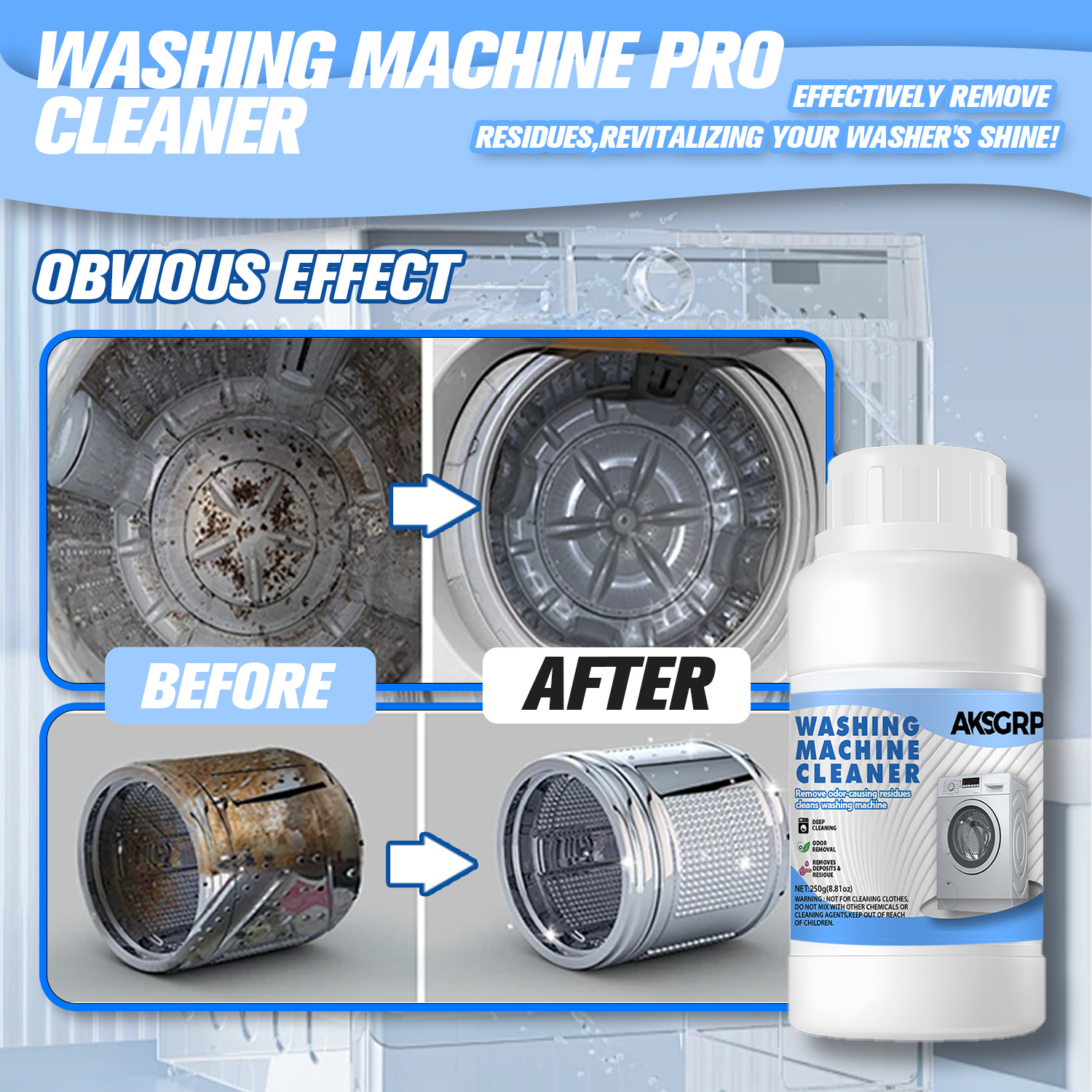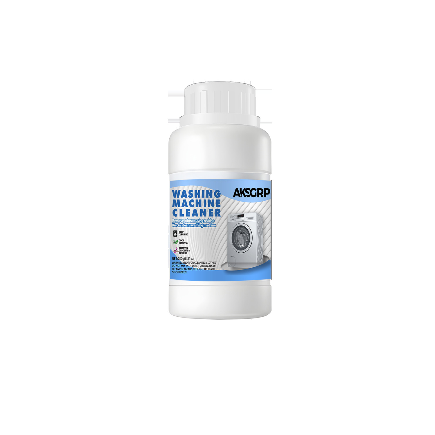 A product from both AKSGRP Home Appliance Cleaning and Laundry Cleaning Series, with a net weight of 250g (8.81oz) and product size including 6cm×12cm. Core functions: powerful tank scale removal, disinfection and sterilization, as well as eliminating residues and odors. It solves the problem of unclean clothes caused by dirt accumulation, suitable for both drum and impeller washers, with obvious effect before and after cleaning.