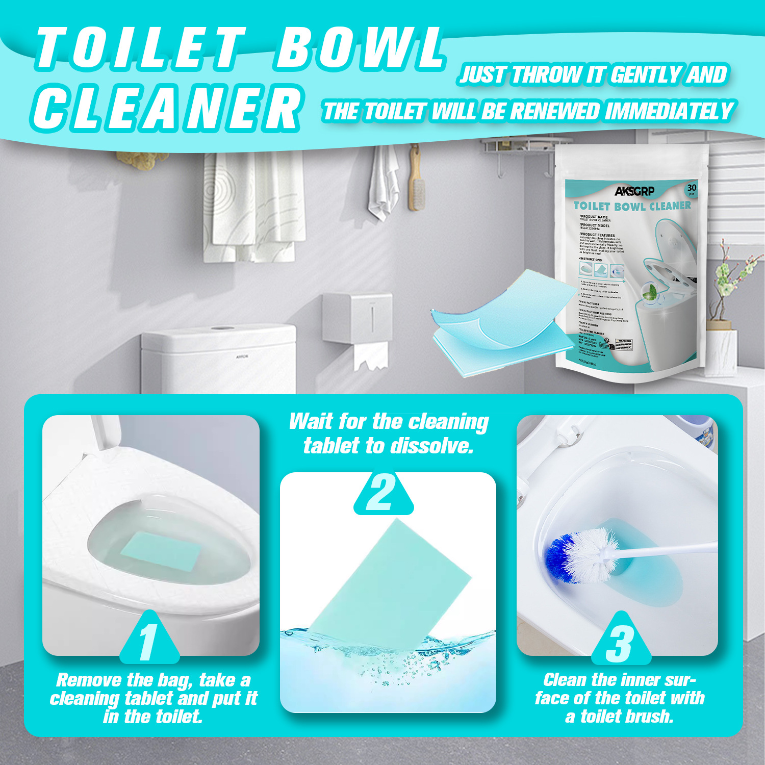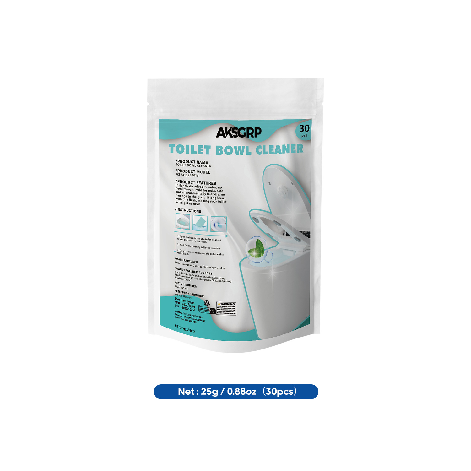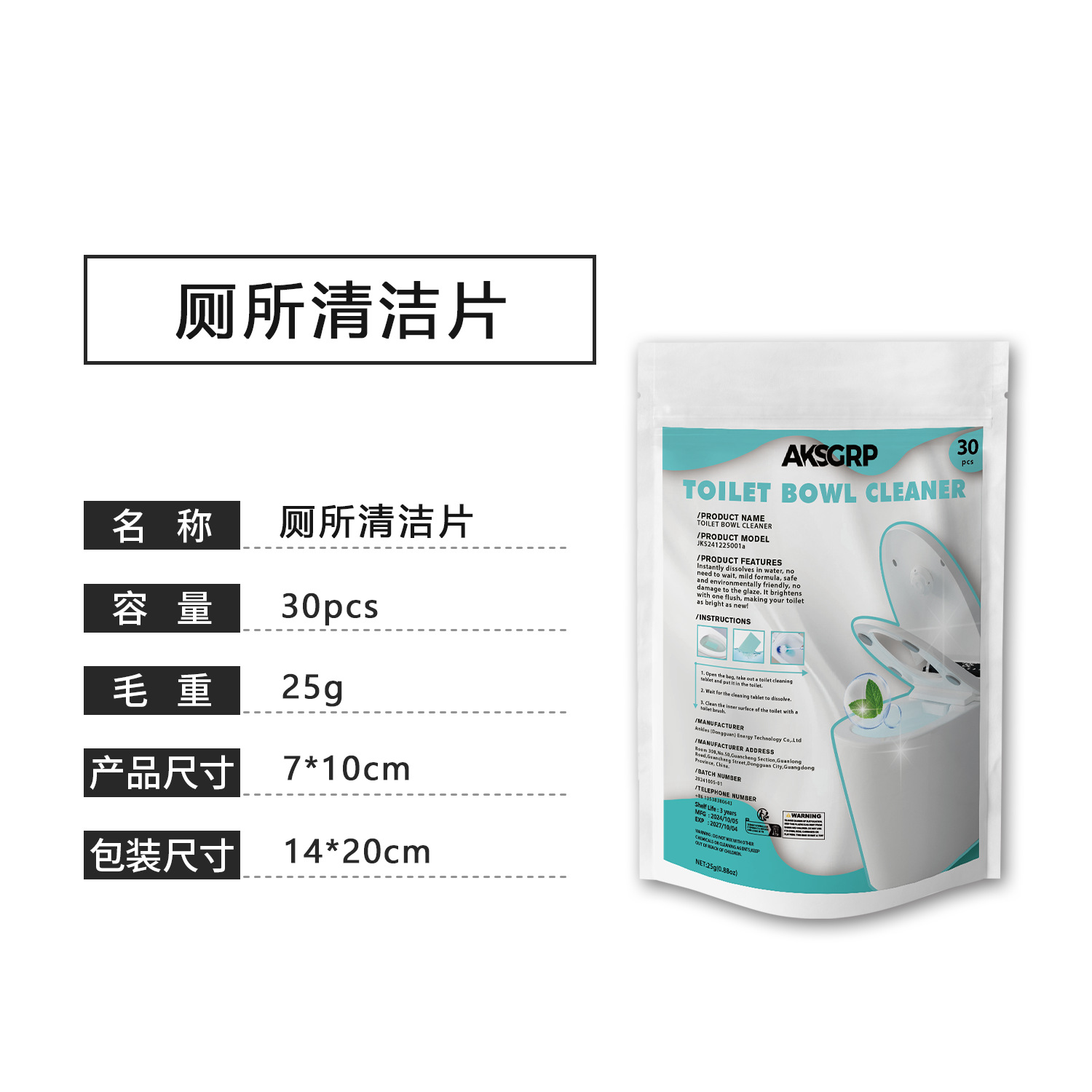 A product from the AKSGRP Multi-Purpose Cleaning Series, each box contains 30 tablets, with a single tablet of 25g (0.88oz). The packaging size is 14×20cm, and the product size is 7×10cm. Its core functions are removing toilet urine scale, solving yellowing and dirt problems, and eliminating odors—operation is so simple that “just throw it gently to renew the toilet immediately”. The usage has three steps: unpack and take 1 tablet into the toilet, wait for the tablet to dissolve, and finally clean the inner wall with a toilet brush, suitable for daily toilet cleaning needs.