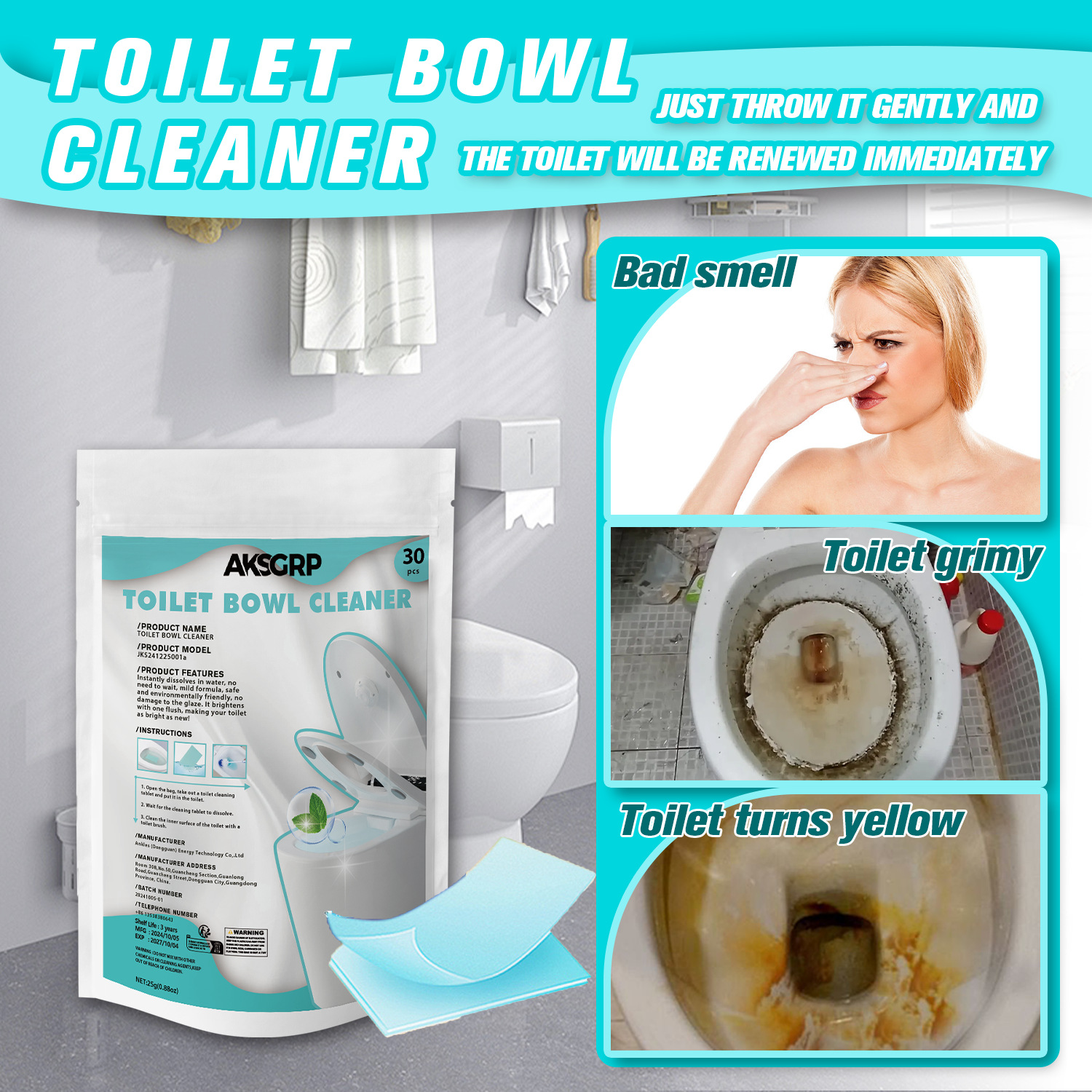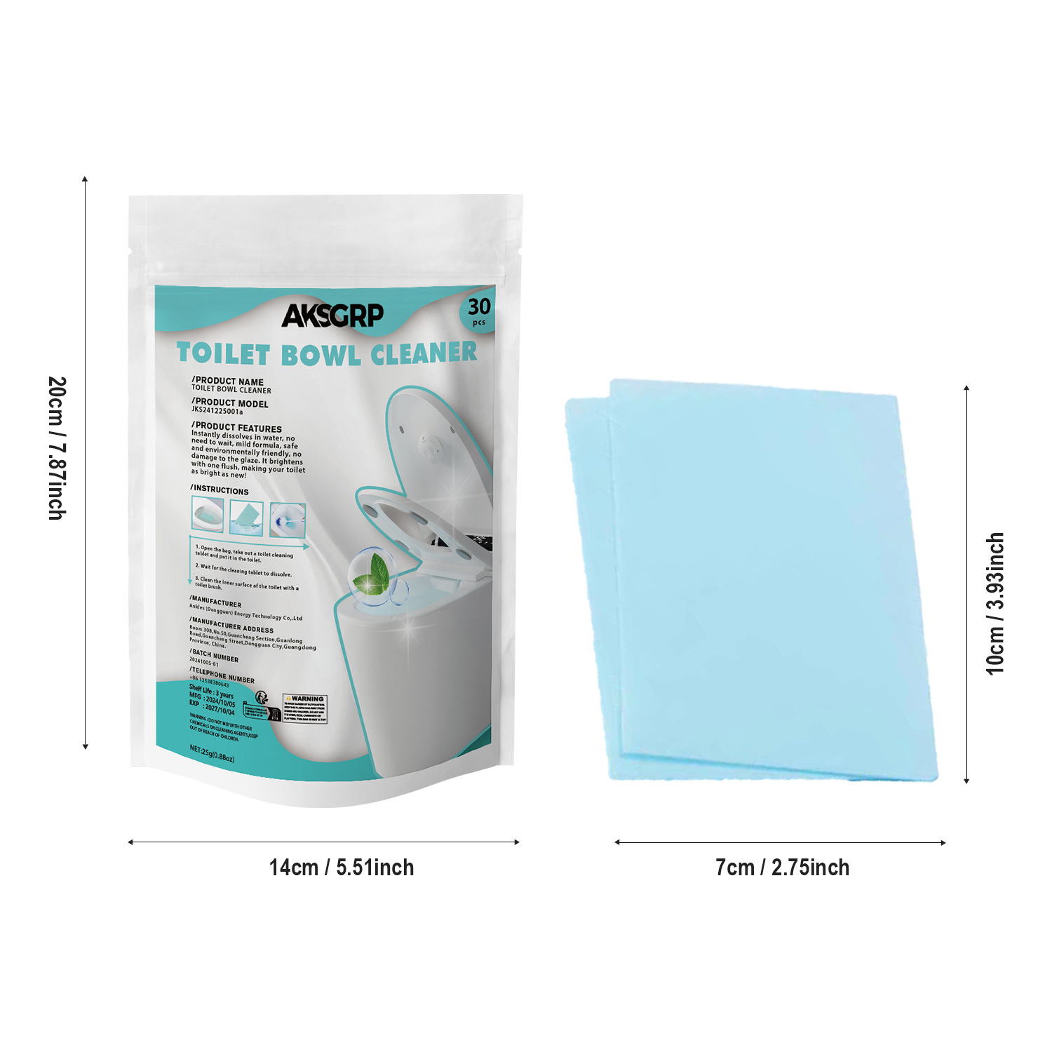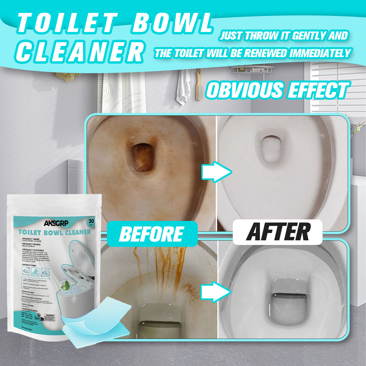 A product from the AKSGRP Multi-Purpose Cleaning Series, each box contains 30 tablets, with a single tablet of 25g (0.88oz). The packaging size is 14×20cm, and the product size is 7×10cm. Its core functions are removing toilet urine scale, solving yellowing and dirt problems, and eliminating odors—operation is so simple that “just throw it gently to renew the toilet immediately”. The usage has three steps: unpack and take 1 tablet into the toilet, wait for the tablet to dissolve, and finally clean the inner wall with a toilet brush, suitable for daily toilet cleaning needs.
