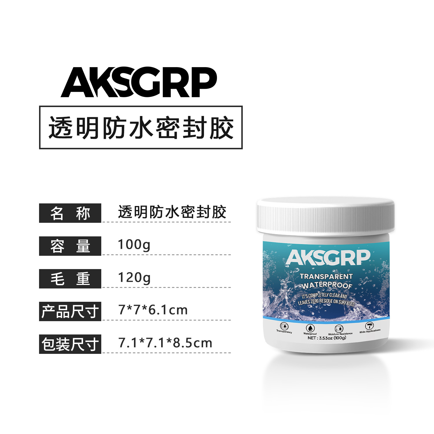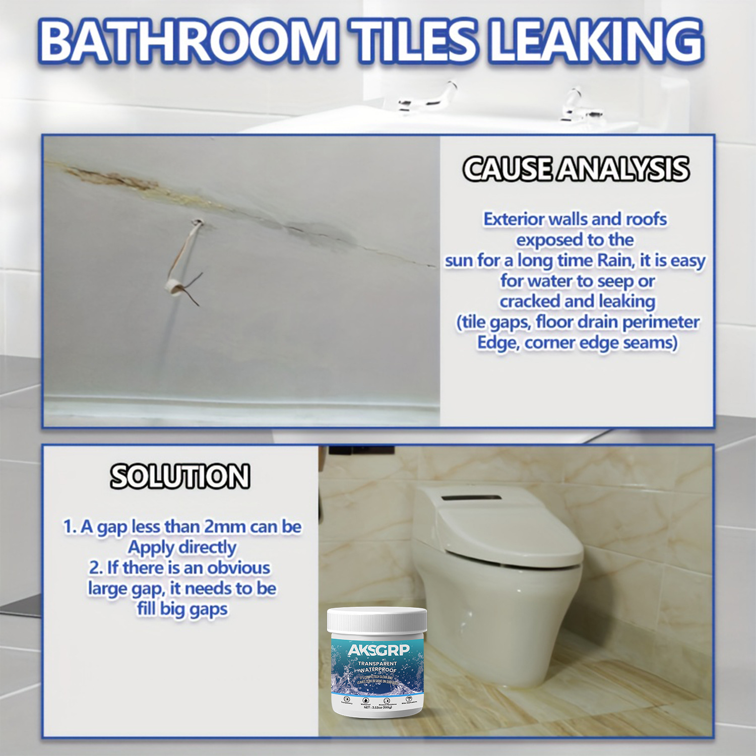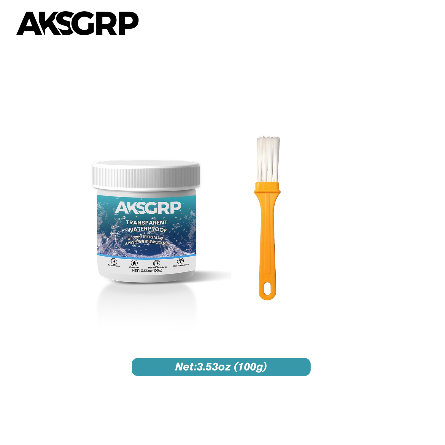 From AKSGRP Multi-Purpose Repair Series (also Tile & Wall Repair Series), 100g (3.53oz) capacity. Key advantages: tile-safe, fully clear with zero residue, strong adhesion, upgraded to stop leaks with one brush. Suitable for bathrooms/roofs, solving leaks in tile gaps, floor drains, and seepage on exterior walls/roofs. No appearance impact after curing; clean the surface first and wait 24h for film-forming.