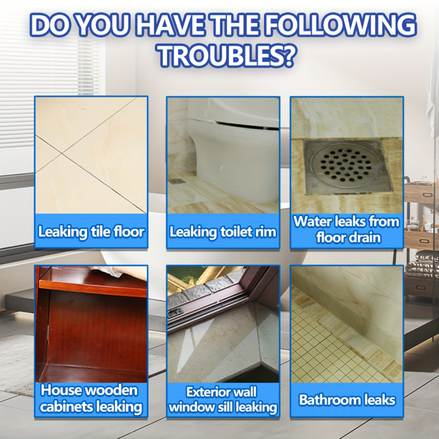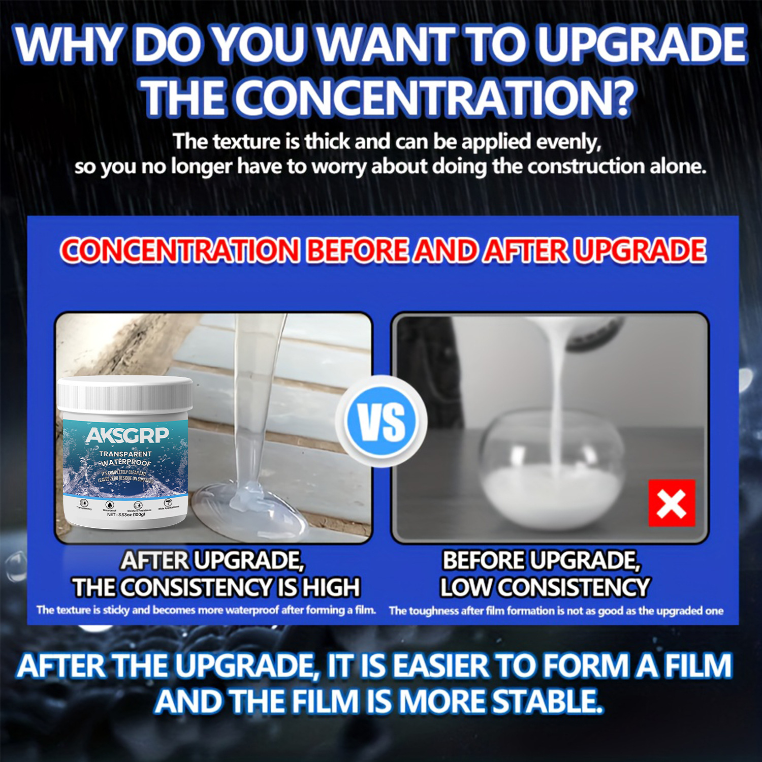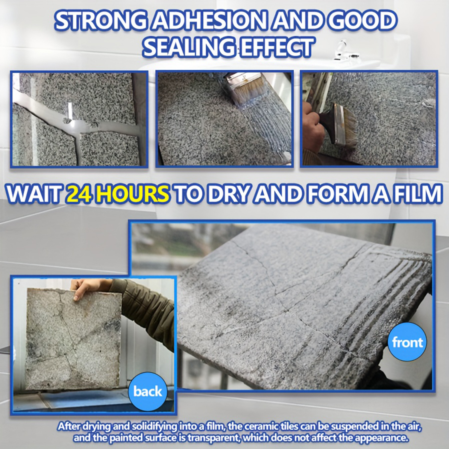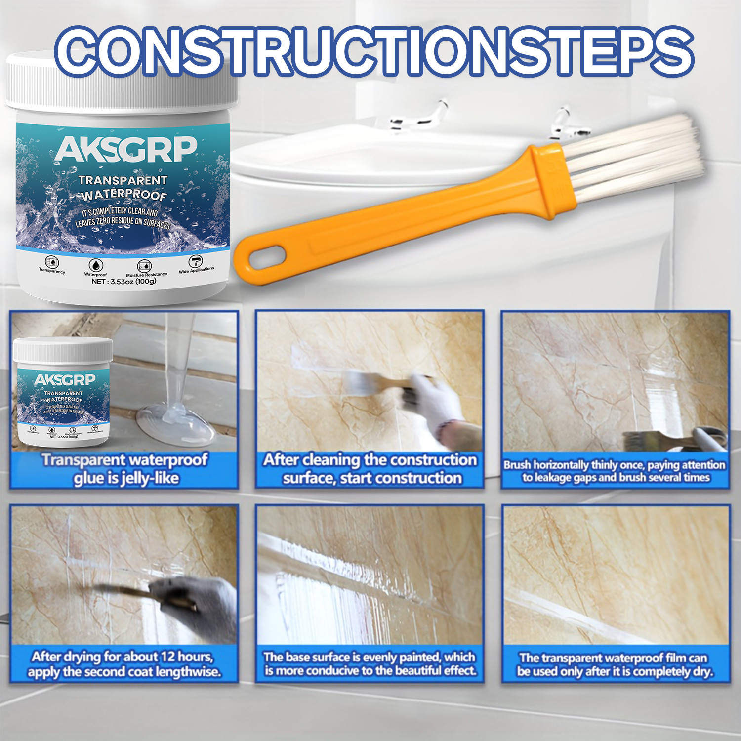 From AKSGRP Multi-Purpose Repair Series (also Tile & Wall Repair Series), 100g (3.53oz) capacity. Key advantages: tile-safe, fully clear with zero residue, strong adhesion, upgraded to stop leaks with one brush. Suitable for bathrooms/roofs, solving leaks in tile gaps, floor drains, and seepage on exterior walls/roofs. No appearance impact after curing; clean the surface first and wait 24h for film-forming.
