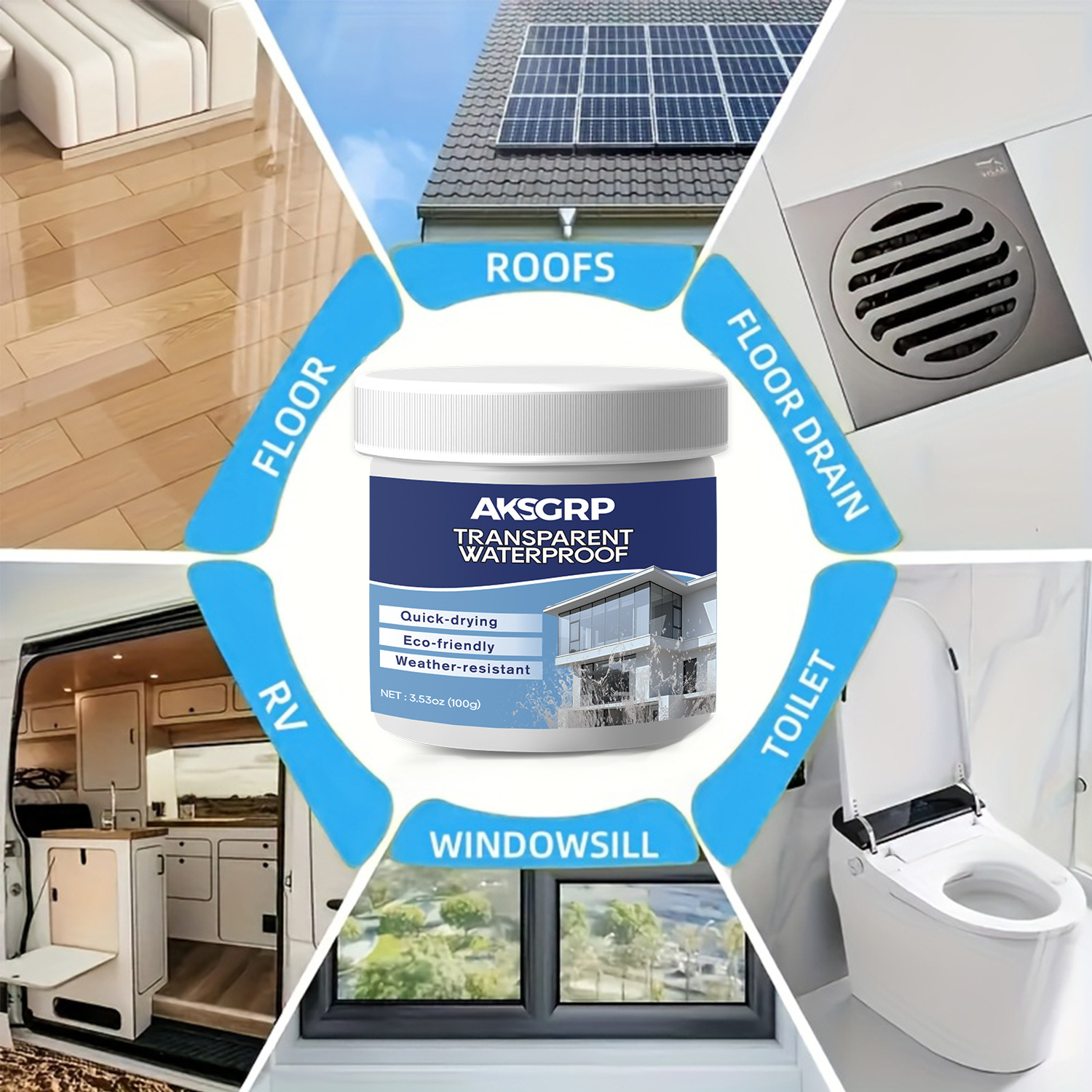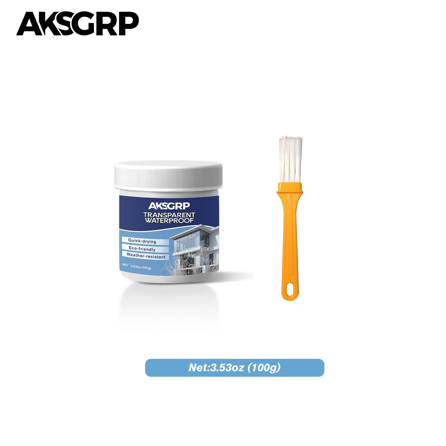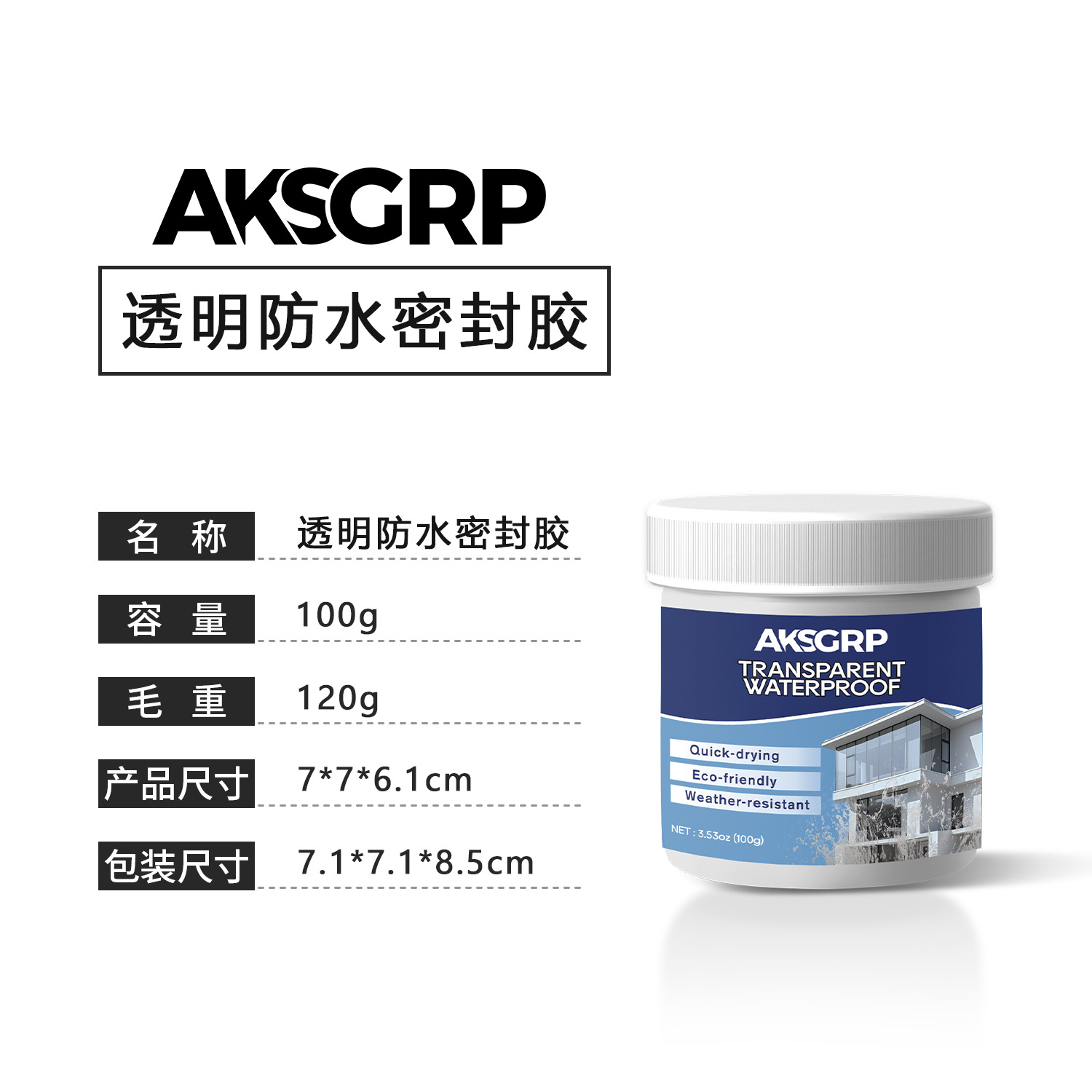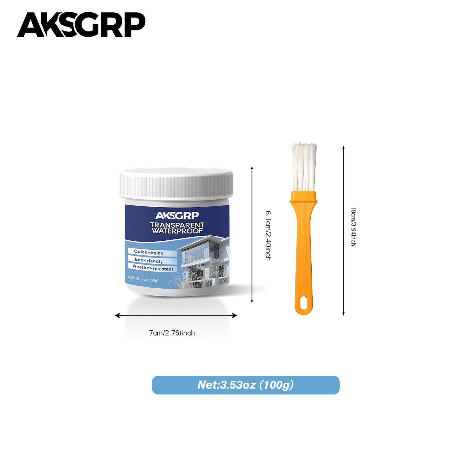 From AKSGRP Multi-Purpose Repair Series (also Tile & Wall Repair Series), 100g (3.53oz) capacity, product size 7×7×6.1cm, packaging size 7.1×7.1×8.5cm. Key advantages: quick-drying, eco-friendly, weather-resistant, forming an invisible waterproof layer, mainly for cross-border sales. Suitable for bathroom tile gaps, roofs, toilet-floor gaps, and solves leaks in exterior wall windows, pipe cracks, wall seepage by sealing tiny base pores.