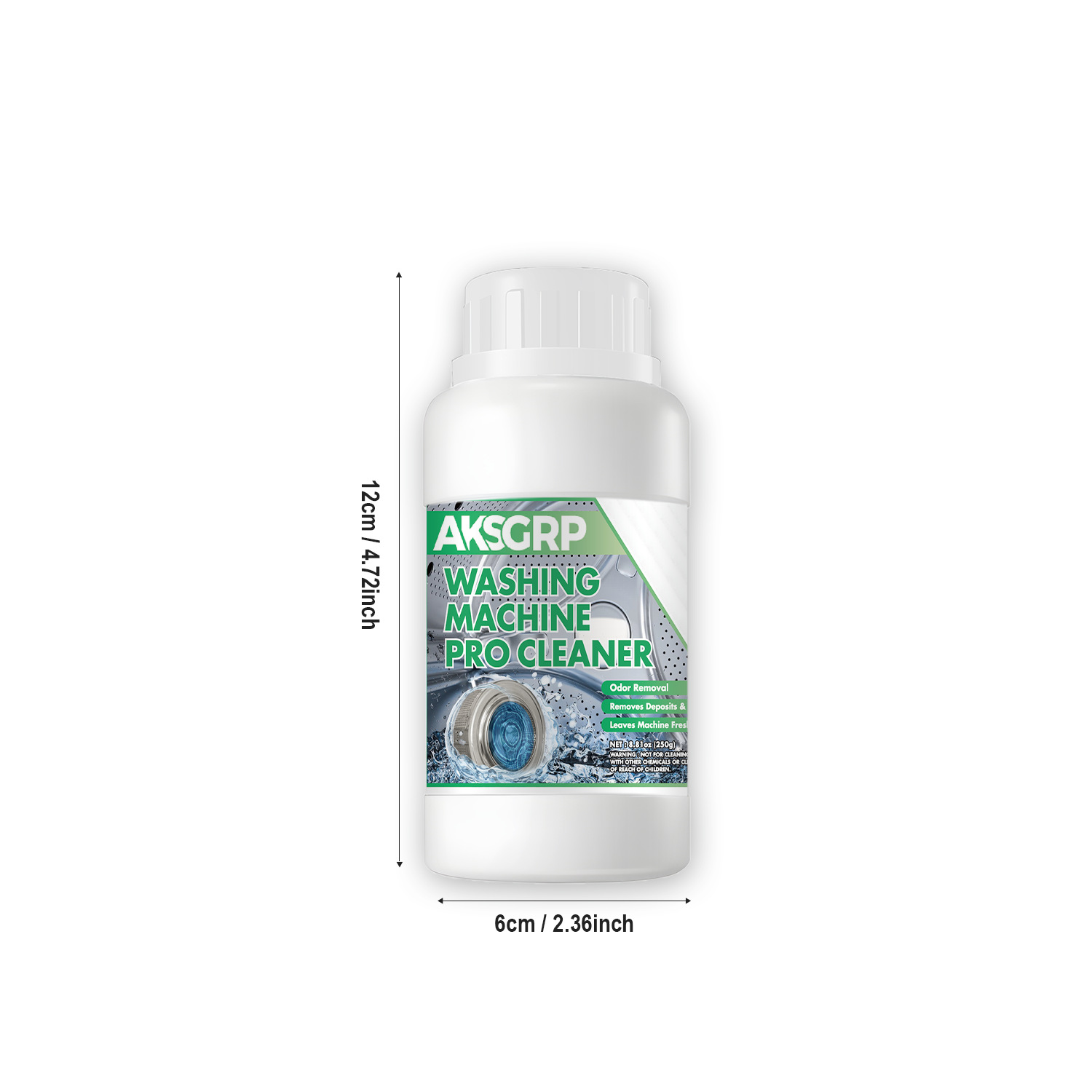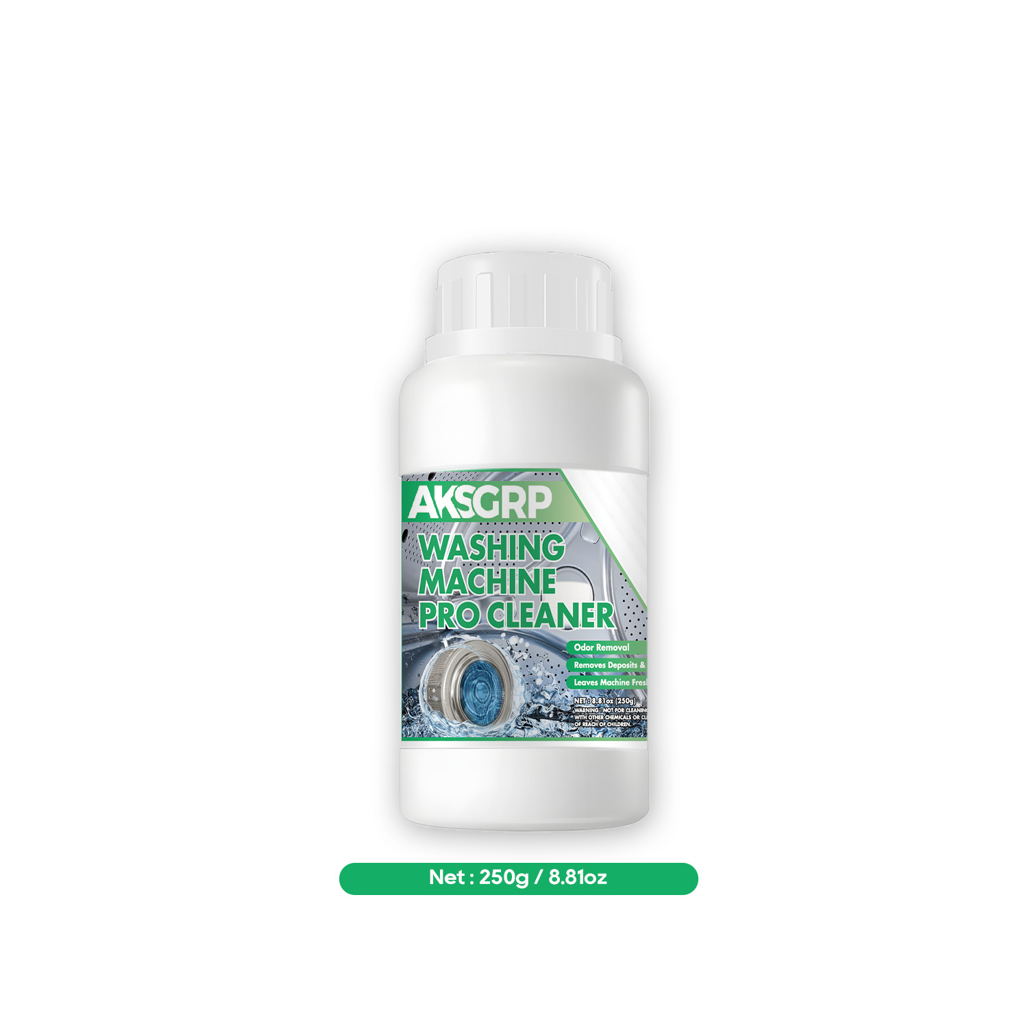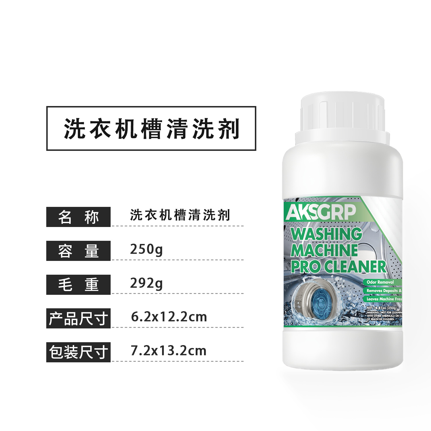 A product from the AKSGRP Home Appliance Cleaning Series, with a net weight of 250g (8.81oz). Product size is 6.2×12.2cm, packaging size is 7.2×13.2cm. Its core functions are antibacterial, descaling and odor elimination. It removes dirt residue accumulated in washing machine pipes and crevices, leaving the machine clean and fresh to prevent residue from contaminating clothes.