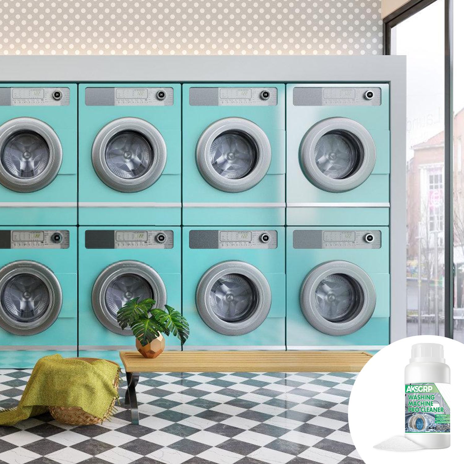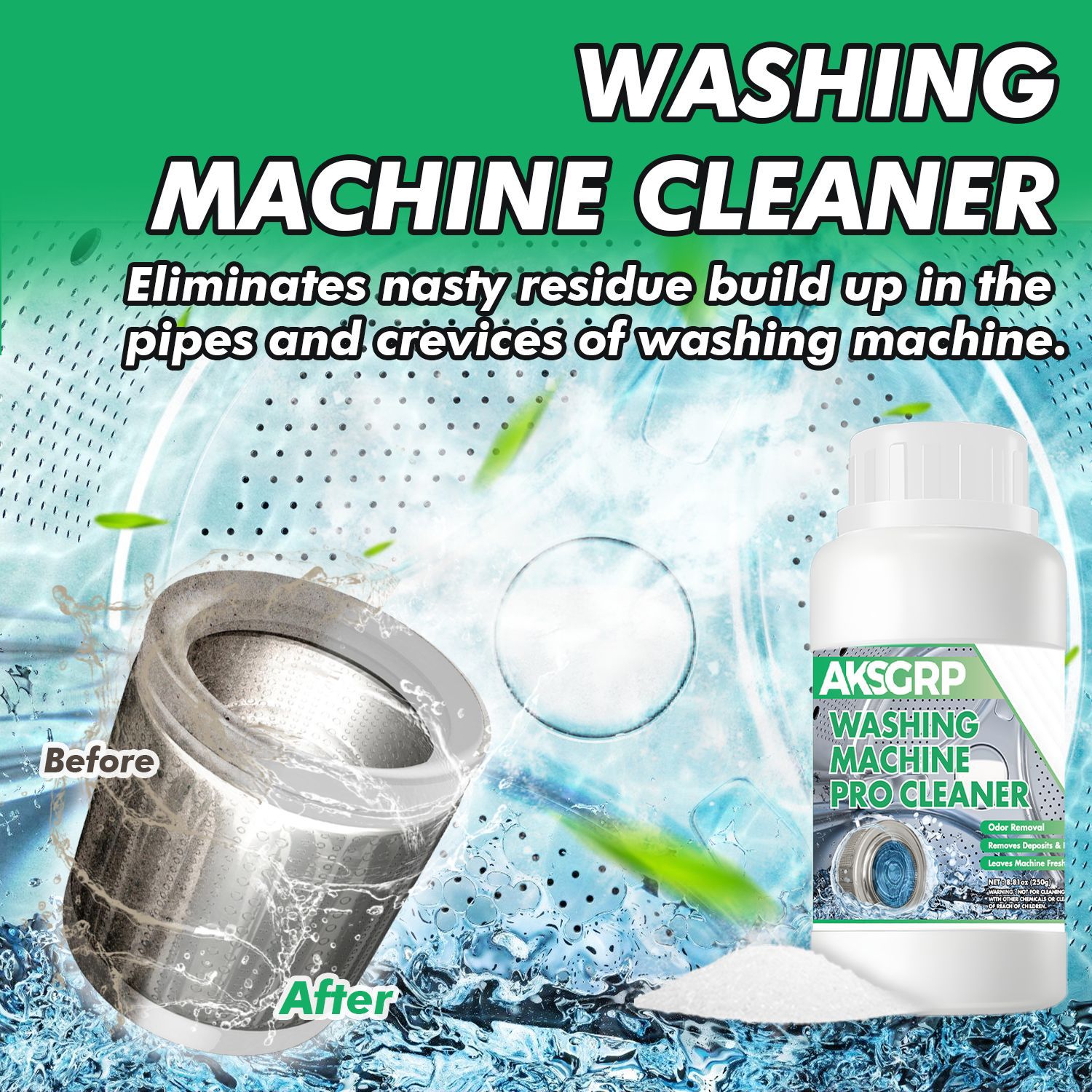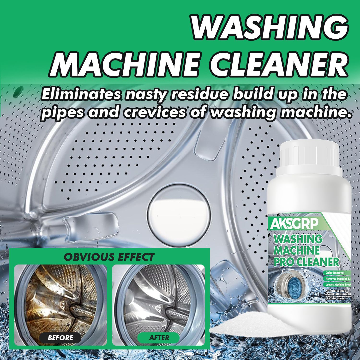 A product from the AKSGRP Home Appliance Cleaning Series, with a net weight of 250g (8.81oz). Product size is 6.2×12.2cm, packaging size is 7.2×13.2cm. Its core functions are antibacterial, descaling and odor elimination. It removes dirt residue accumulated in washing machine pipes and crevices, leaving the machine clean and fresh to prevent residue from contaminating clothes.