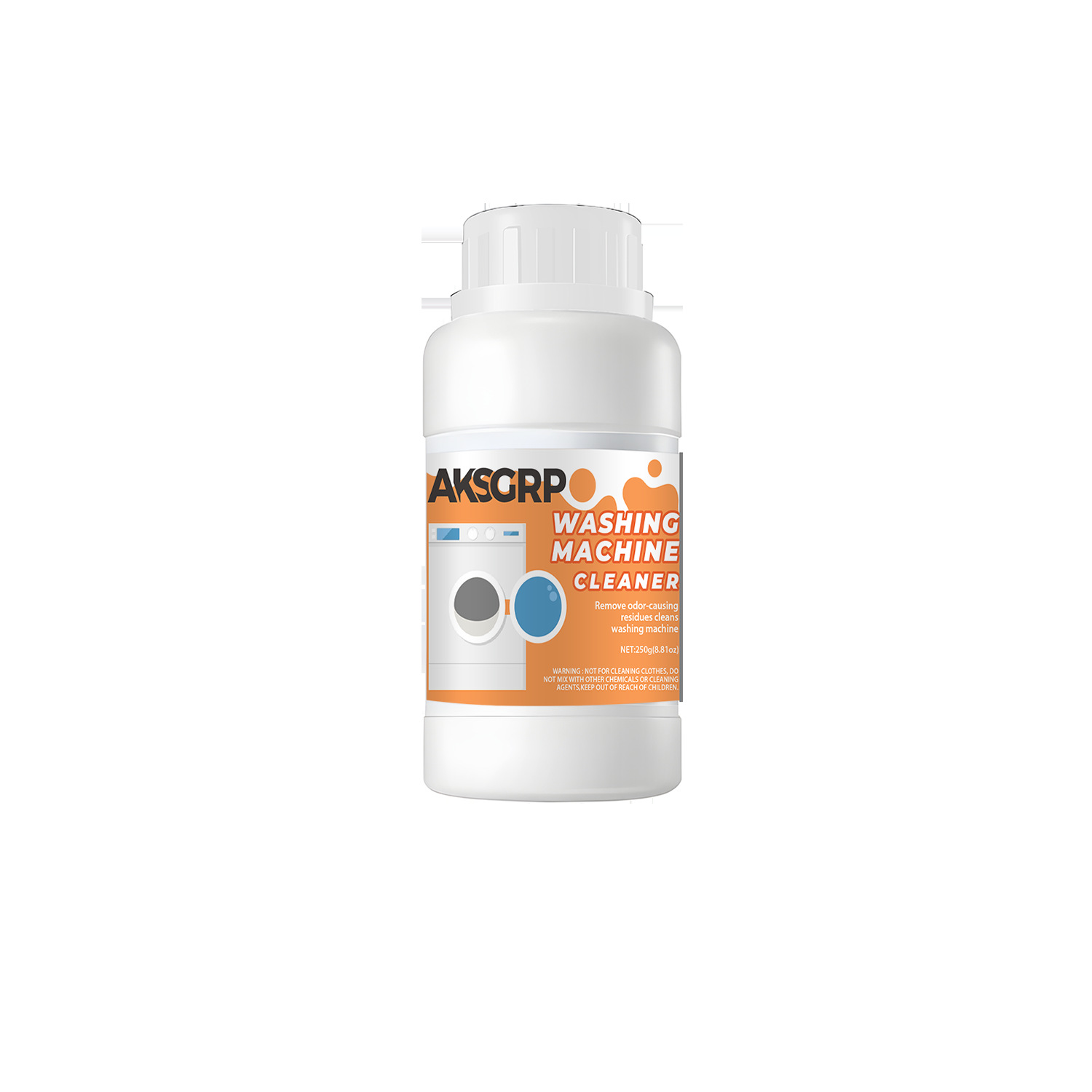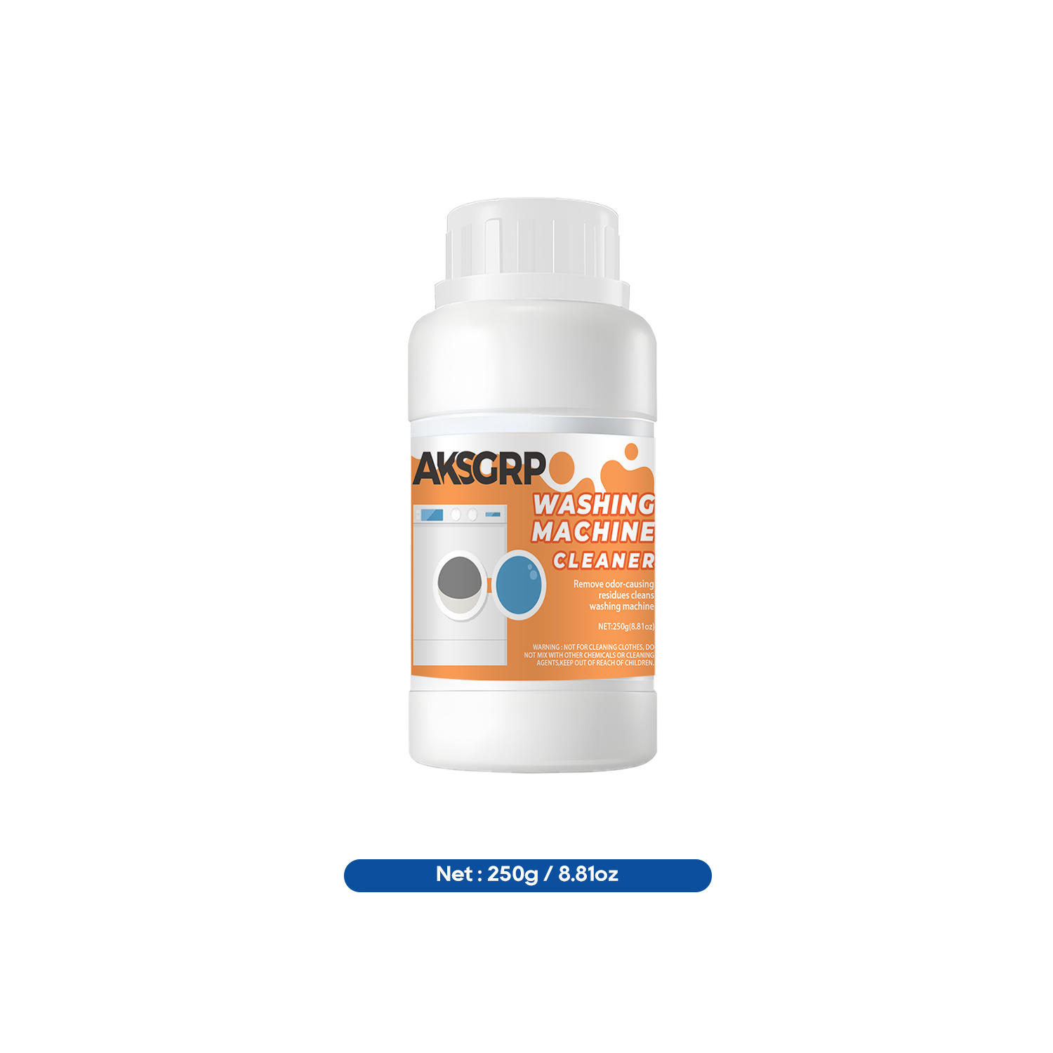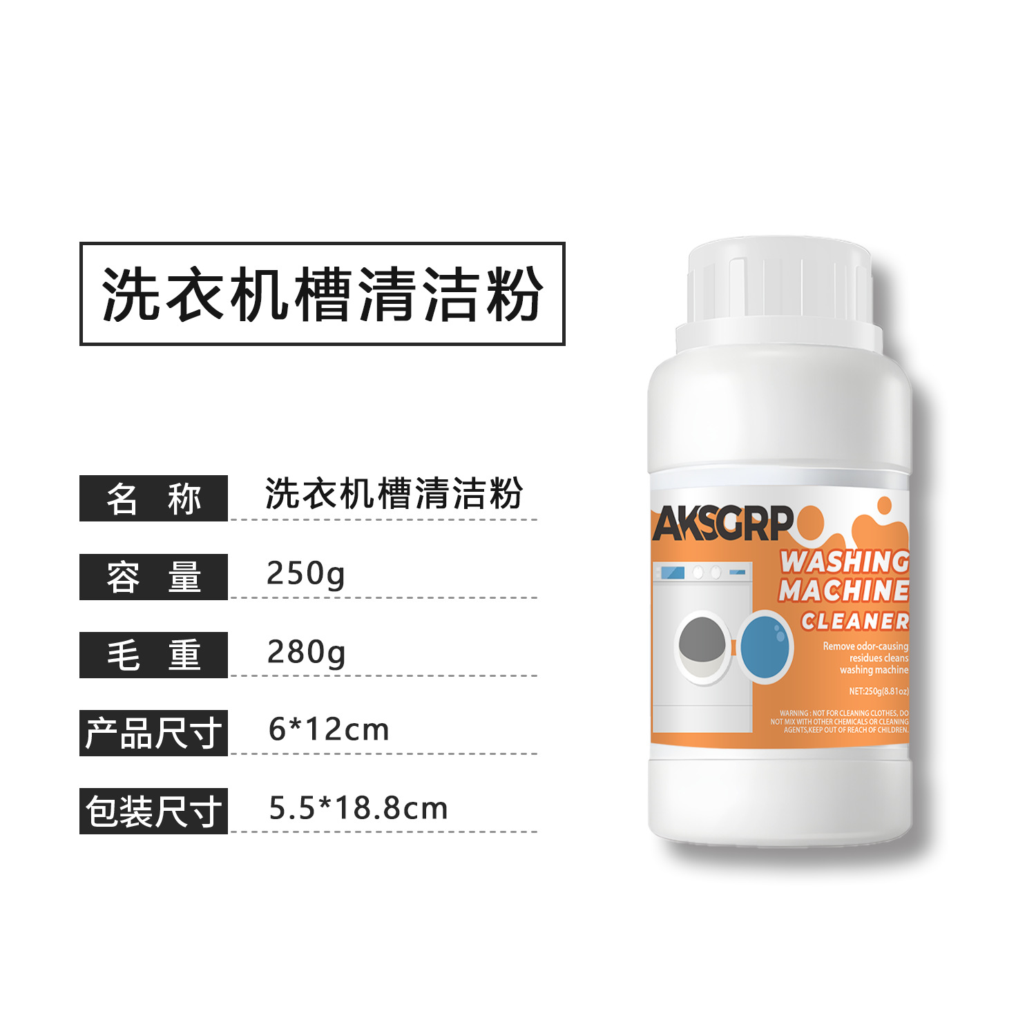 A product from the AKSGRP Home Appliance Cleaning Series, with 250g (8.81oz) capacity, 280g gross weight, product size 6×12cm, packaging size 5.5×18.8cm. Core functions: powerful cleaning and mold removal, eliminating odor-causing residues in the washing machine. Suitable for both drum and impeller washers. 4-step use: add proper amount of powder, run for 15 minutes, soak for 3 hours, then wipe residues. It improves hidden dirt problems inside the washer after cleaning.