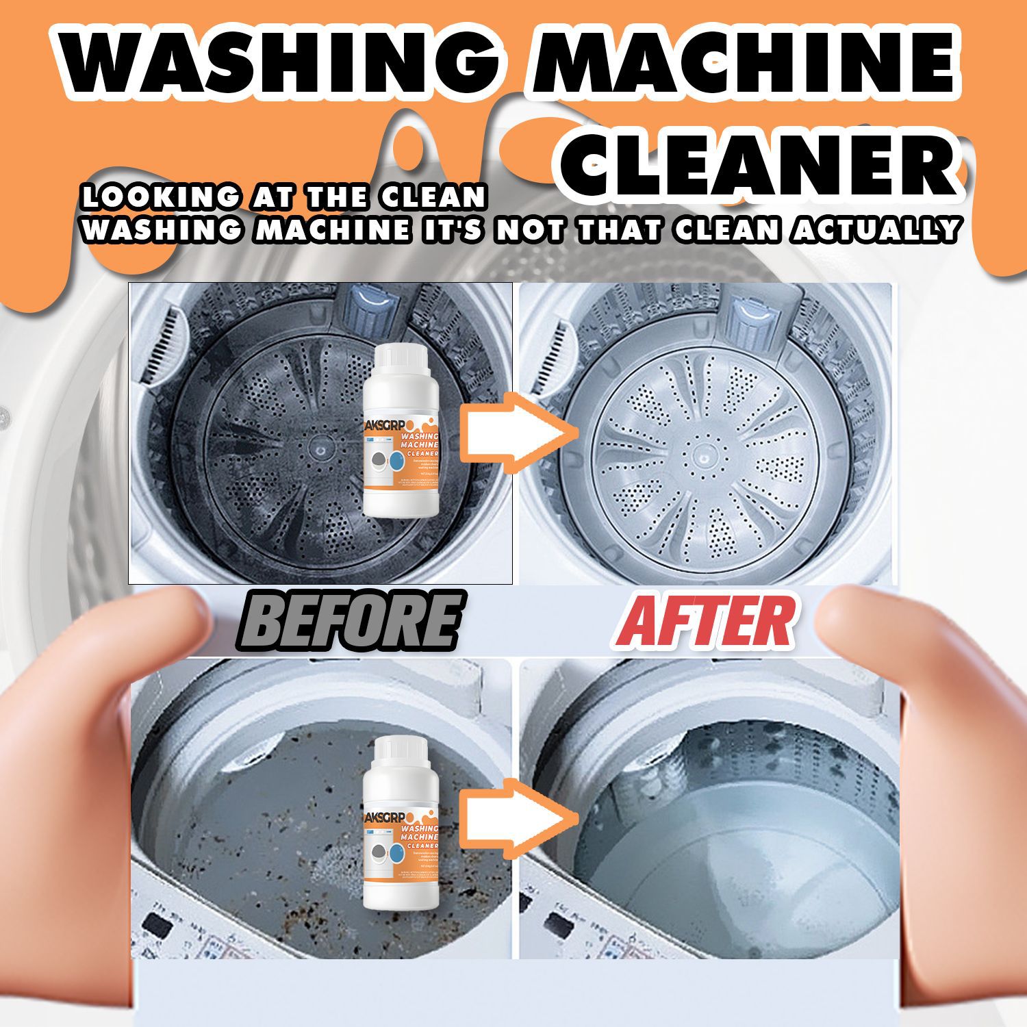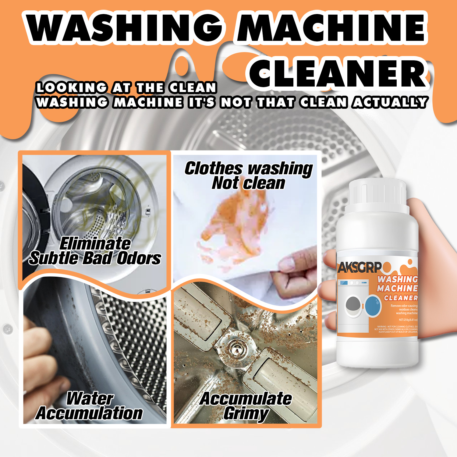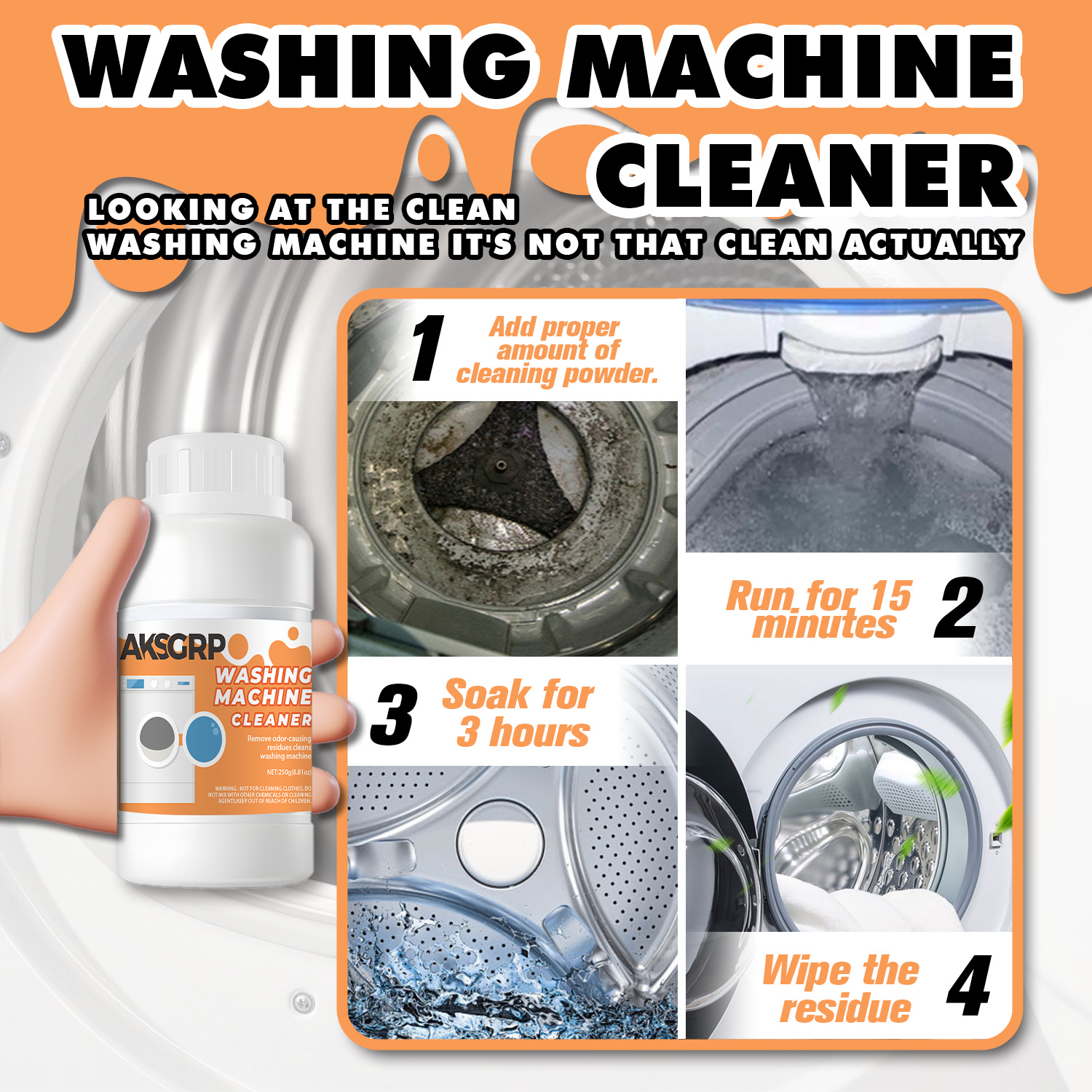 A product from the AKSGRP Home Appliance Cleaning Series, with 250g (8.81oz) capacity, 280g gross weight, product size 6×12cm, packaging size 5.5×18.8cm. Core functions: powerful cleaning and mold removal, eliminating odor-causing residues in the washing machine. Suitable for both drum and impeller washers. 4-step use: add proper amount of powder, run for 15 minutes, soak for 3 hours, then wipe residues. It improves hidden dirt problems inside the washer after cleaning.