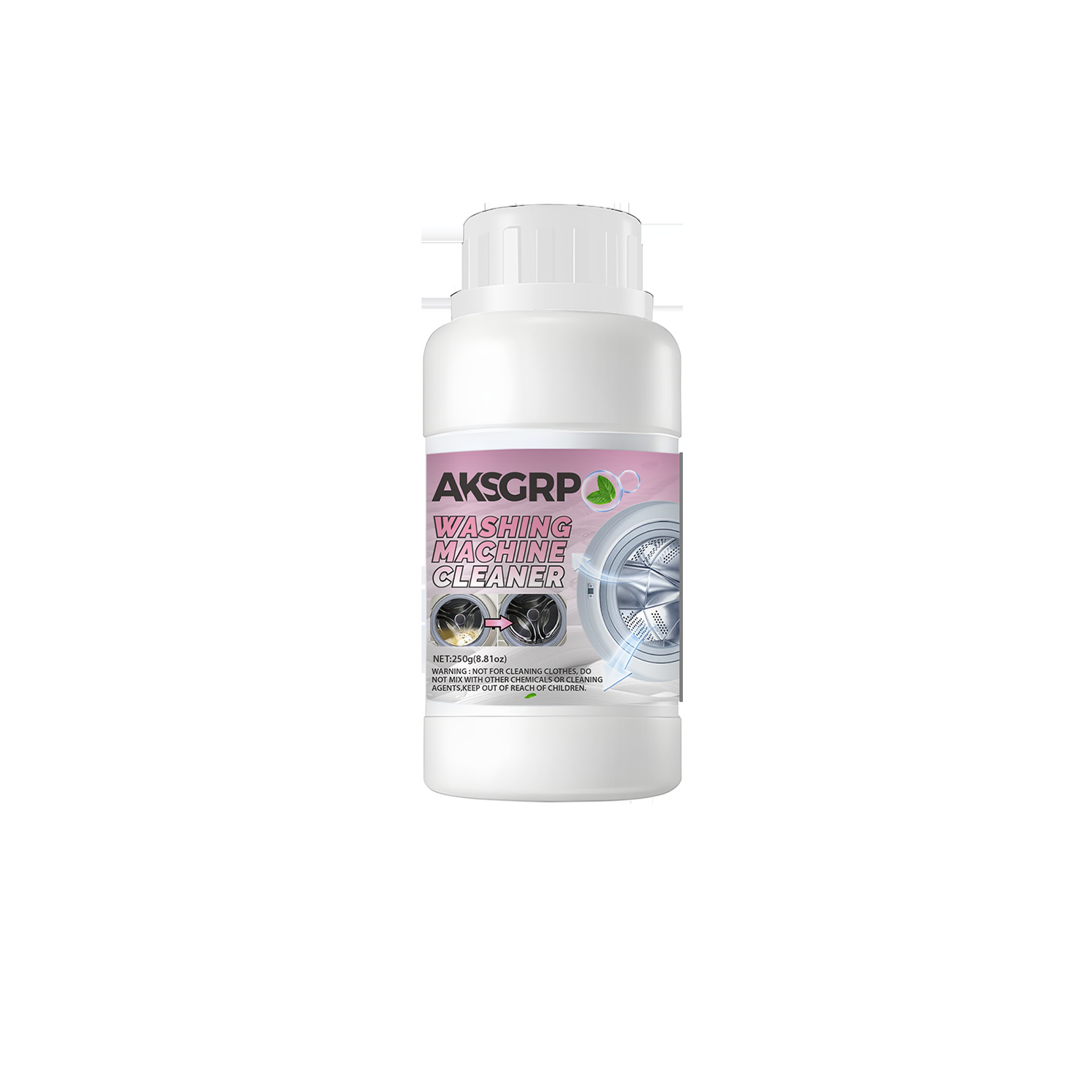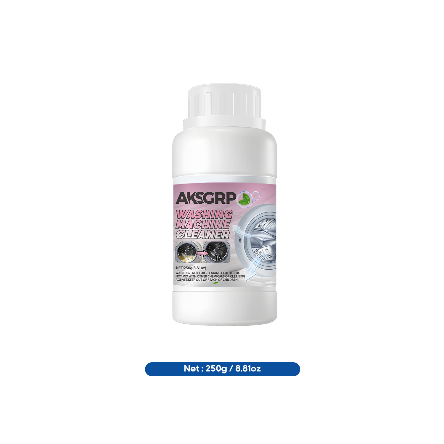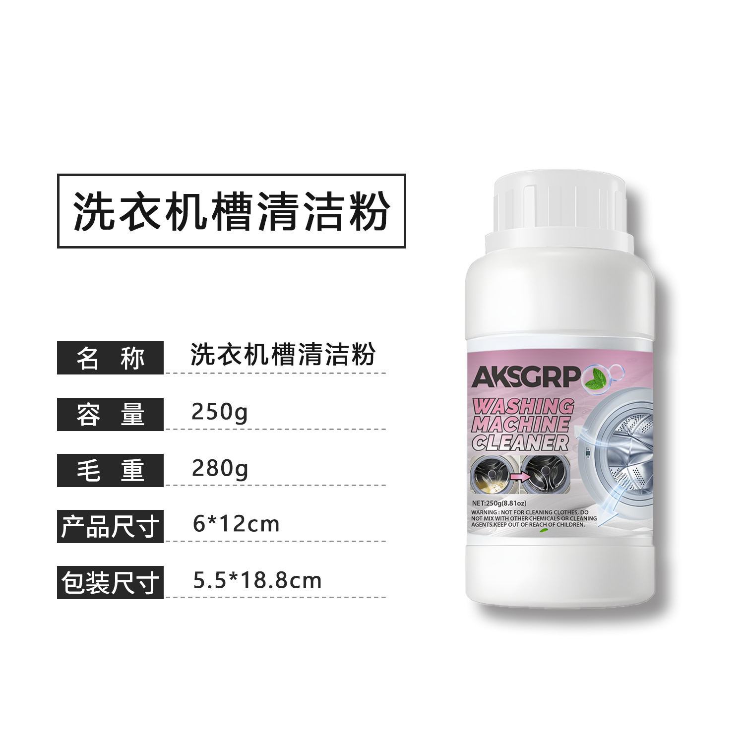 A product from the AKSGRP Home Appliance Cleaning Series, with a net weight of 250g (8.81oz). Product size is 6×12cm, packaging size is 5.5×18.8cm. Core functions: powerful descaling and disinfecting, removing accumulated dirt and odors in the washing machine to solve the problem of unclean clothes. Suitable for both impeller and drum washing machines. 4-step use: add proper amount of powder, run for 15 minutes, soak for 3 hours, then wipe residues. Keep out of reach of children.