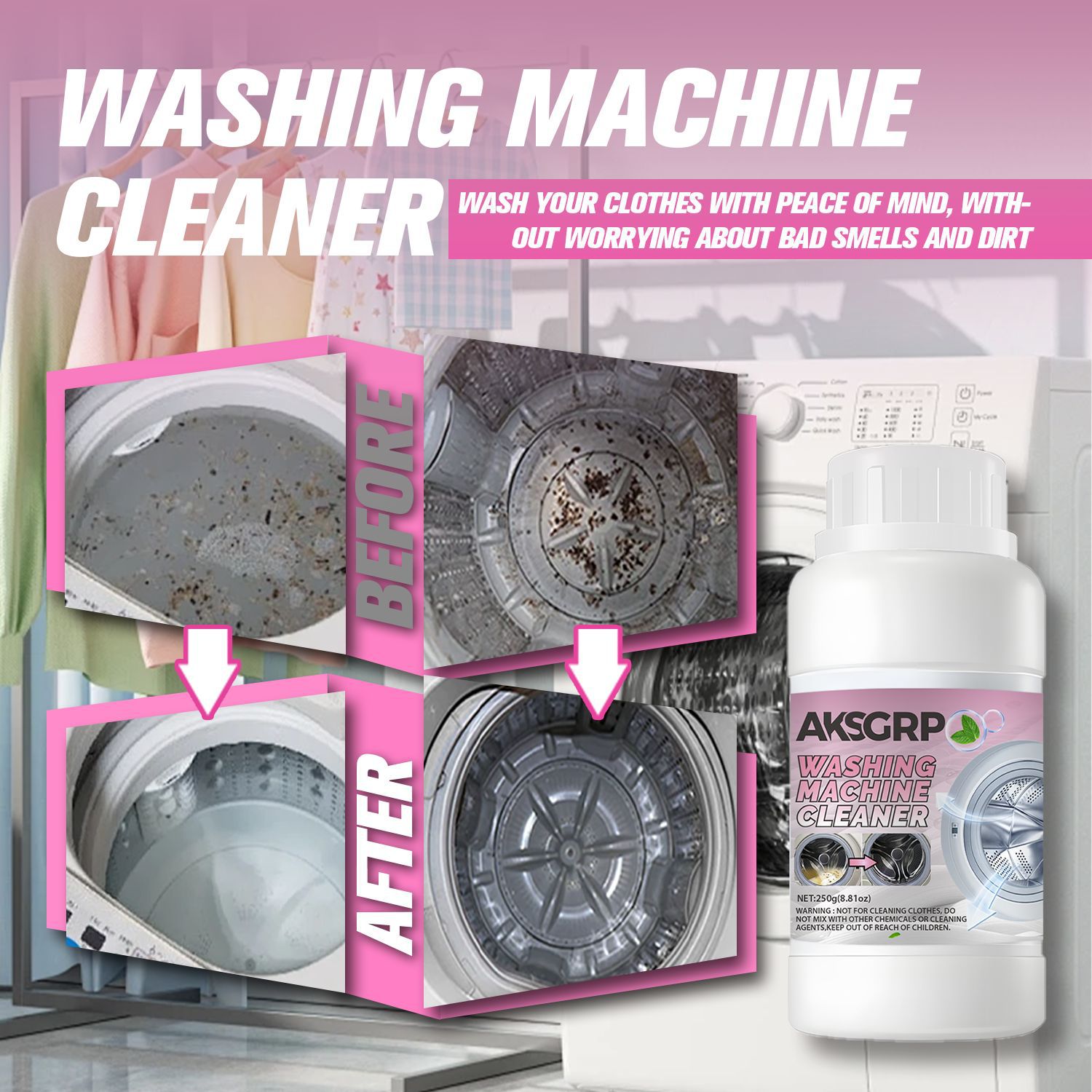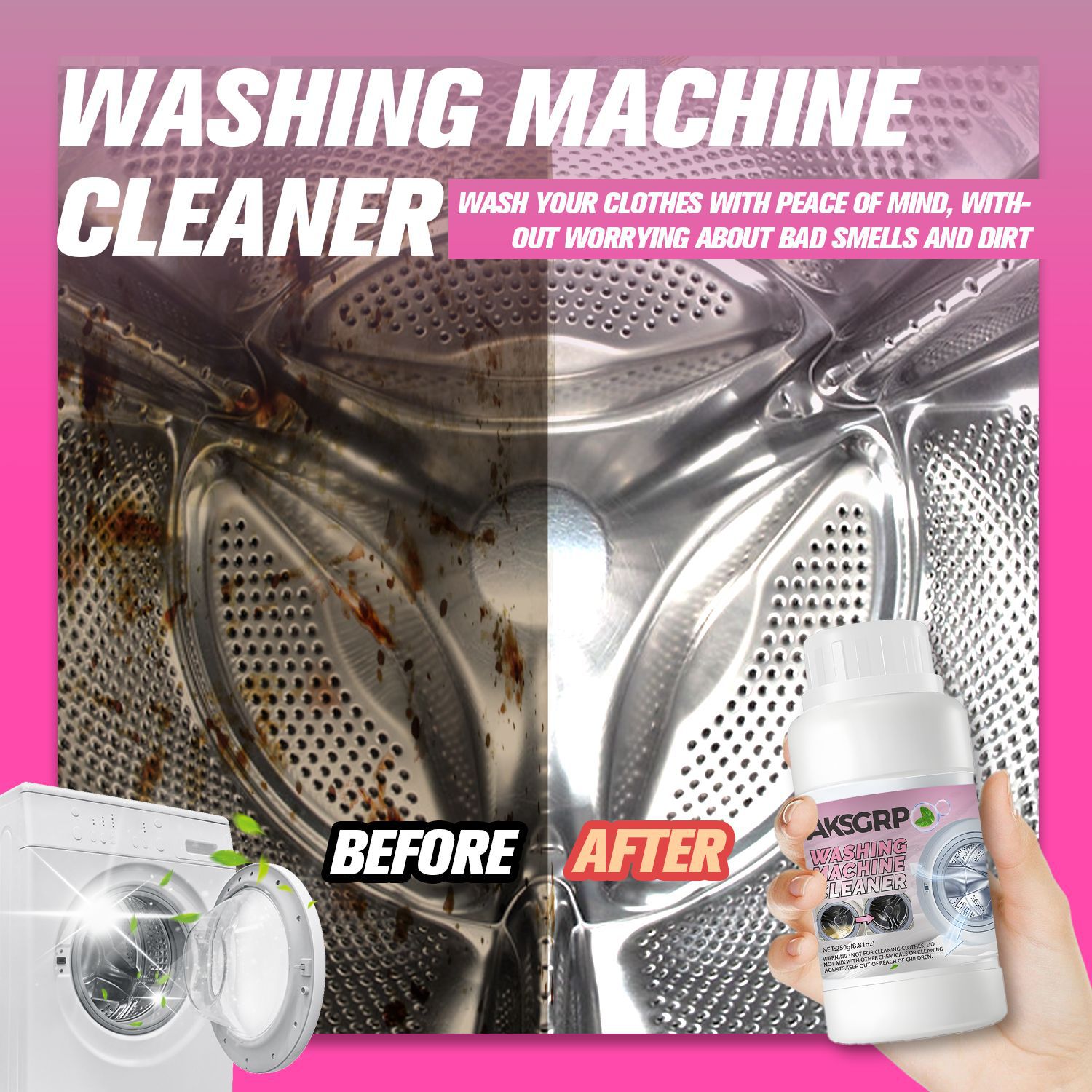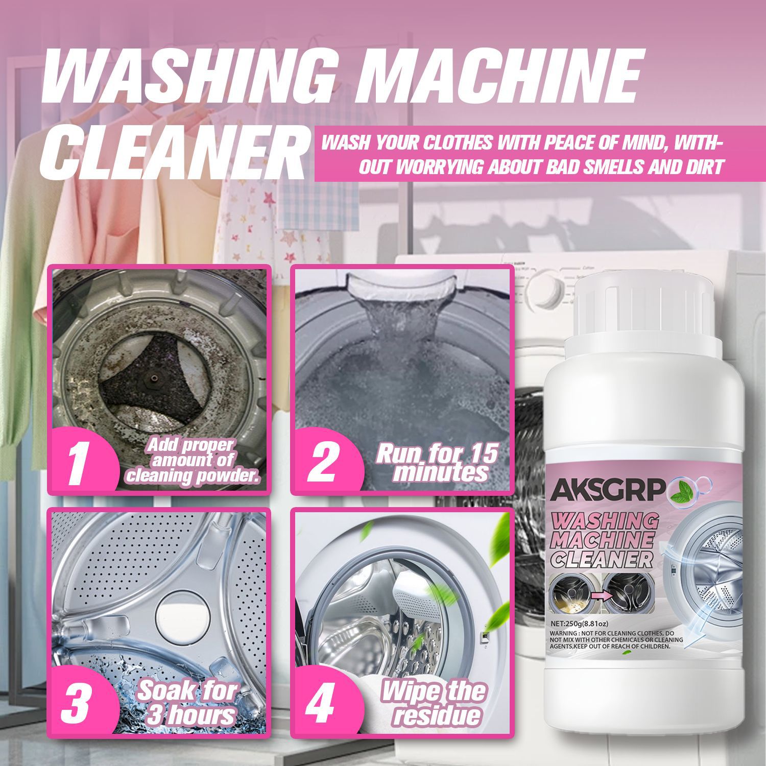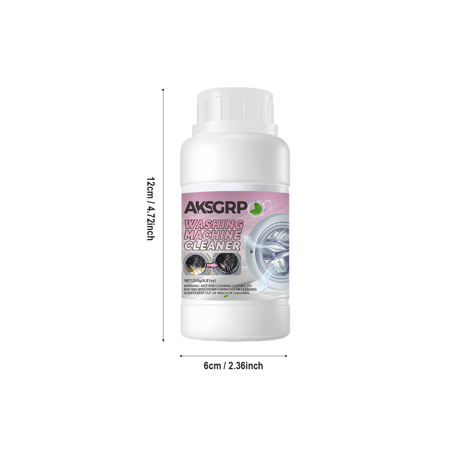 A product from the AKSGRP Home Appliance Cleaning Series, with a net weight of 250g (8.81oz). Product size is 6×12cm, packaging size is 5.5×18.8cm. Core functions: powerful descaling and disinfecting, removing accumulated dirt and odors in the washing machine to solve the problem of unclean clothes. Suitable for both impeller and drum washing machines. 4-step use: add proper amount of powder, run for 15 minutes, soak for 3 hours, then wipe residues. Keep out of reach of children.