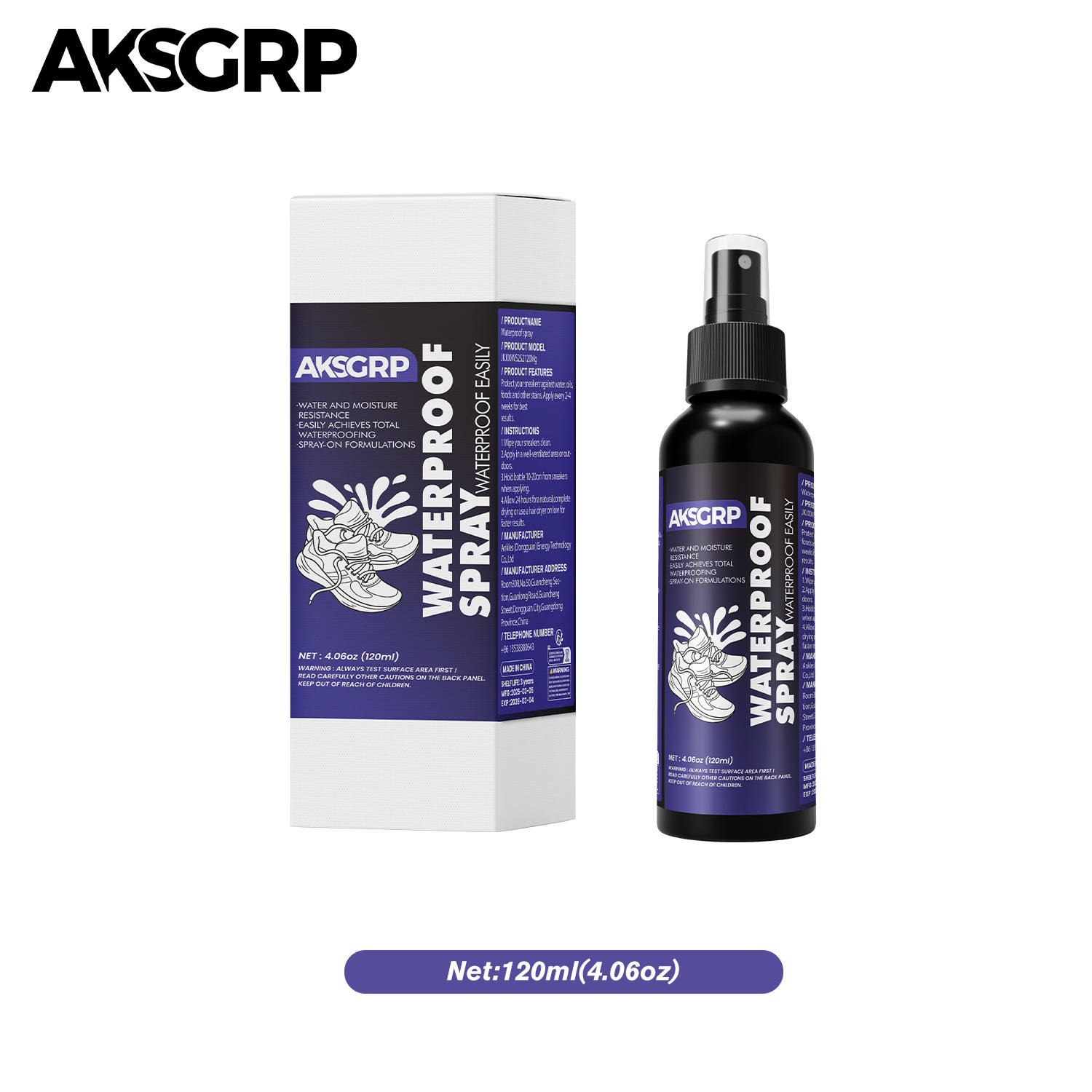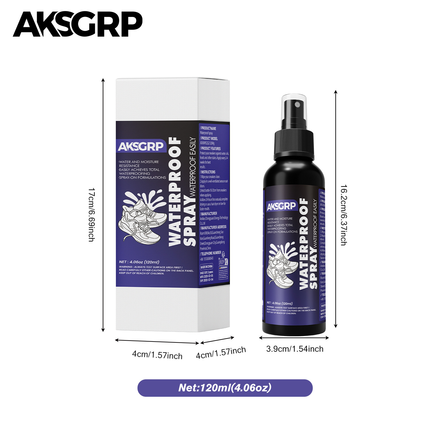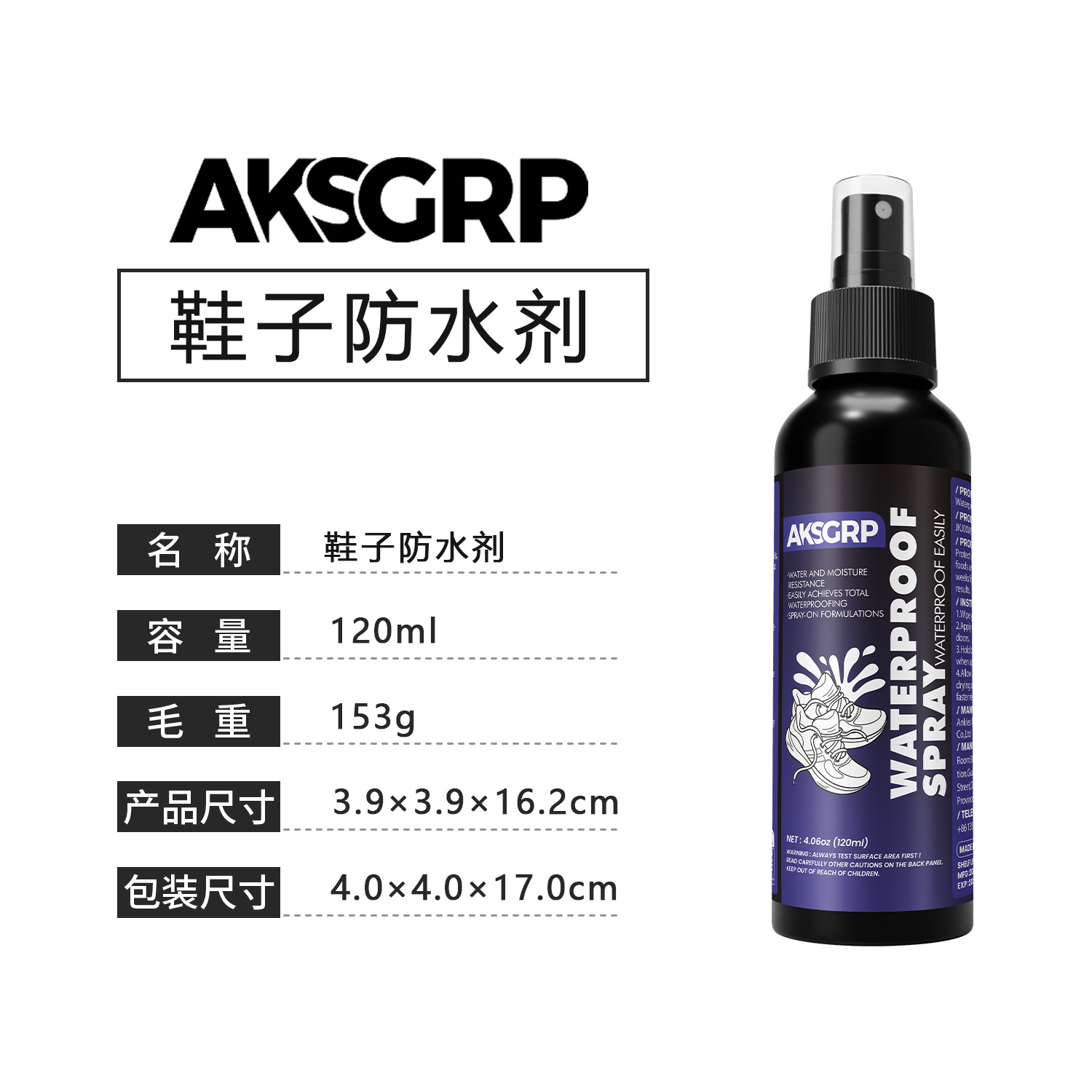 A product from the AKSGRP Shoe Care Series, it has a capacity of 120ml (4.06oz) and a gross weight of 153g. The product dimensions are 3.9×3.9×16.2cm, and the packaging dimensions are 4.0×4.0×17.0cm, made in China. Using nano-technology and a spray-on formula, it can form a protective layer on the surface of footwear to achieve triple protection against water, oil and stains, effectively reducing stain adhesion. Before use, clean the surface of the footwear and spray evenly with the nozzle 10-20cm away from the shoe in a ventilated area. It is suitable for various footwear such as white shoes, sports shoes, knitted shoes, casual shoes, canvas shoes and leather shoes.
