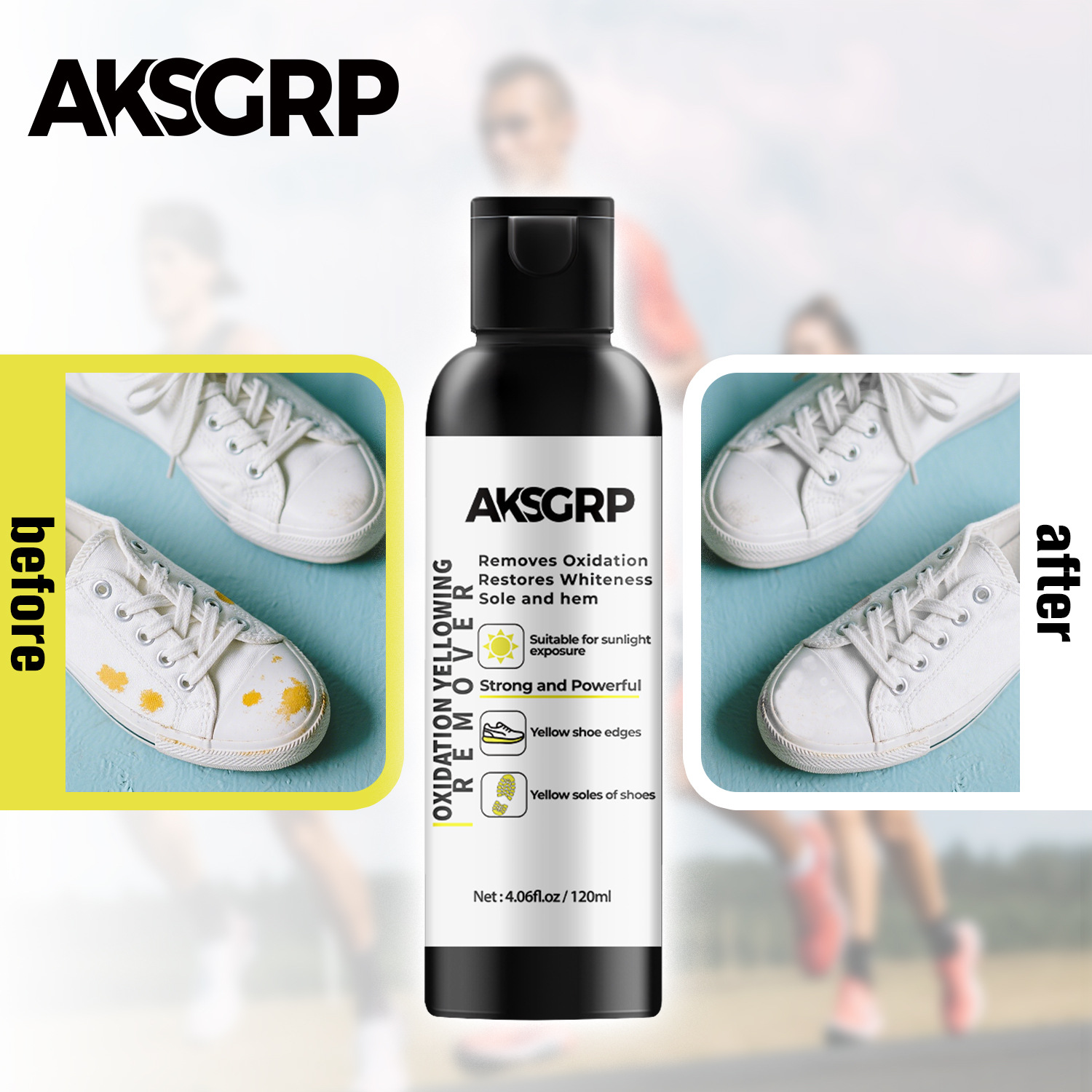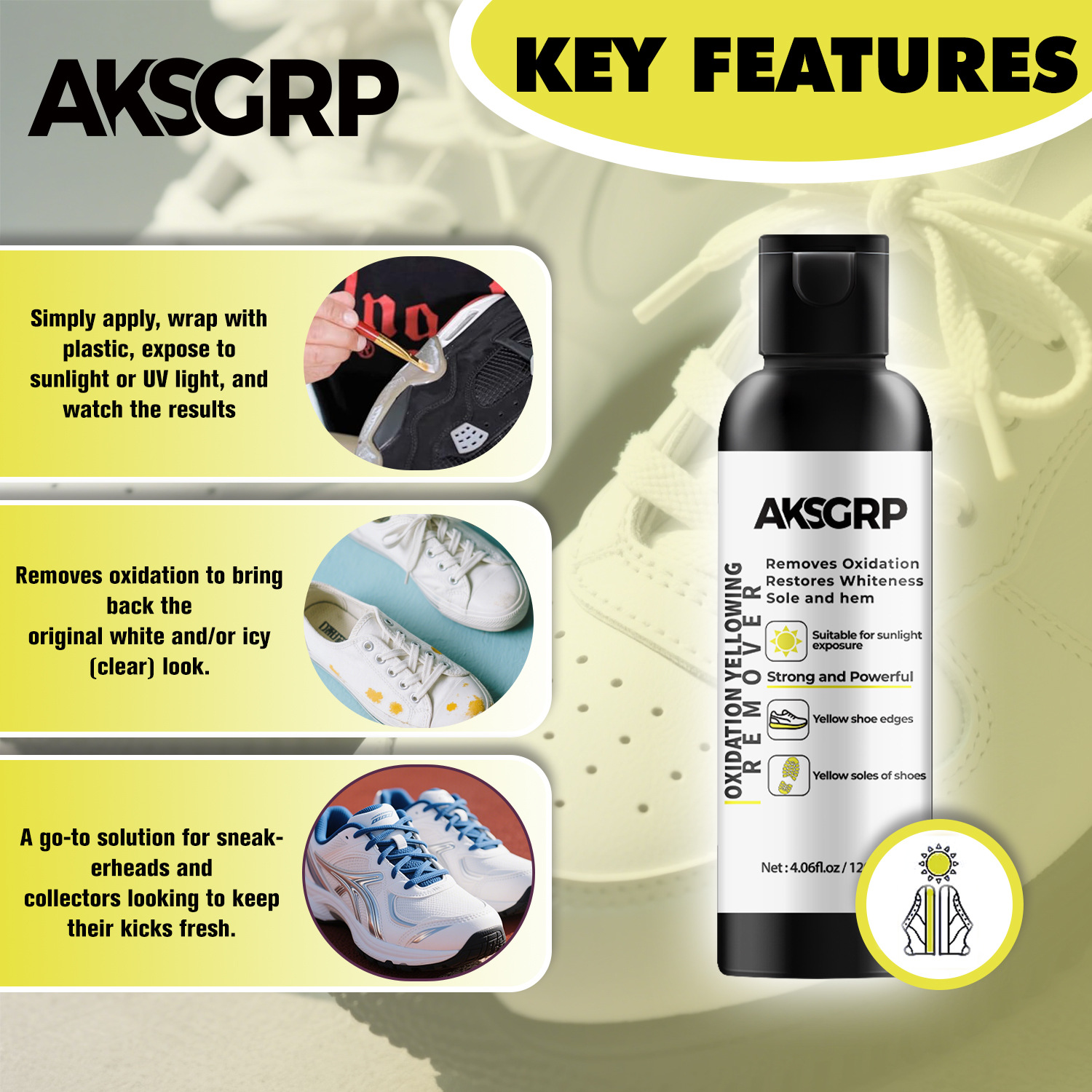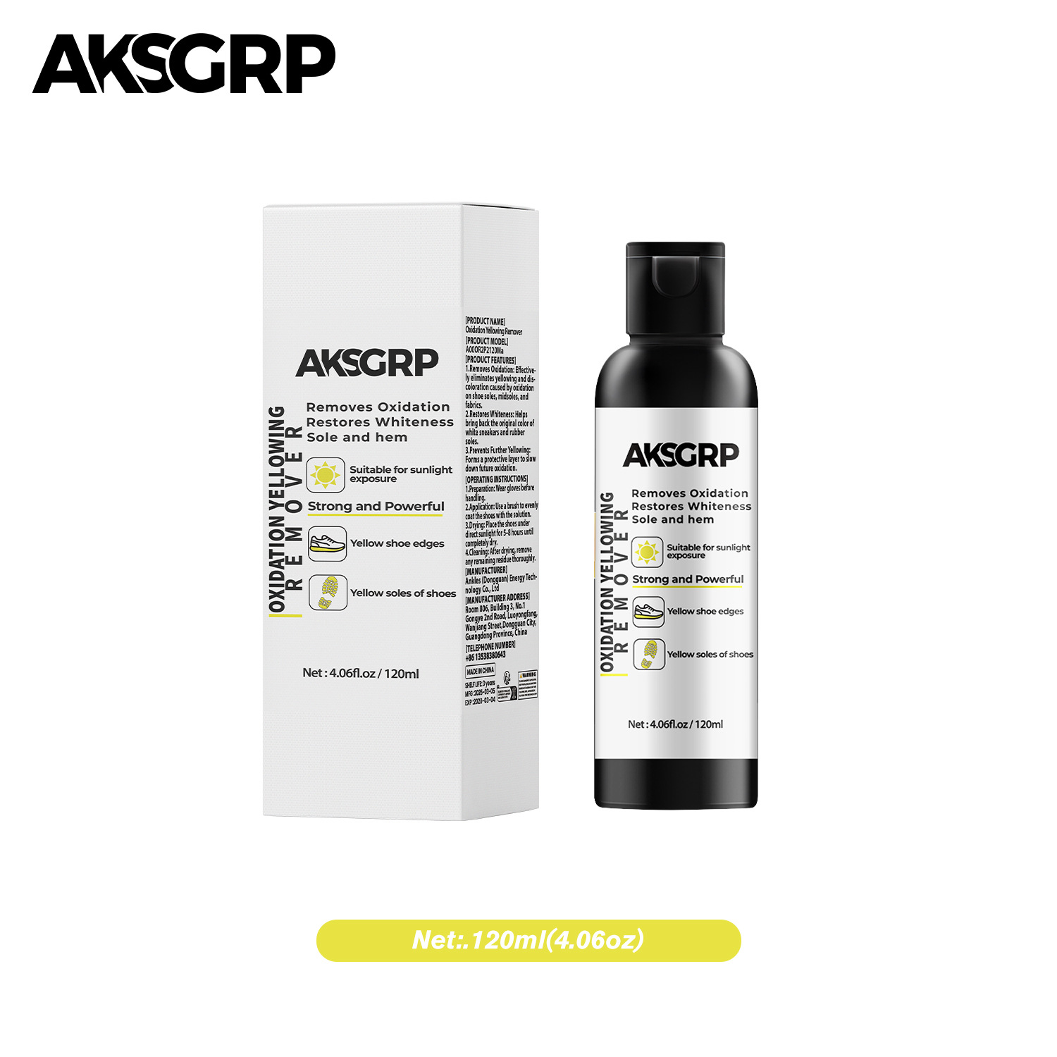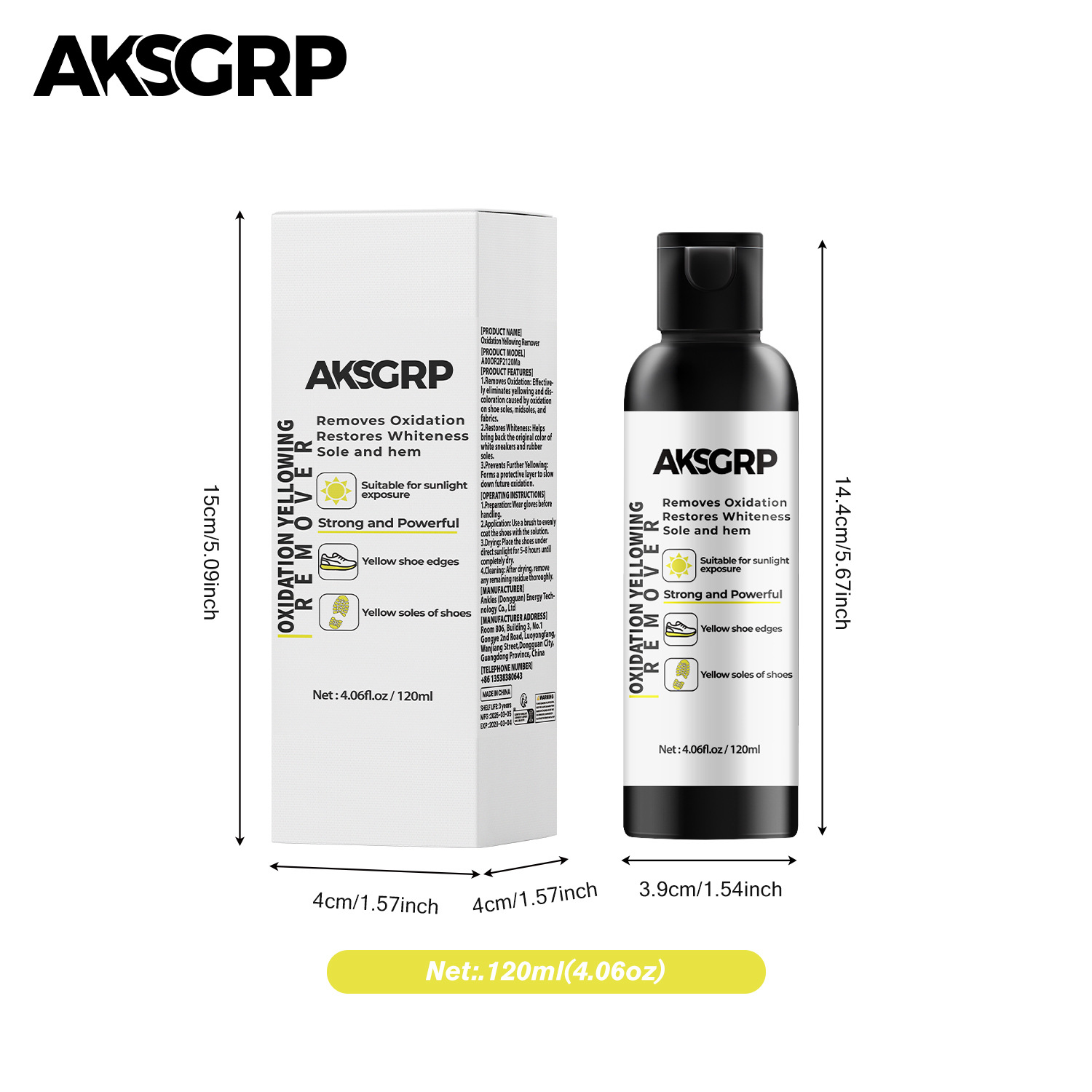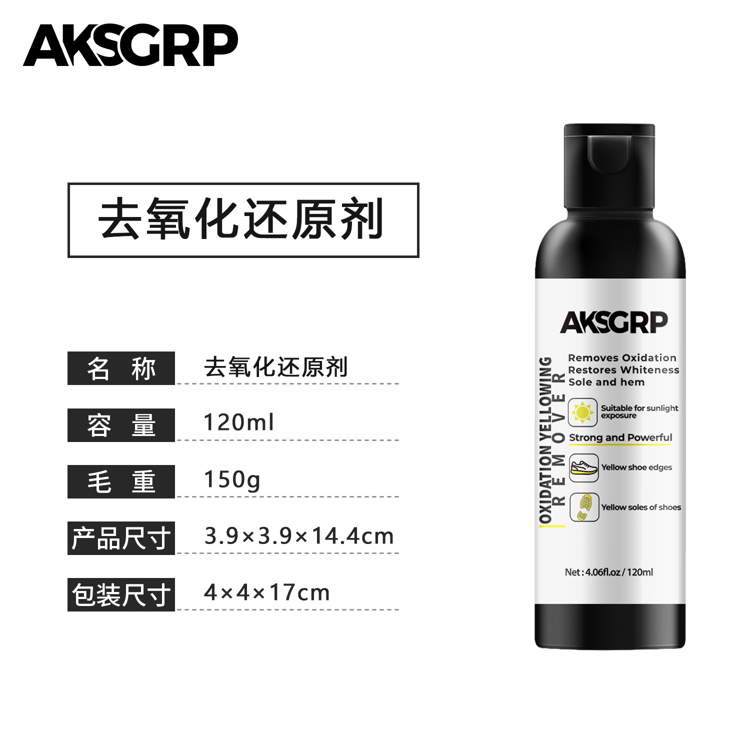 A product from the AKSGRP Shoe Care Series, it has a capacity of 120ml (4.06oz) and a gross weight of 150g. The product dimensions are 3.9×3.9×14.4cm, and the packaging dimensions are 4×4×17cm, made in China. Focusing on deoxidation and whitening effects, it can effectively remove yellowing marks on the soles and edges of white shoes, and fix discoloration. It is suitable for ordinary white soles and transparent “ice” soles. When using, apply it, wrap with plastic film, and expose to sunlight or UV light to take effect. It is a practical tool for sneakerheads and collectors to maintain the clean appearance of shoes, and also provides comprehensive care for shoes to bring a comfortable wearing experience.