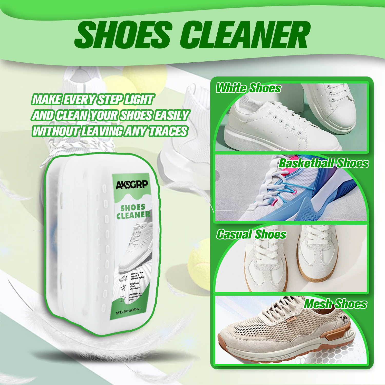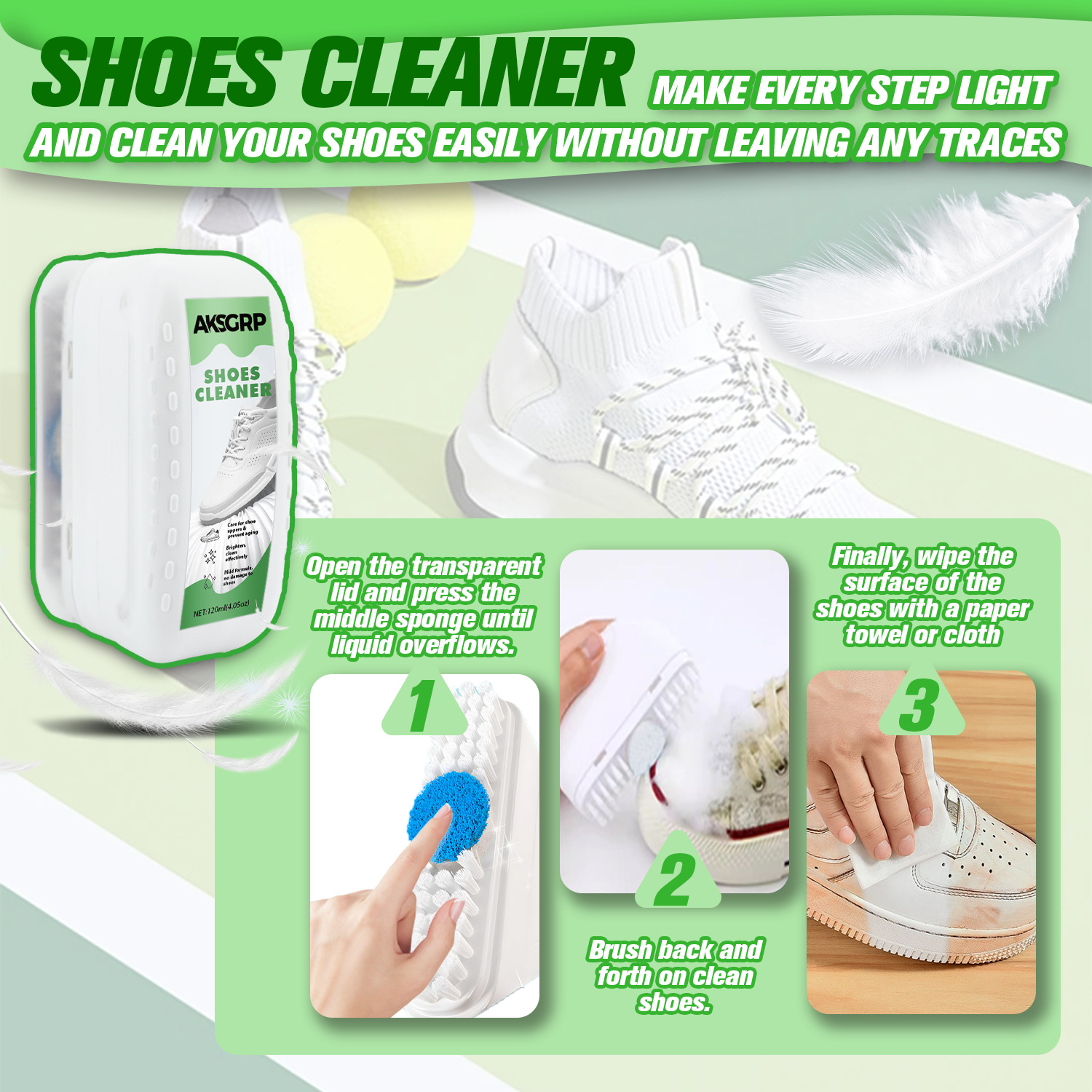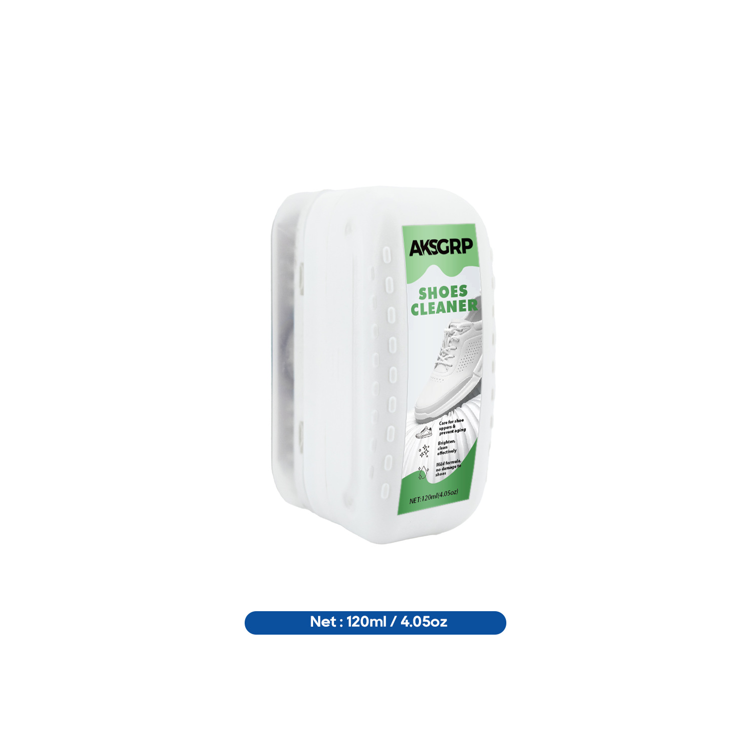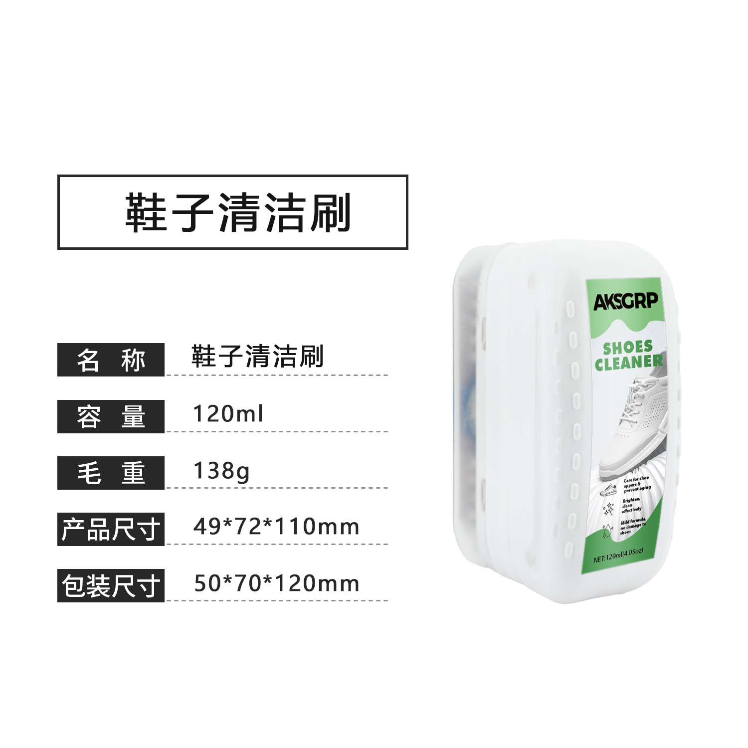 A product from the AKSGRP Shoe Care Series, it contains 120ml (4.05oz) of cleaning foam with a gross weight of 138g. The cleaning brush dimensions are 49×72×110mm. It uses a mild formula and is paired with a dedicated dry brush for sole cleaning, focusing on no-wash cleaning and stain removal. It is suitable for white sneakers, basketball shoes, casual shoes and other footwear. When using, open the transparent cover, press the middle sponge until the liquid overflows, scrub back and forth on the stained area, then wipe with a paper towel or cloth—no water washing required. It leaves no residue after cleaning and can easily restore shoes to a clean state.